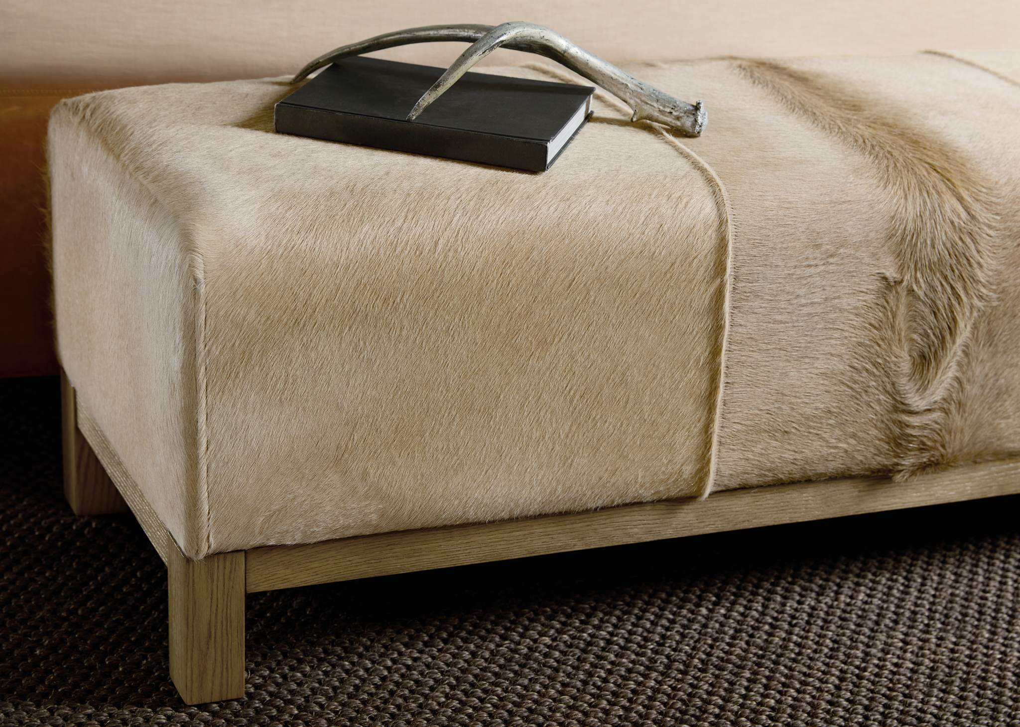 With a tactile hair-on-hide leather seat and warm oak wood base, the Mélange Holy Cow Bench brings organic sophistication to any room. Use at the end of a bed or in a hallway to introduce rich material contrast.