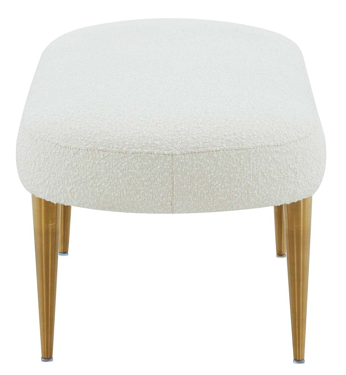 Add a touch of elegant glamour to any modern decor with this ivory boucle oval bench. Its retro gold legs and chic curves add the perfect amount of contemporary flair to any living room or bedroom.