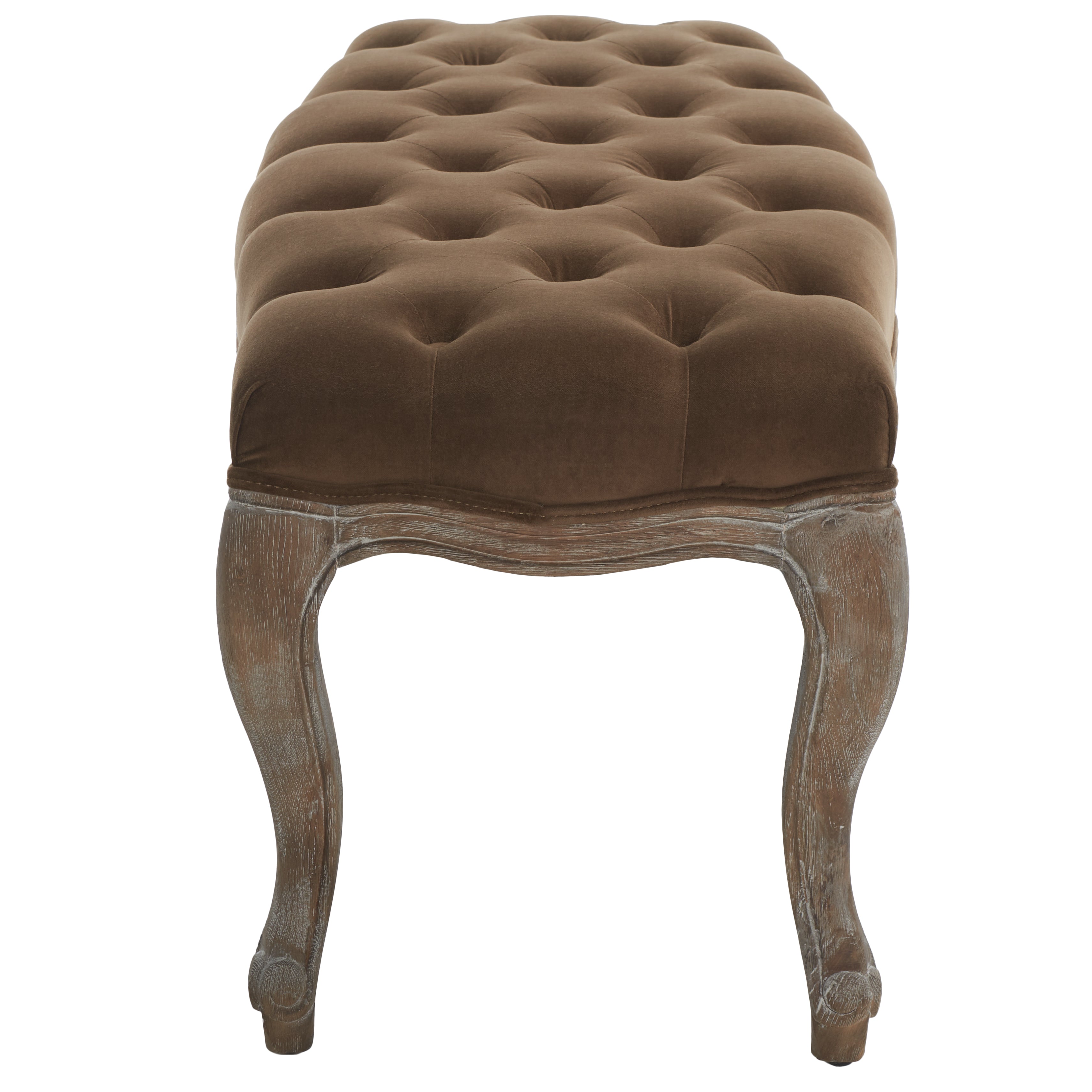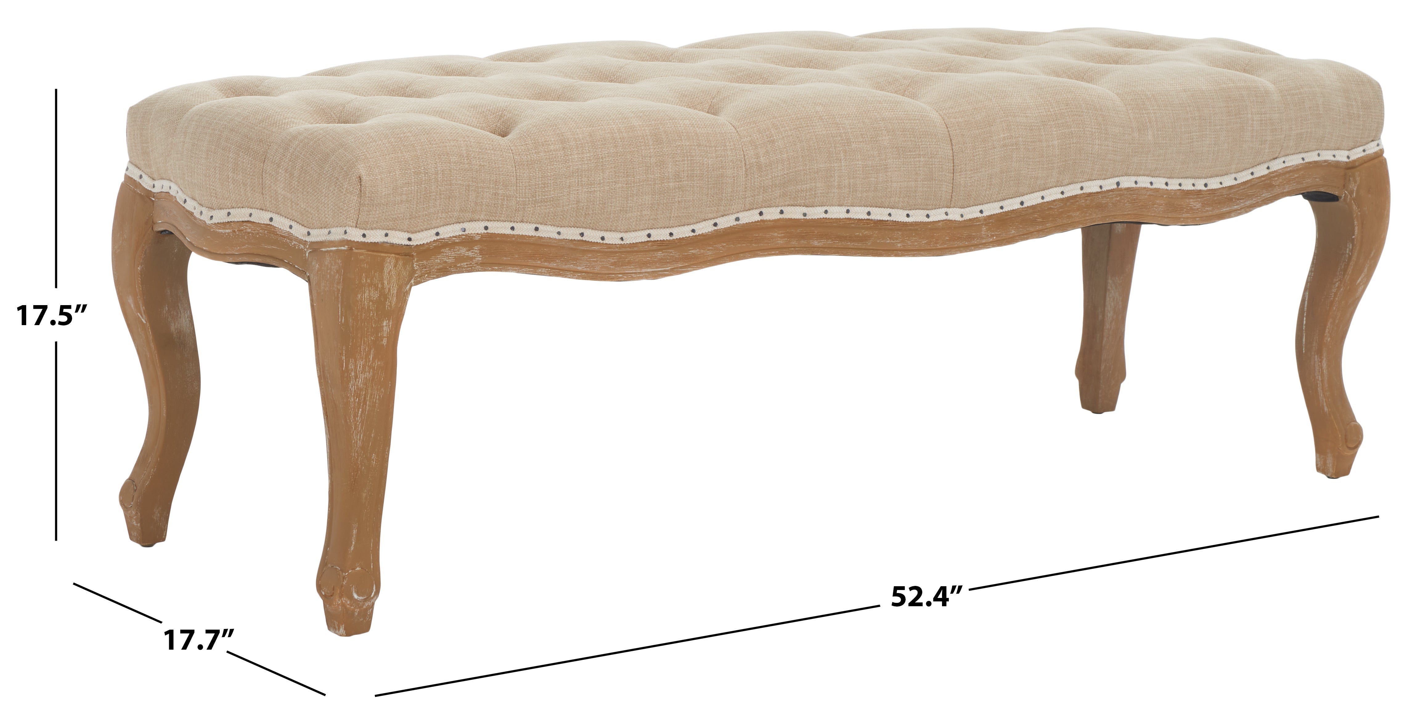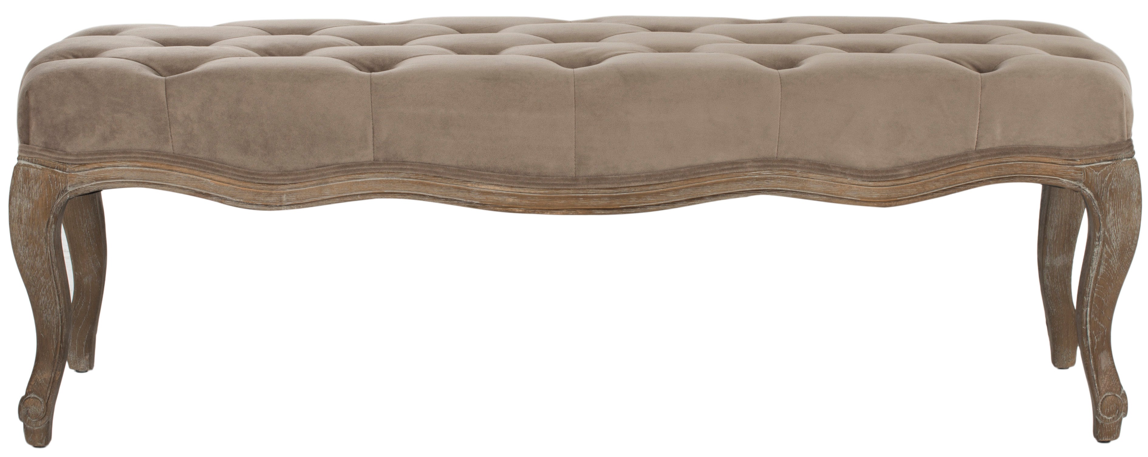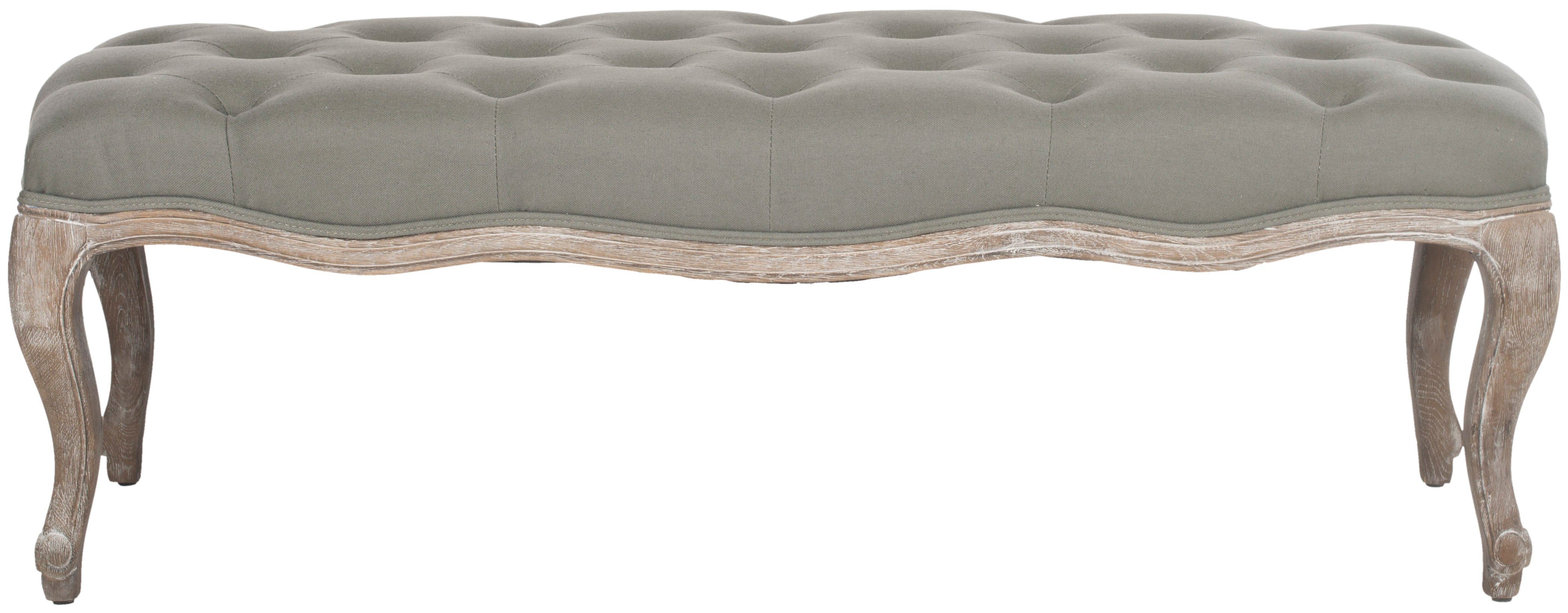 Exuding Country French charm, the Ramsey bench recreates the look of a family heirloom with beautifully carved pickled oak frame and timeless cabriole legs. Covered in linen or velour with flat black nail head detailing on upholstery tape, Ramsey makes a welcoming statement in an entry hall and inviting one in bedroom or living room.