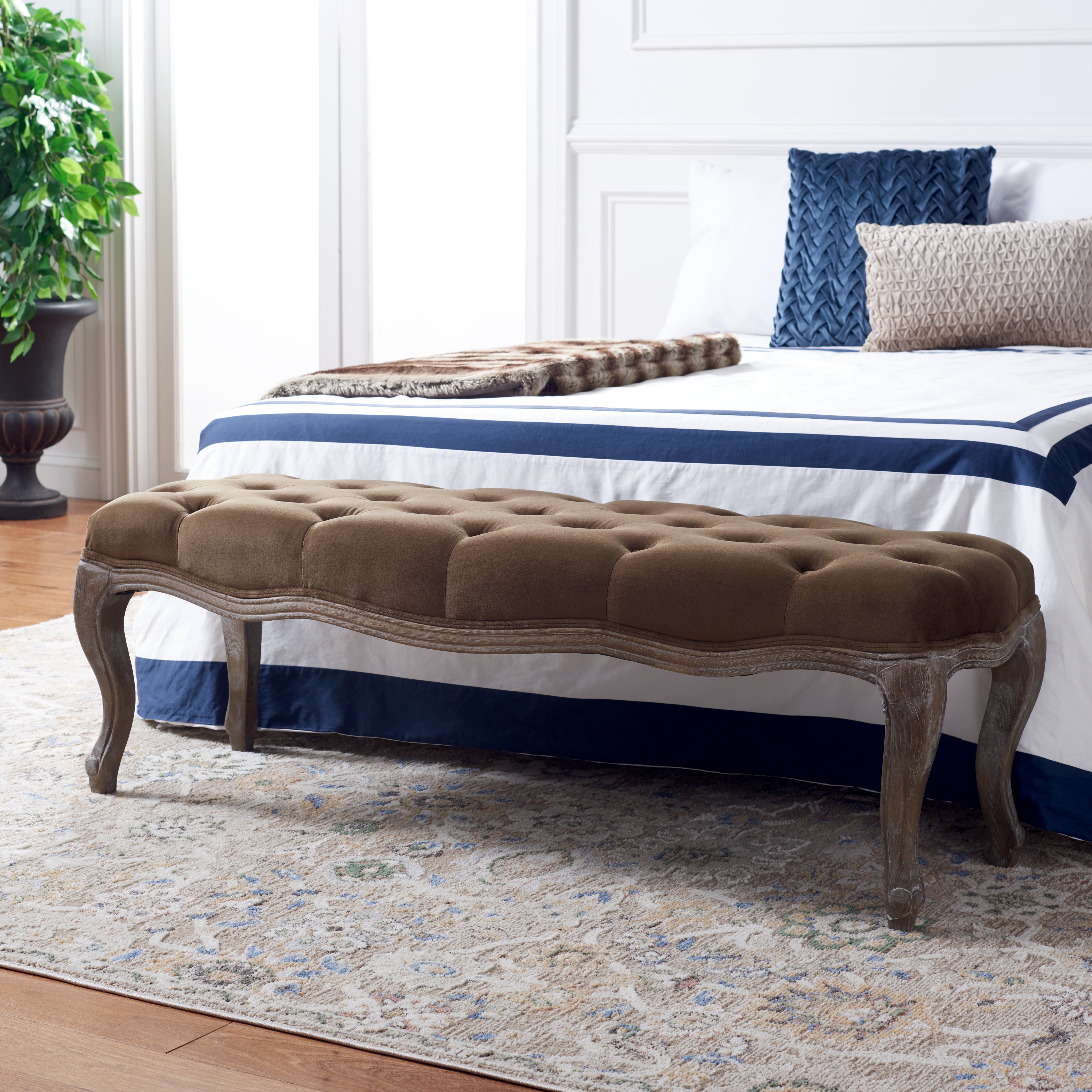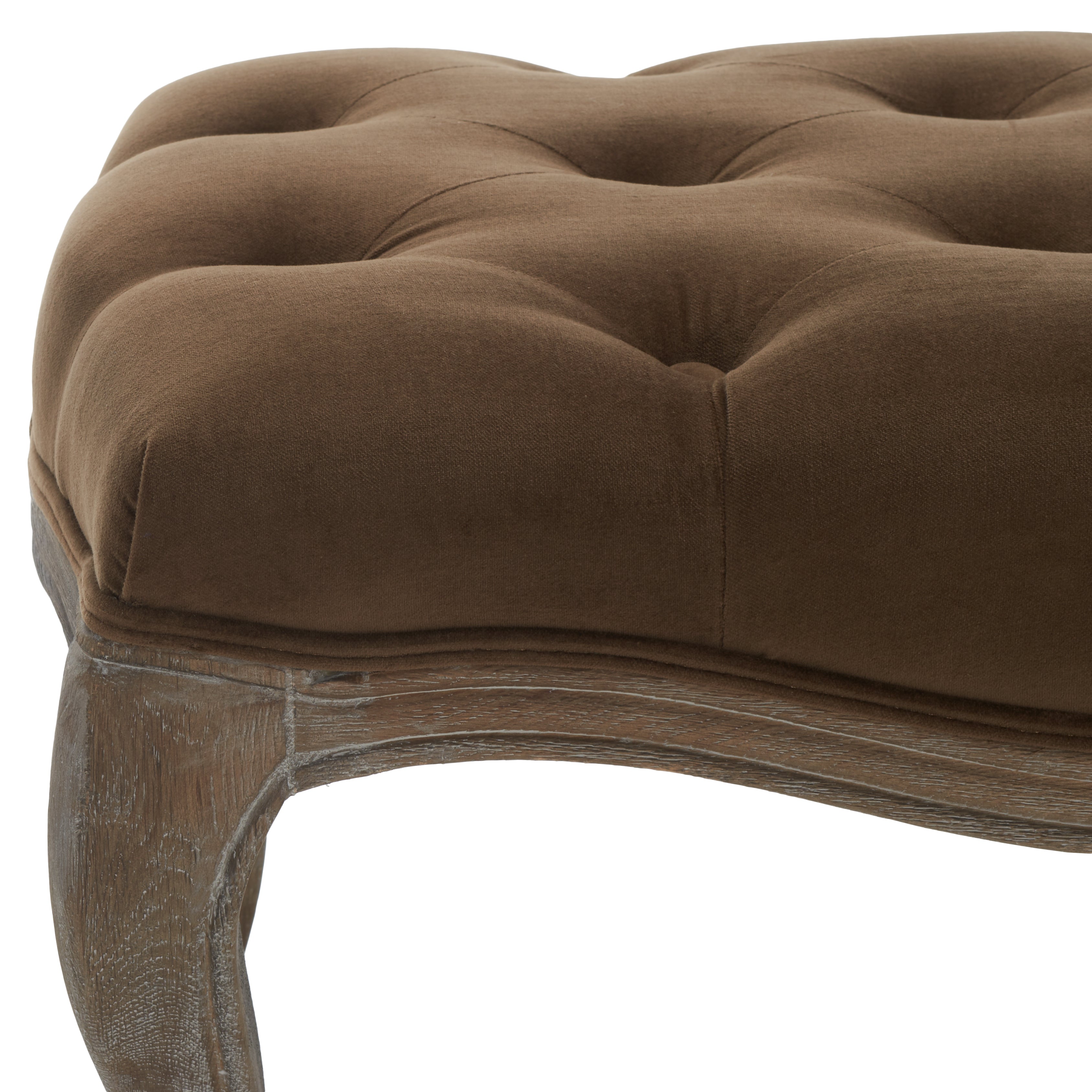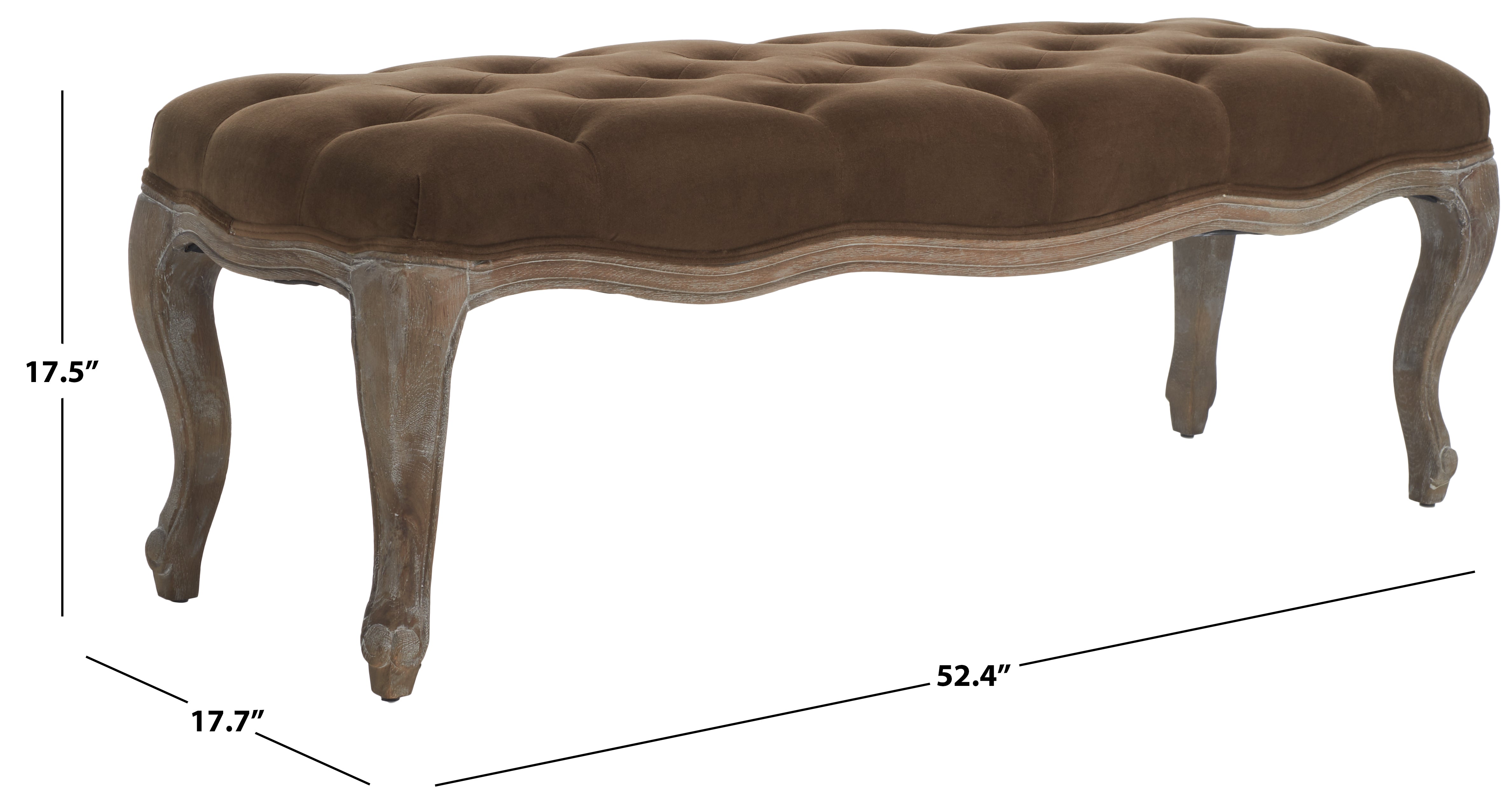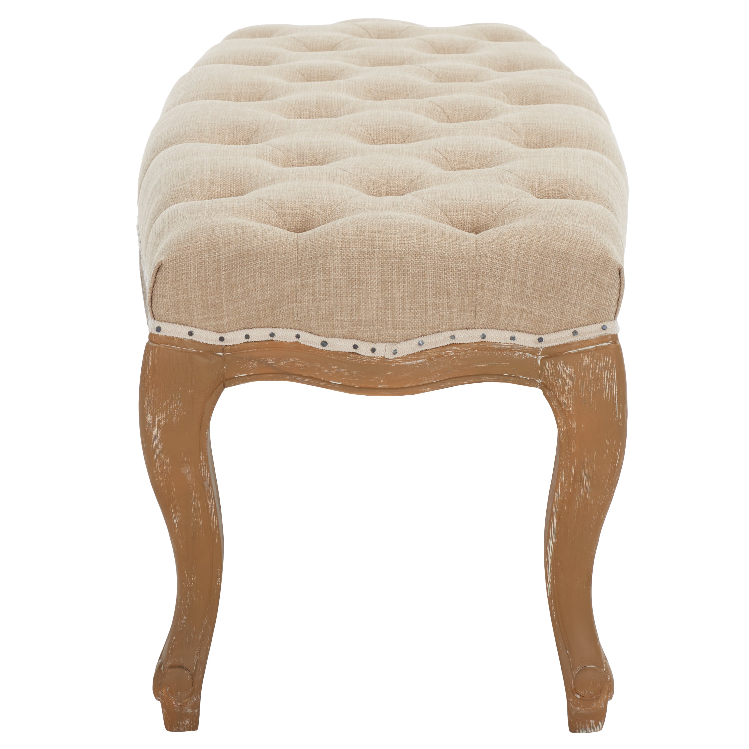 Exuding Country French charm, the Ramsey bench recreates the look of a family heirloom with beautifully carved pickled oak frame and timeless cabriole legs. Covered in linen or velour with flat black nail head detailing on upholstery tape, Ramsey makes a welcoming statement in an entry hall and inviting one in bedroom or living room.