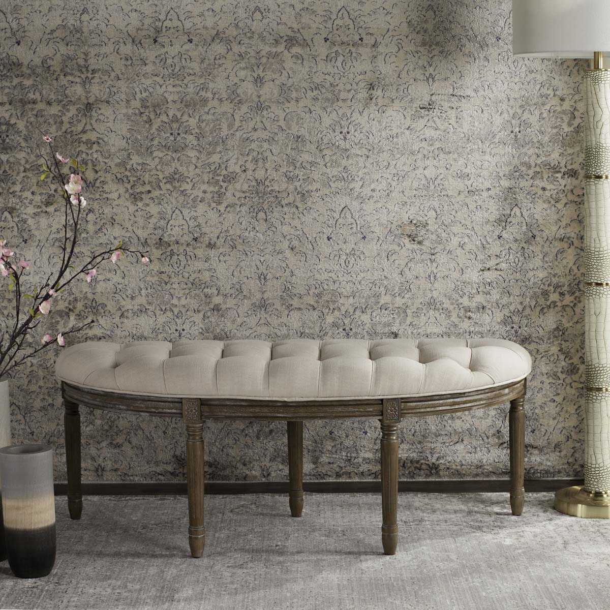 Alive with the timeless elegance of the finest French furnishings, this semicircle bench was inspired by pieces in Paris??decorative arts museum. Finely crafted natural wood details are paired with classic beige upholstery to create an instant focal point.