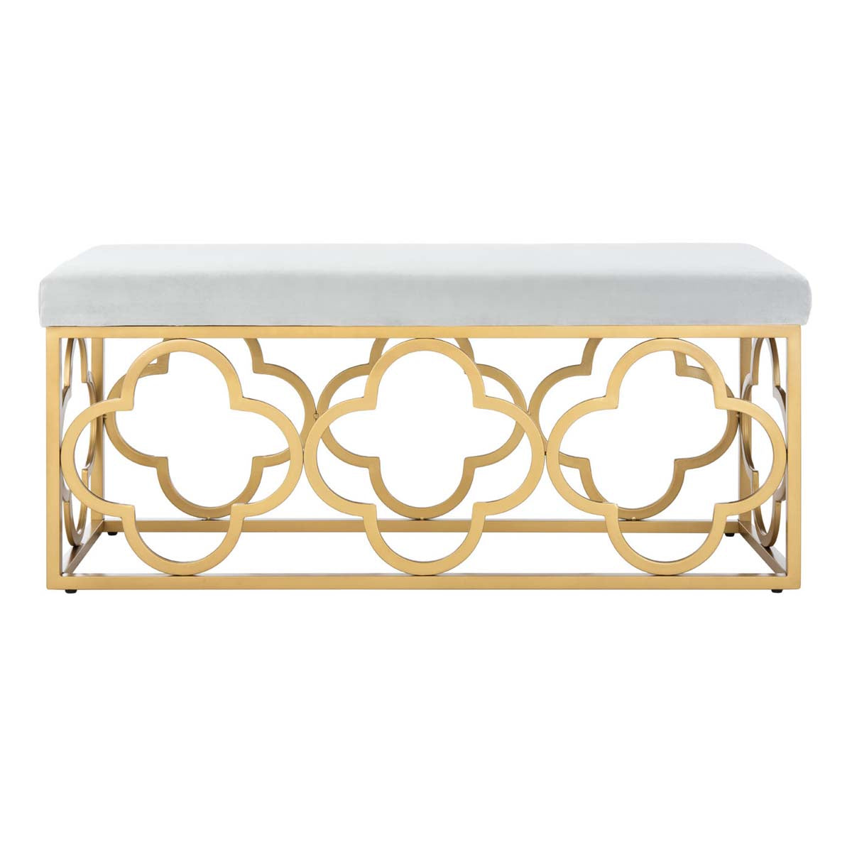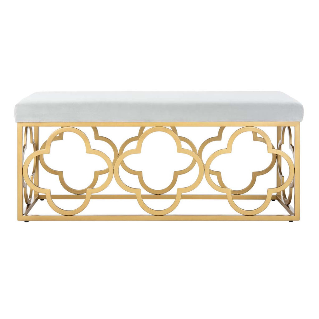 Traditional class meets modern glamour in this fabulous Fleur Bench. Fleur?? open quatrefoil design brings airy elegance the entryway, living room, or master suite. Shimmering in a gold liquid finish and grey velvet seat, Fleur seamlessly enriches the color scheme of any decor.
