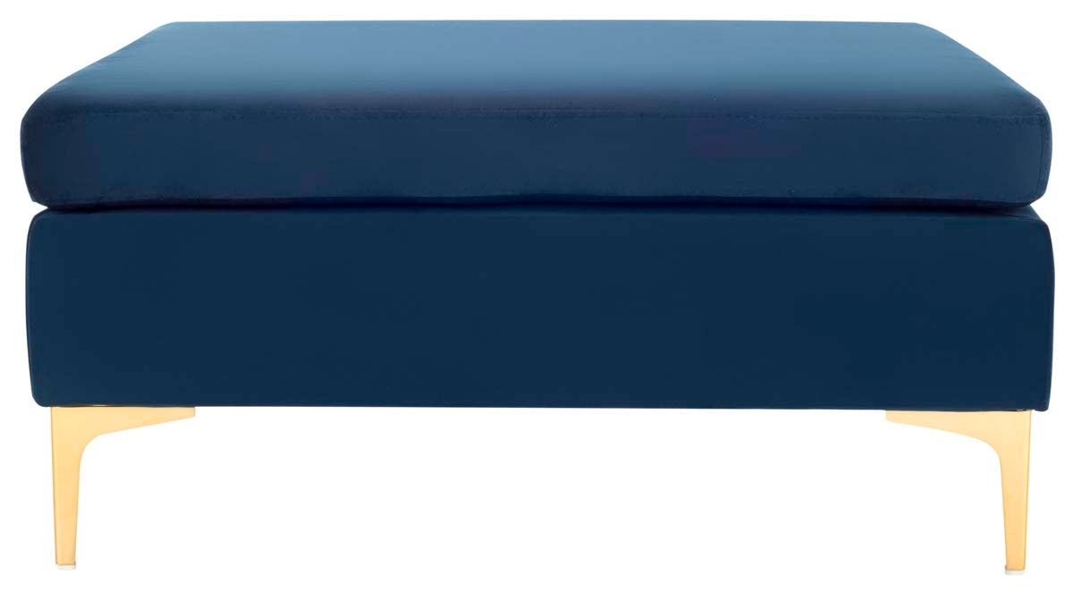 Give any living room a bold pop of color with this Giovanna Ottoman. Soft and luxurious, Giovanna's plush navy velvet upholstery maintains clean minimalist lines for sleek style. Designers love the radiant brass finish on its svelte metal legs.