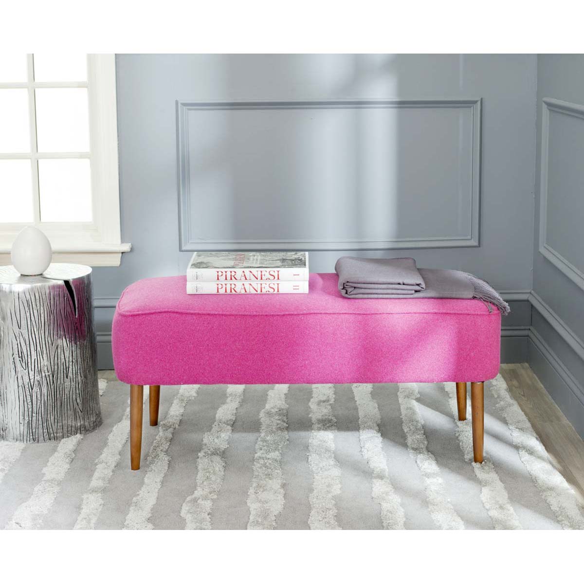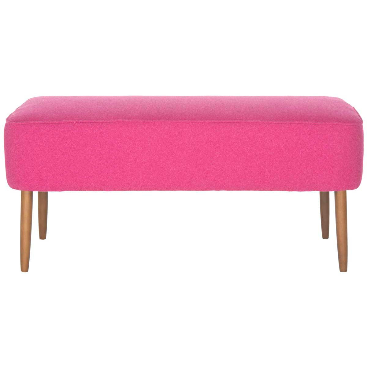Recapturing the aesthetic of the 50's, the Levi Bench boasts birch wood spindle legs in a natural oak finish. Straight lines are softened by a wool poly fabric in bright berry, enriching room decor with a fabulous burst of color.