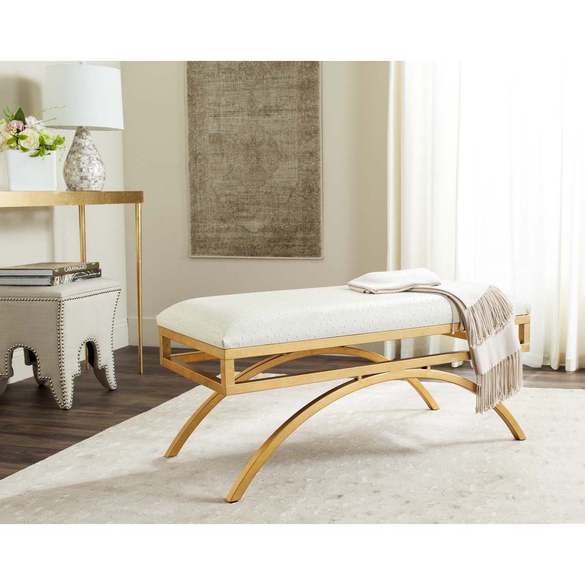 This radiant arc bench was inspired by the iconic modern pieces of Italian designer Gio Ponti. Sleek and sophisticated, its tailored upholstery complements its warm gold finish. Ideal for extra seating, a glass of wine, or even as a bench in the boudoir.