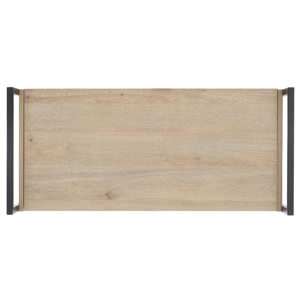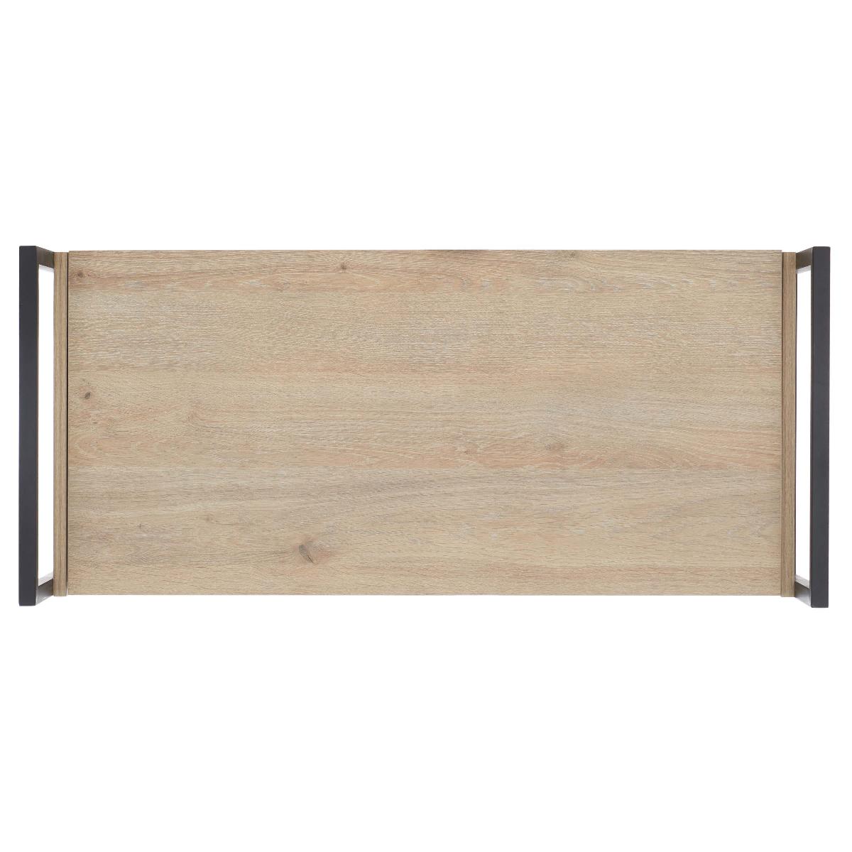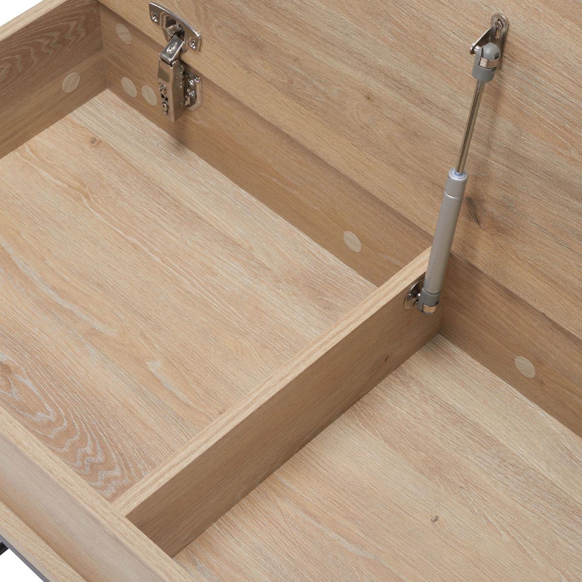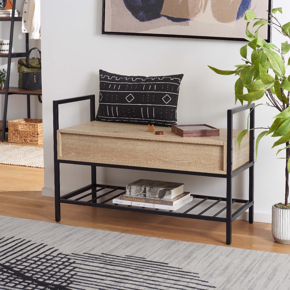 Elevate any corner with the charm and convenience of our Rhonwen storage bench. Our modern and clean-lined bench is supported by a black metallic frame. It is enriched with wooden grains in a graceful sand finish to harmonize with any setting. Our multitasker bench features a hinged seat to provide storage underneath and a wire rack for placing your shoes and magazines. It can serve as the perfect complement to your entryway or living room offering a convenient seat, hidden storage, and a place to dump all your go-to-essentials.