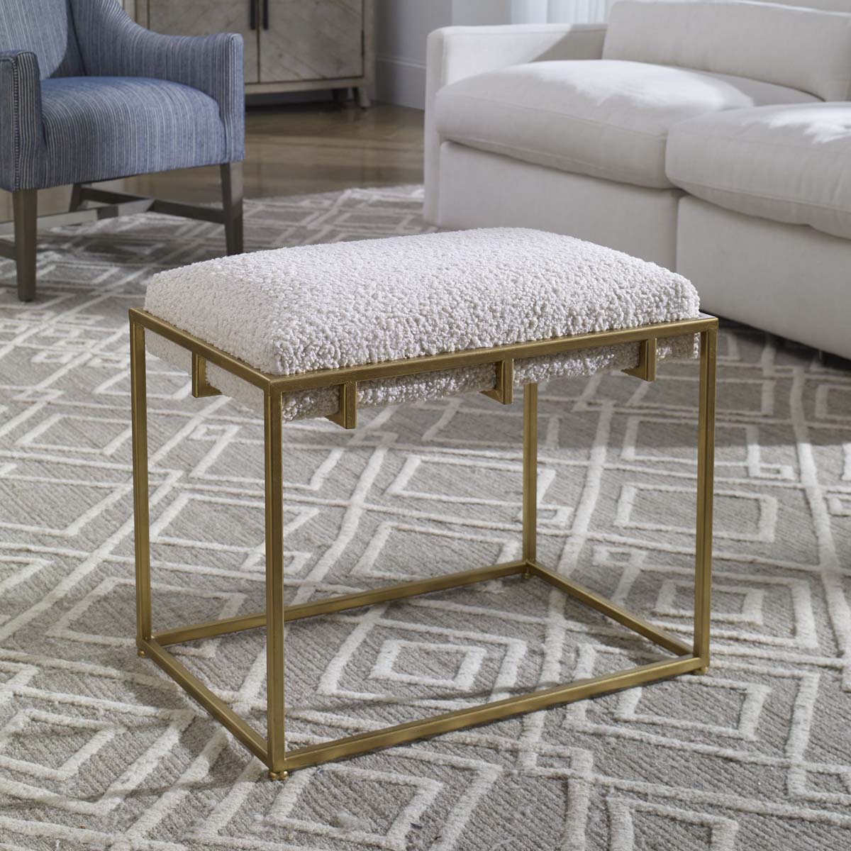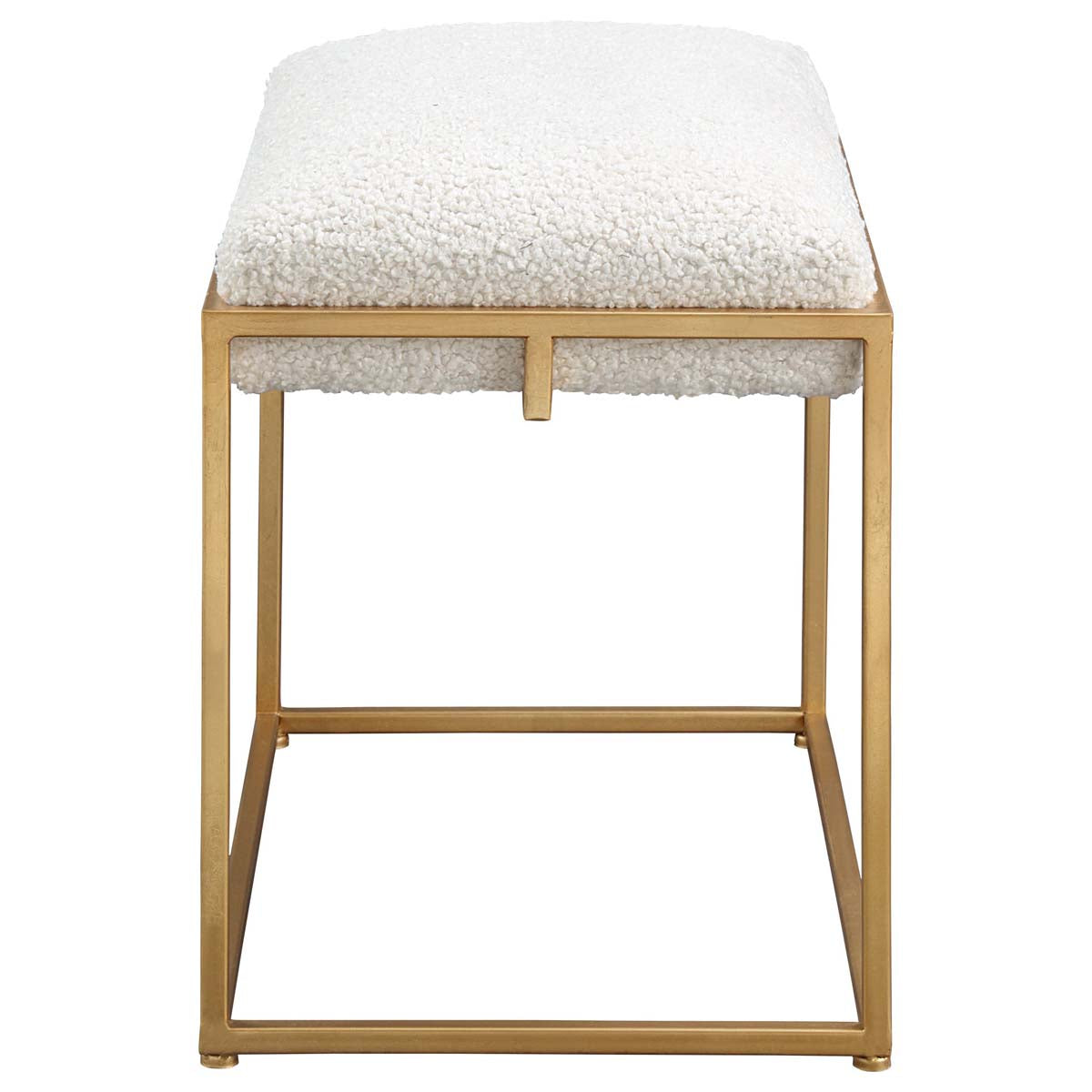 A Glamorous Accent, This Small Bench Features An Upscale Gold Leafed Iron Frame Paired With A Plush Upholstered Seat In A White Faux Shearling.