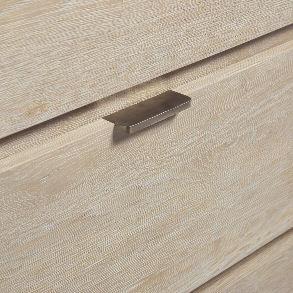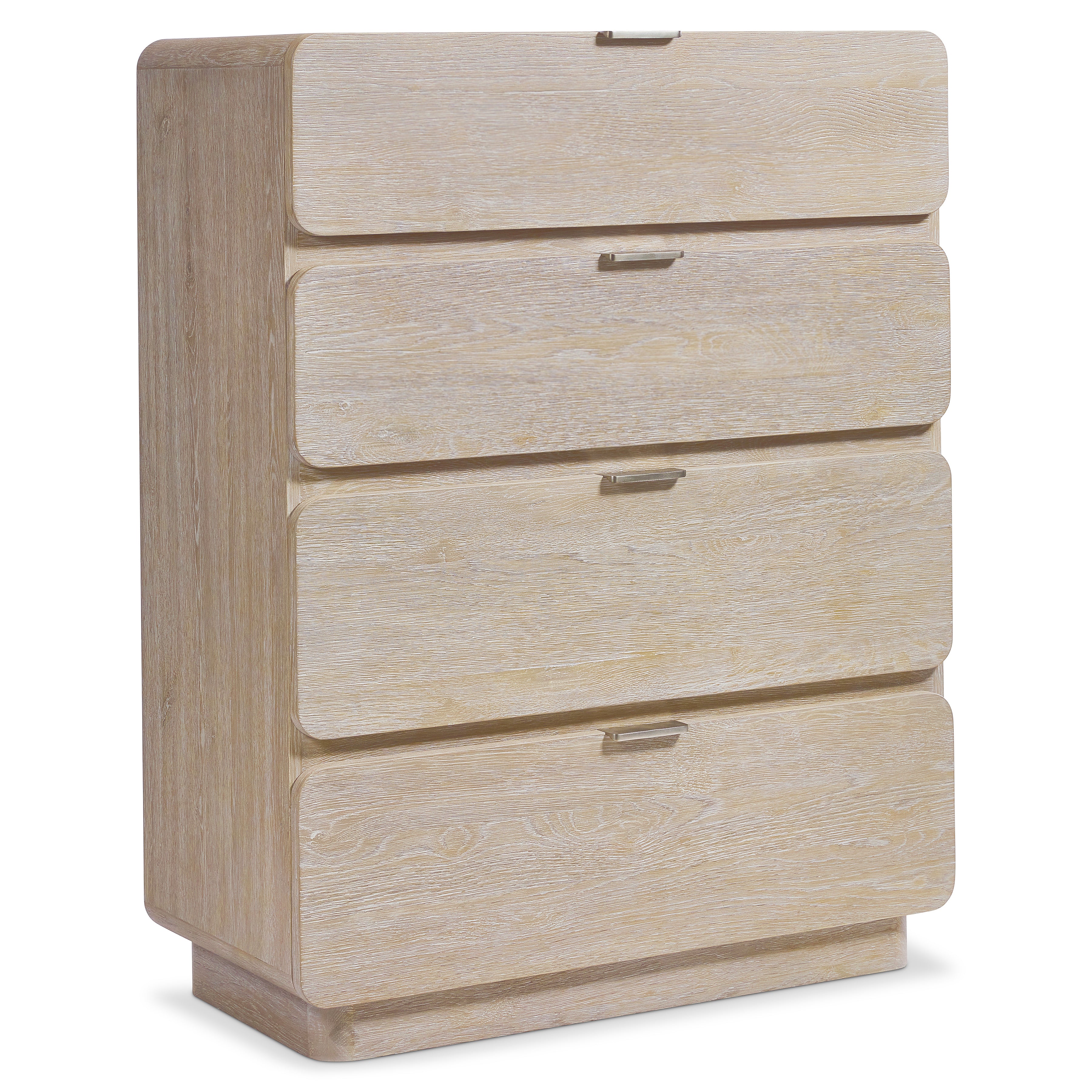 Elemental design gets a refined and modern update for the Antibes tall drawer chest. Softened corners and shapely drawer fronts have an organic simplicity with the rustic Roz finish. The case is supported with a plinth base and features four pull-to-open drawers with cast aluminum pulls.