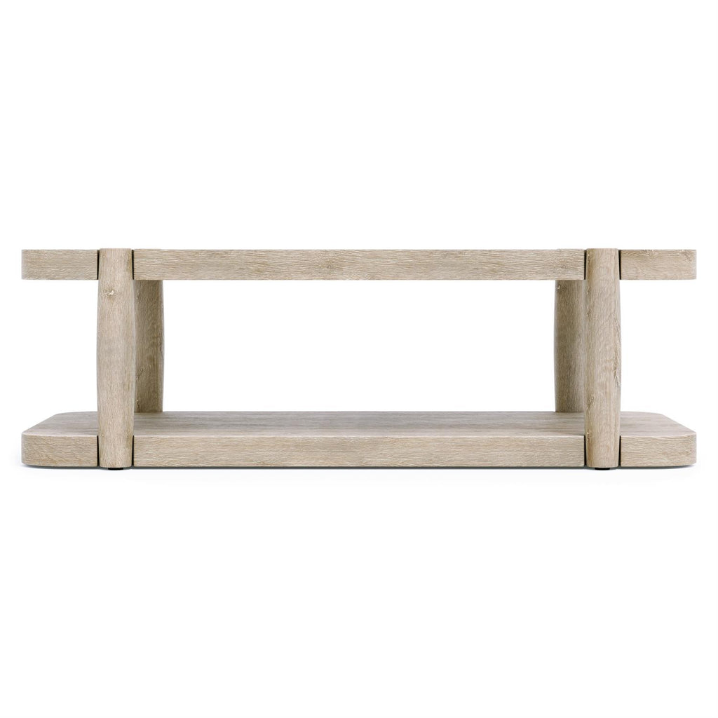 The Antibes cocktail table elevates a minimalist design with shapely tapered legs that intersect the top and lower shelf. It creates a simplistic but very modern style in a calming and warm Roz finish. The natural grains and textures of the wood are highlighted for an organic look.