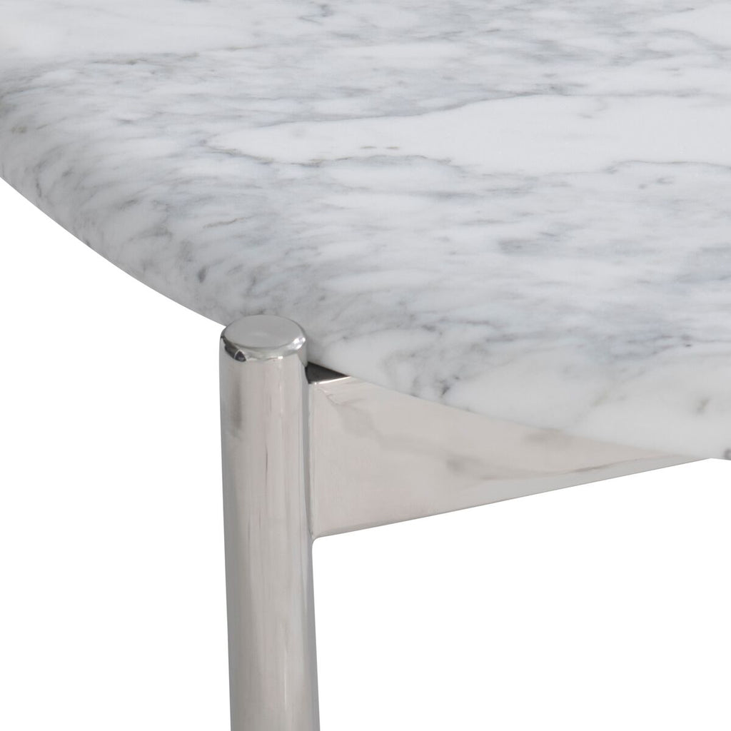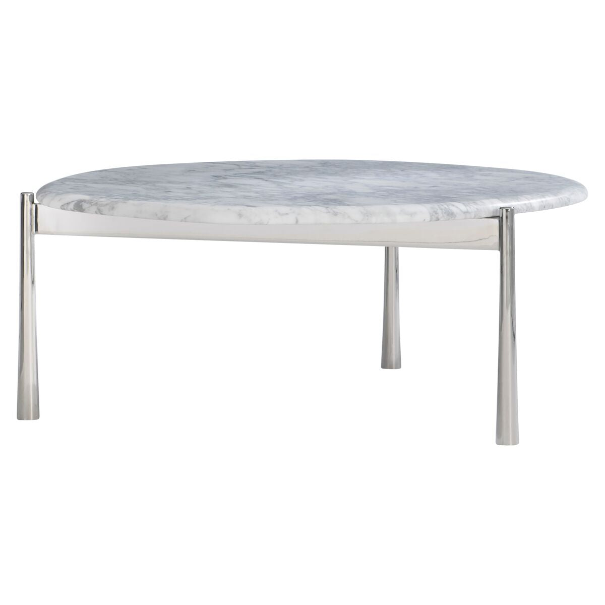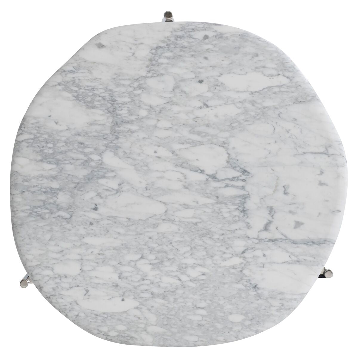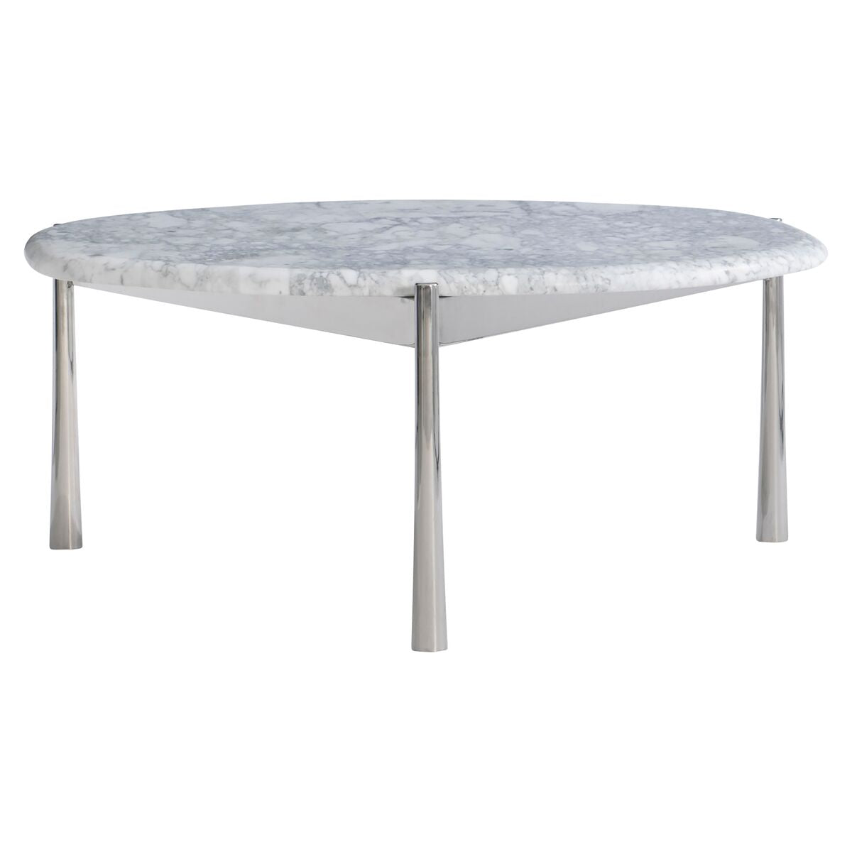 Cocktail Table With Round Irregularly Shaped Honed Arabescato Stone. Triangular Shaped Polished Stainless Steel Base With Three Legs That Taper Outward Al The Bottom. Adjustable Glides.