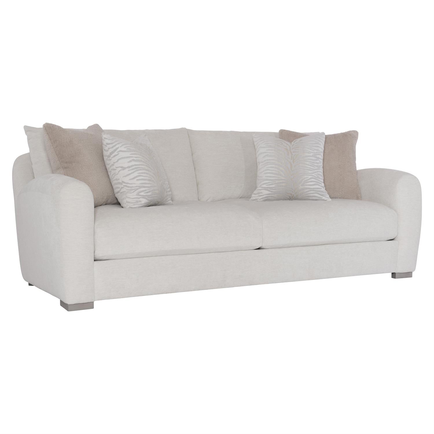The Asher sofa has a unique frame with high-loft curved arms and a shaped back. Comfort comes from fiber back pillows, as well as four Blendown throw pillows. The enticing shape and deep seat creates a luxuriously restful statement.