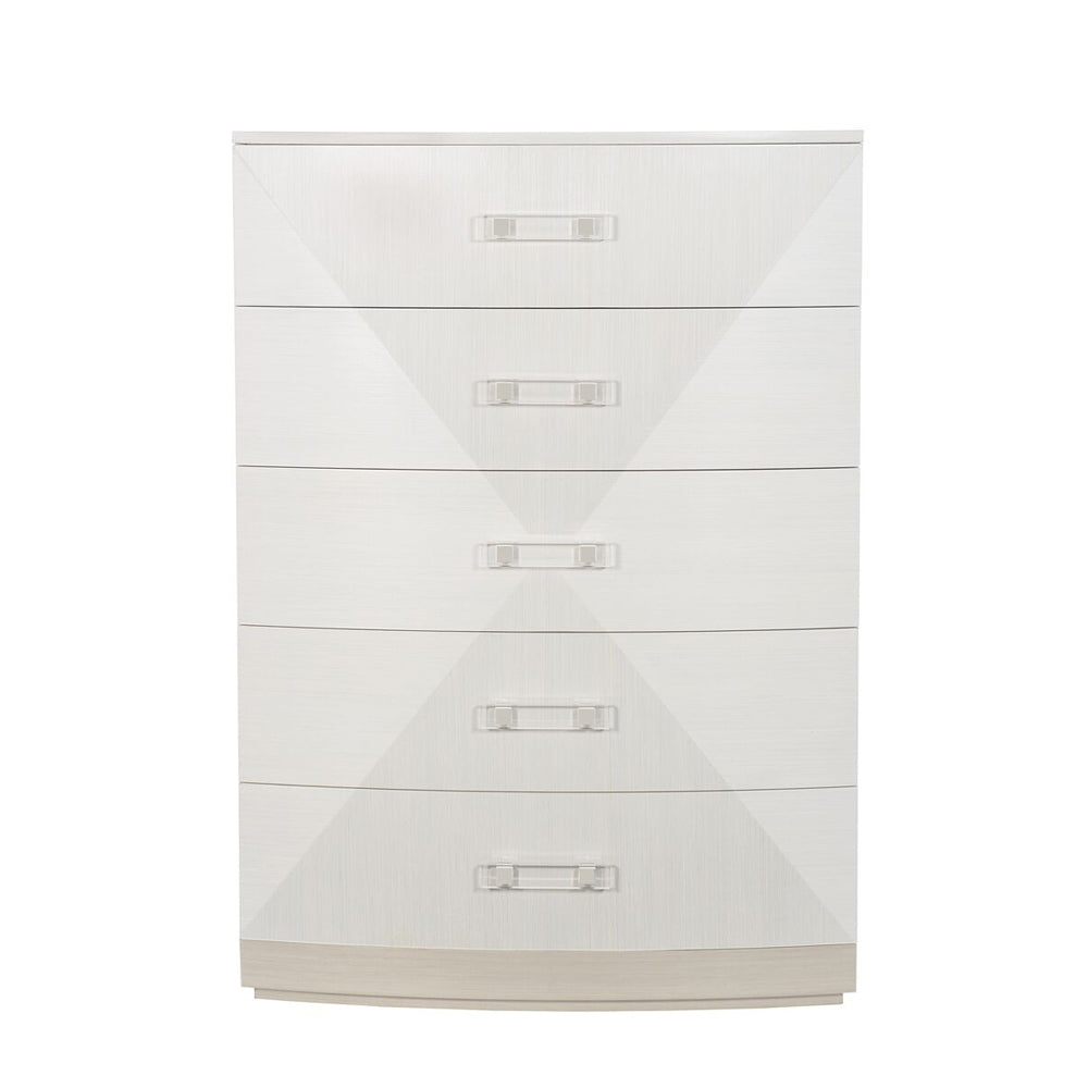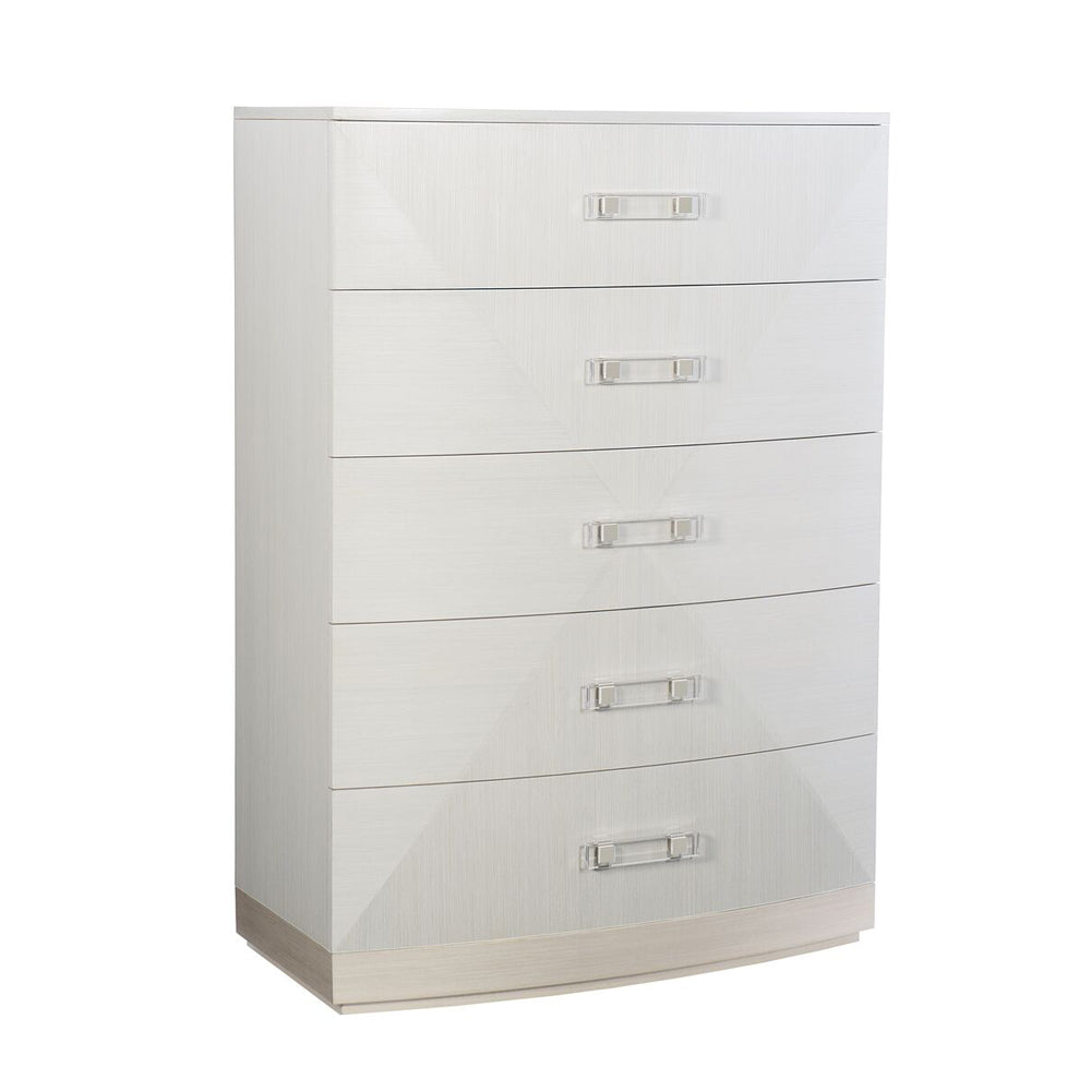 This tall chest offers a unique material story, blending veneers with acrylic and metal accents in a clean, sleek design. The Axiom tall chest is a glamorous transitional piece with a modern slant. Two silky yet low-sheen finishes are found on poplar solids and engineered faux anigre veneers. Elevating the visual appeal, the softly bowed front features an inverted pyramid design across the fancy face drawers. Clear acrylic combines with metal for hardware with a fresh and unique feel. With clean lines and a sleek form, this five-drawer chest remains a warm and inviting staple for the bedroom.