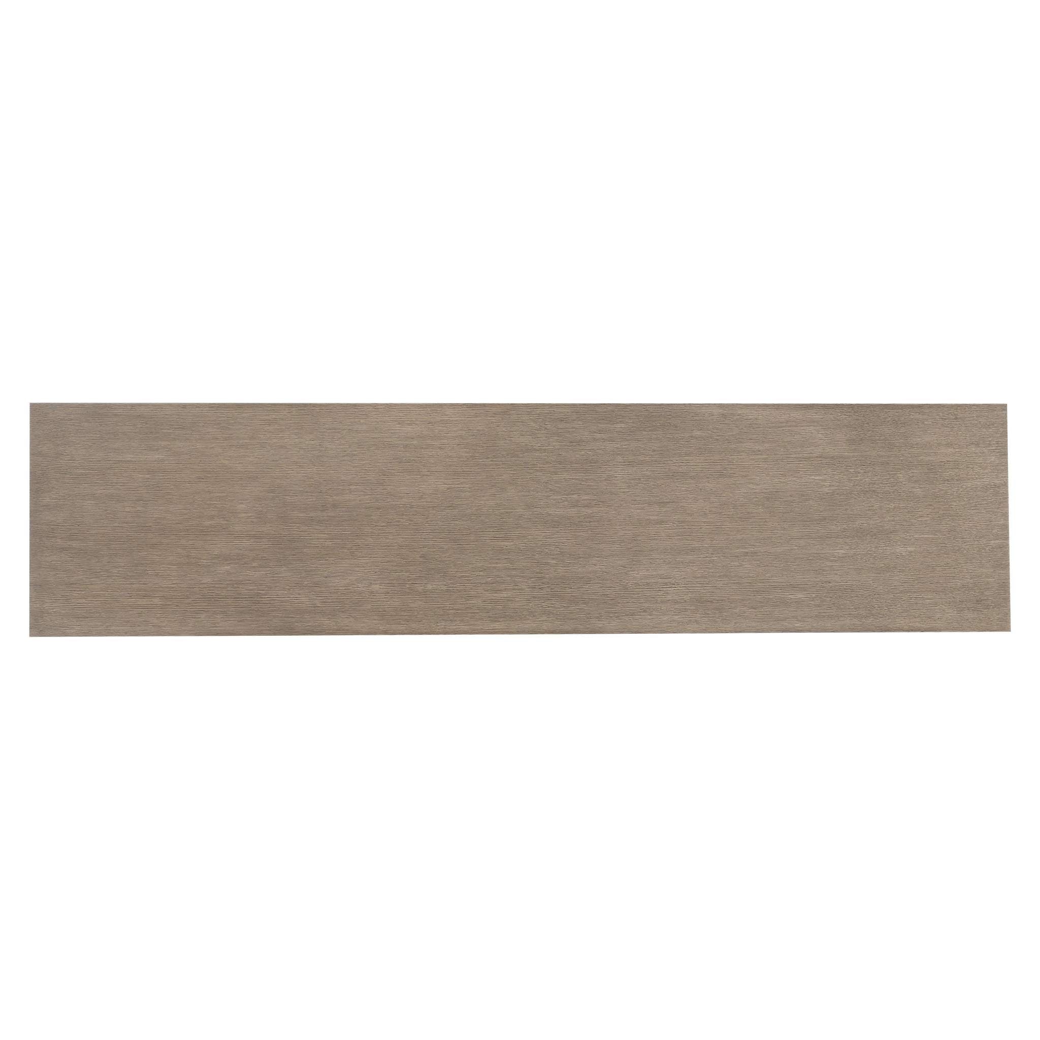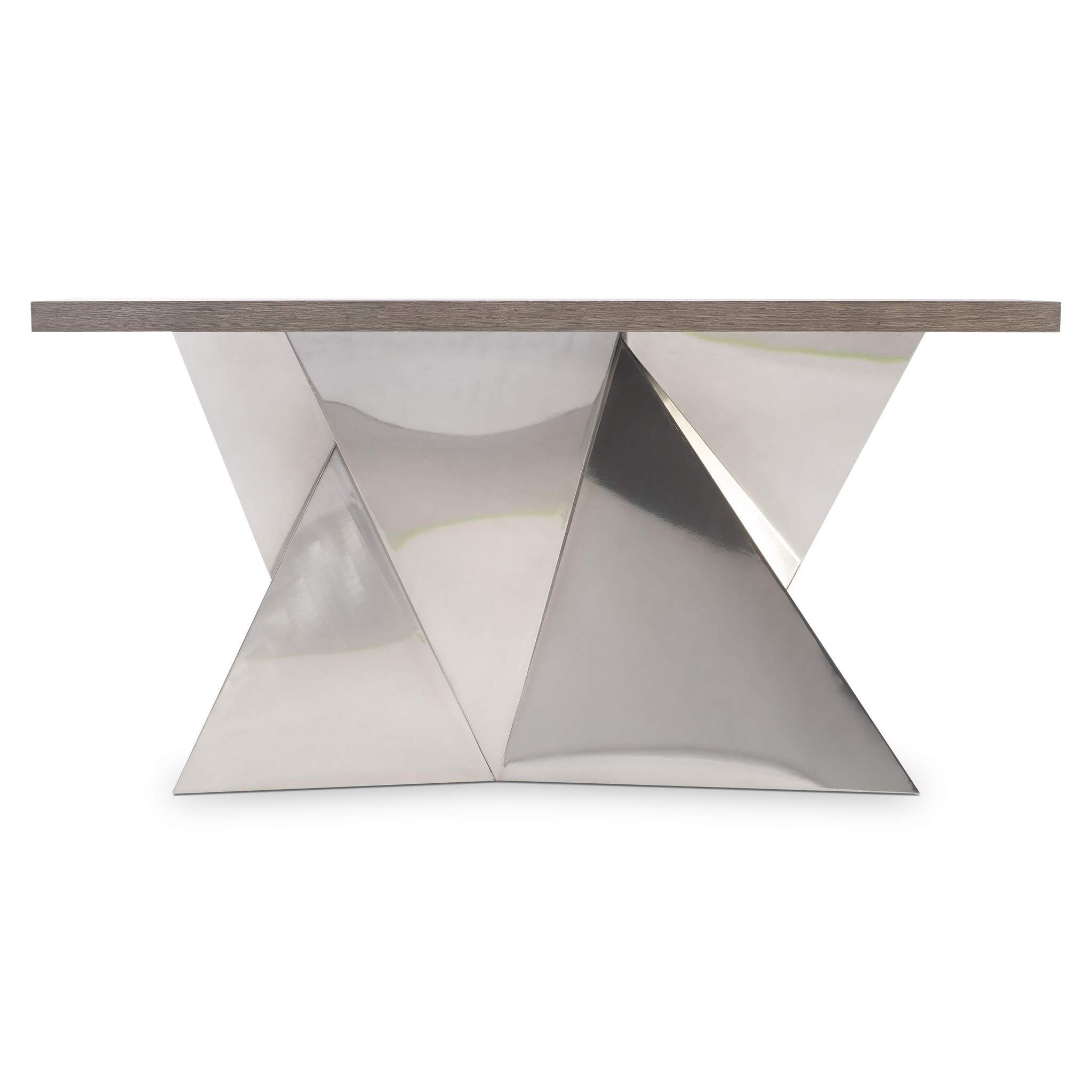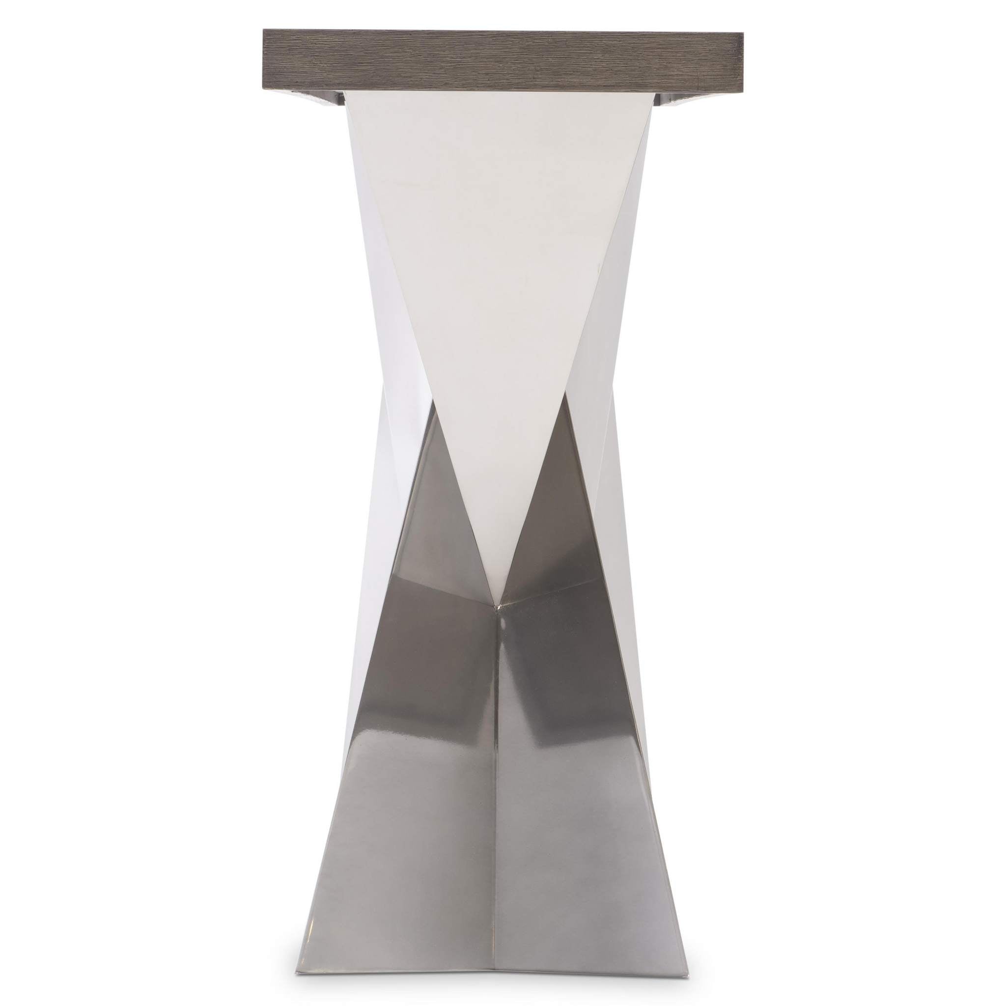 Stainless steel panels angle and bisect, forming a dramatic base on the Binti console table. Finished in Light Bronze, the metal base supports a wire-brushed wood top in Kona finish.