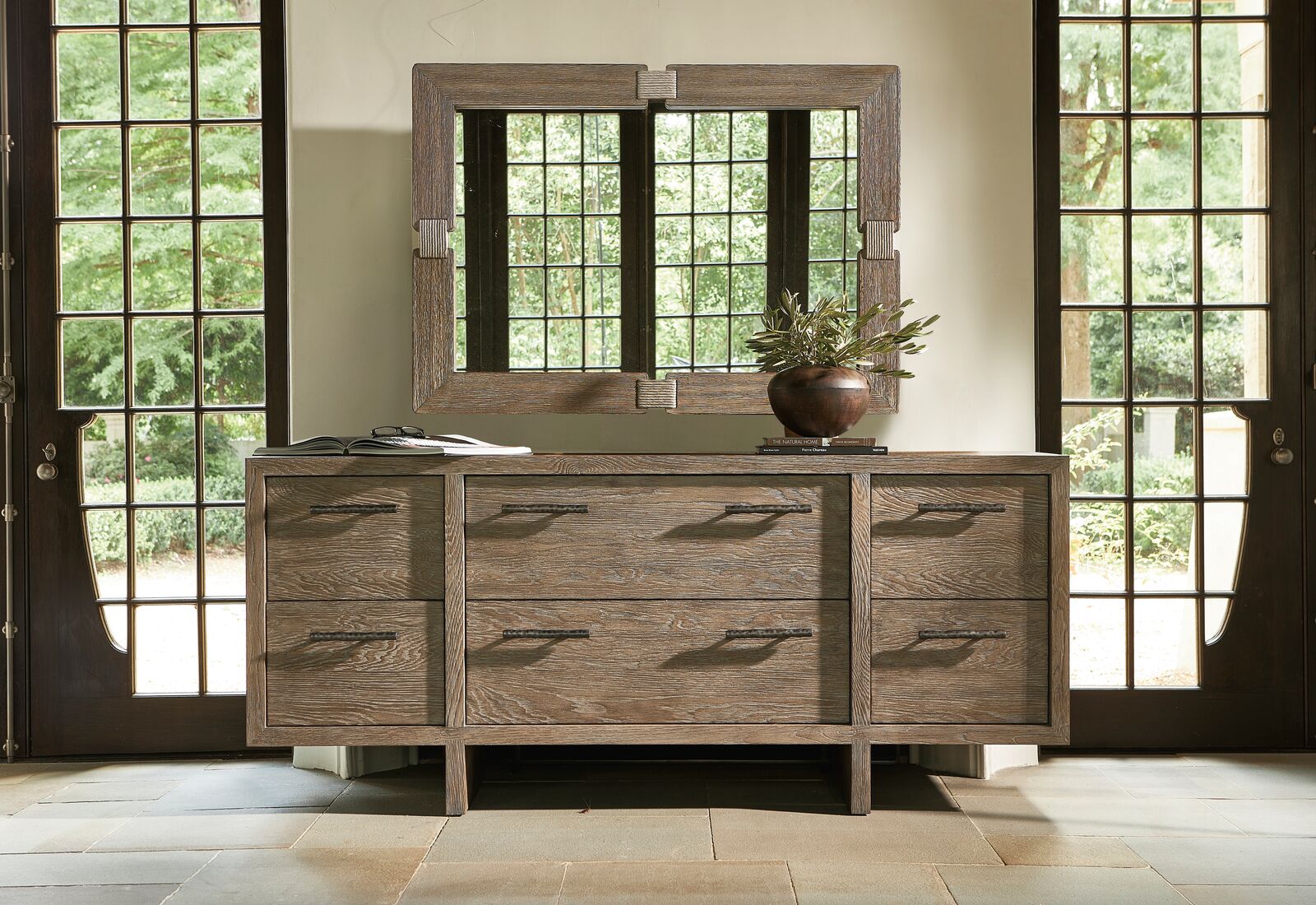 Taking a minimalist approach, the Casa Paros dresser appears to float above two leg panels. Six soft-close drawers in two sizes have cast metal hardware in an organic shape. The rustic Playa finish offers natural textures and subtle wood grains.