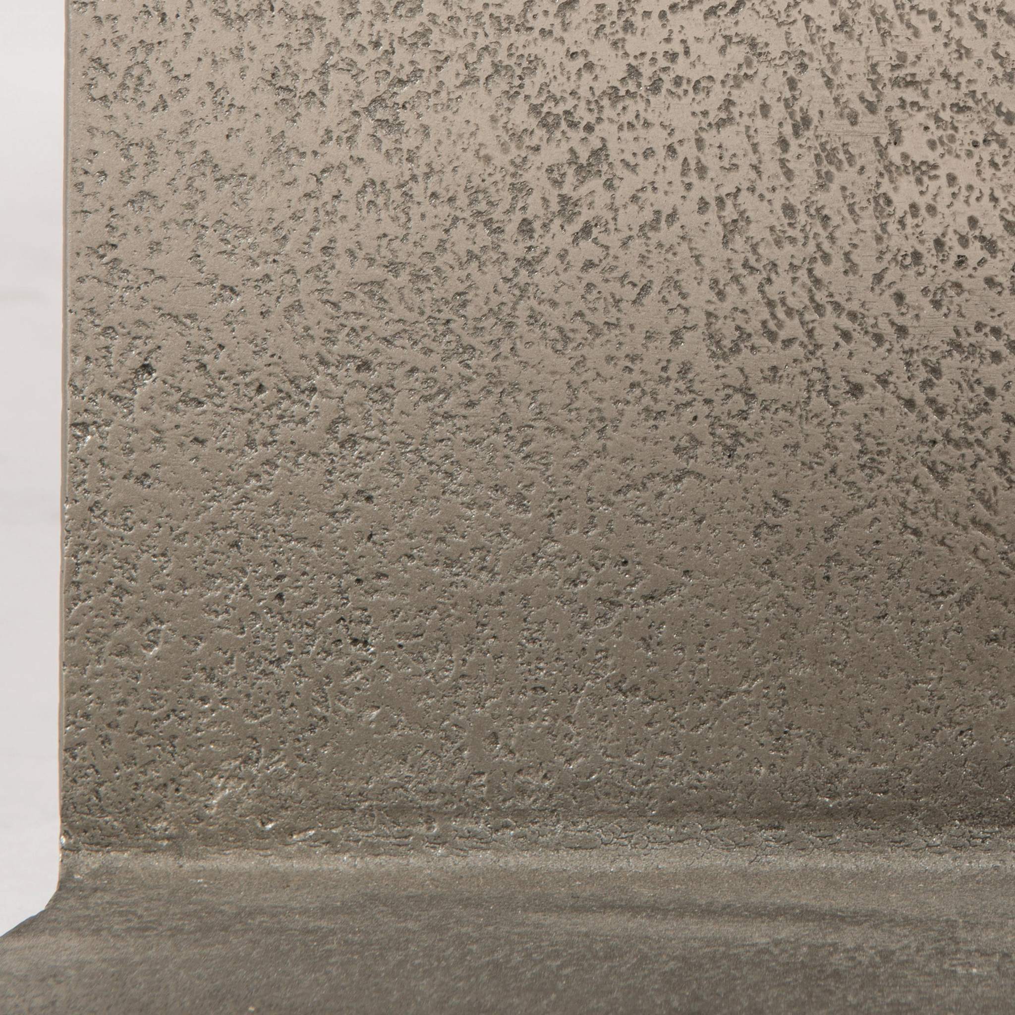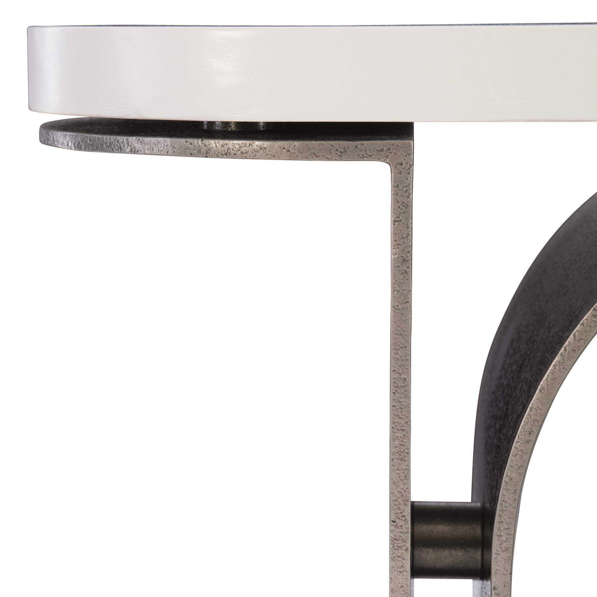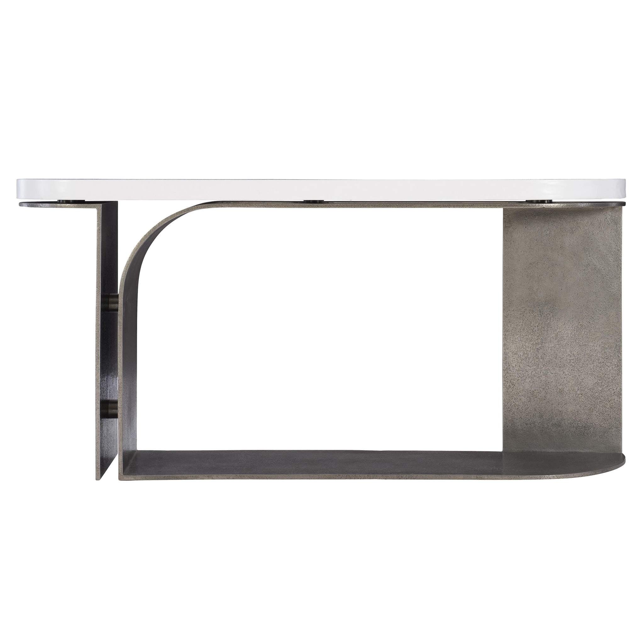 The Catalina console table combines unique materials with inspired design. The interplay of curves and rectangular shapes creates an artistic feel. For a striking contrast, the sculptural cast aluminum base features a textured graphite finish, while the maple veneered top is finished in smooth white plaster. The top appears to hover above the base, adding to the unique character of this dynamic piece.