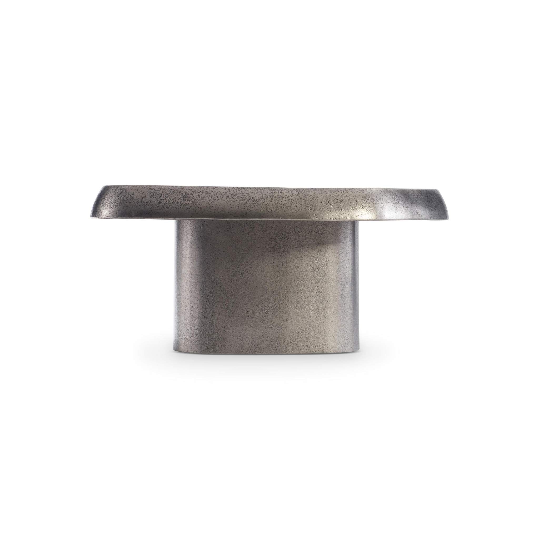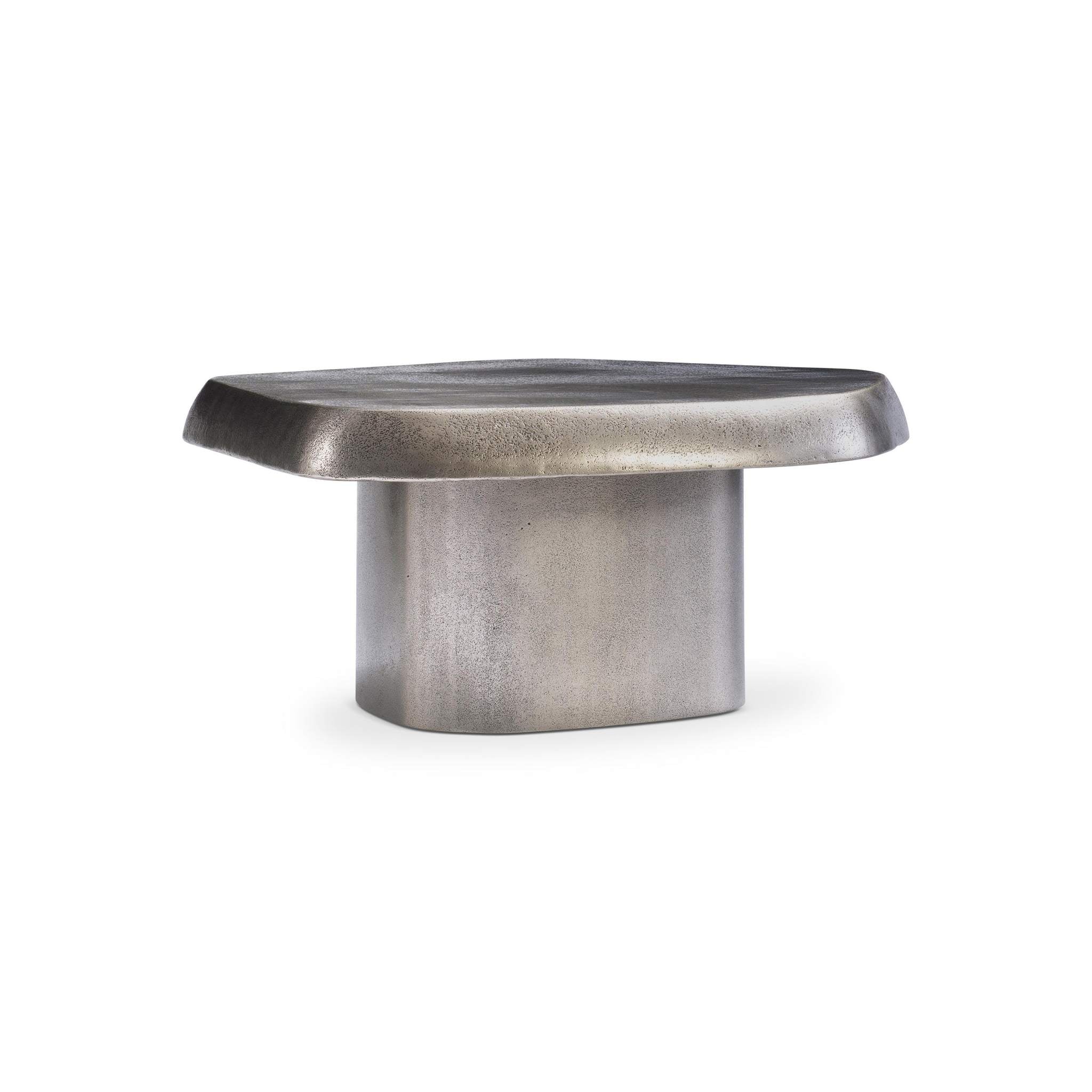 An organic shape in cast aluminum forges a unique form for the Clawson cocktail table. Finished in Graphite, a free-flowing top is perched on a shaped pedestal. The stunning table can be used independently or as a lovely interlocking set with the other Clawson cocktail table designs.