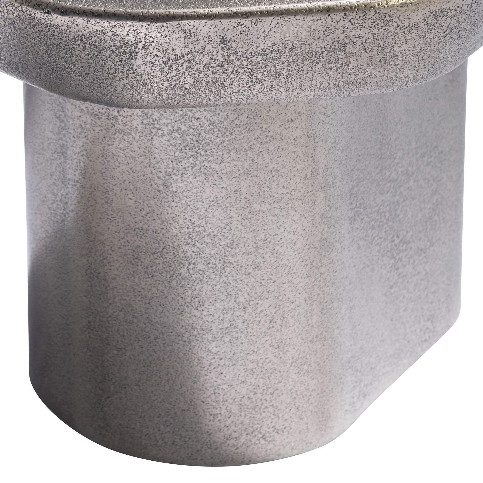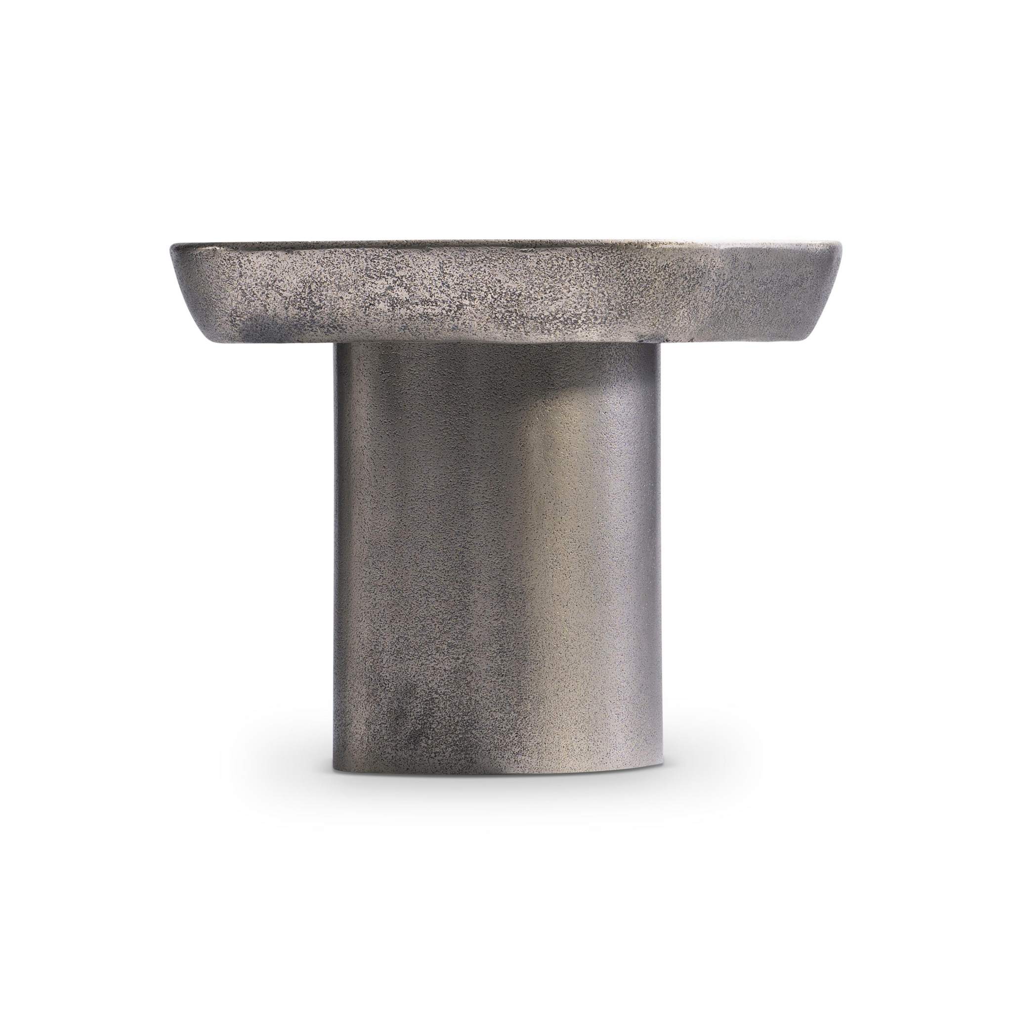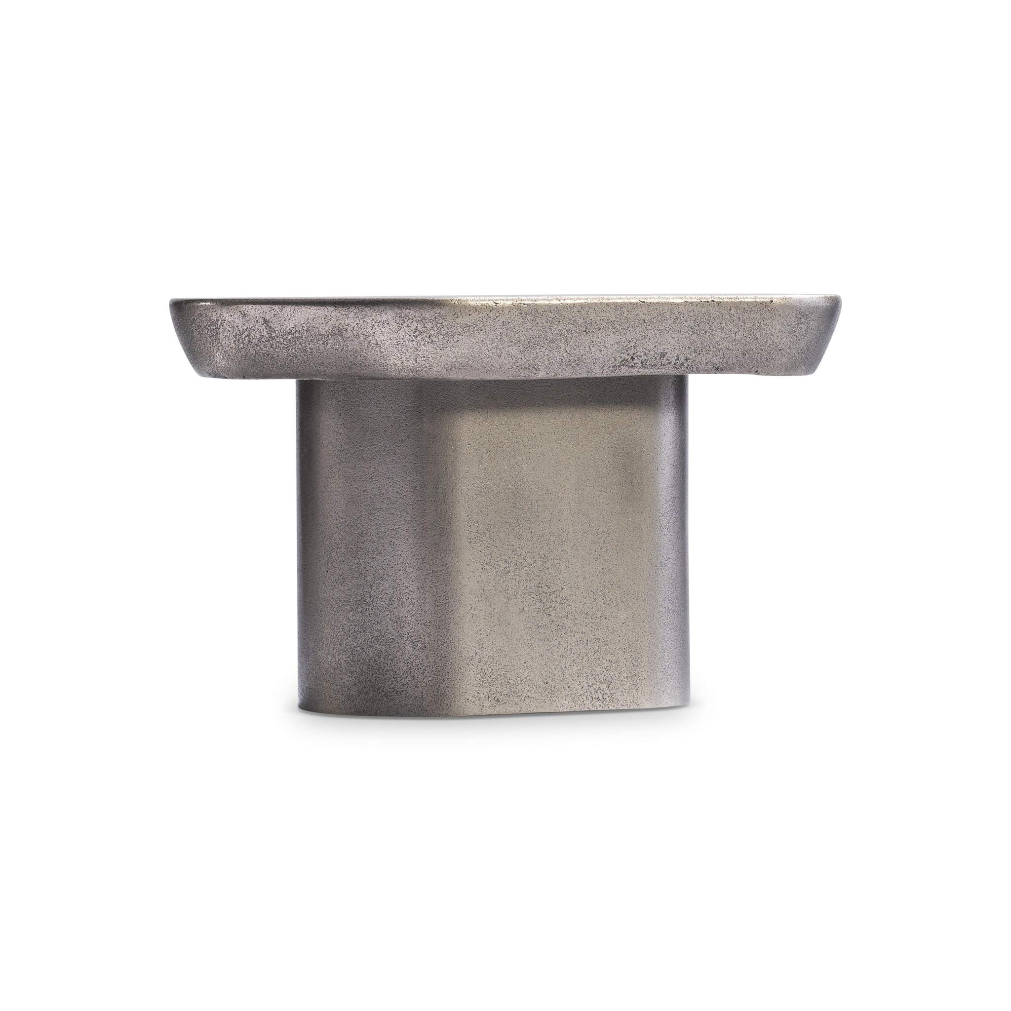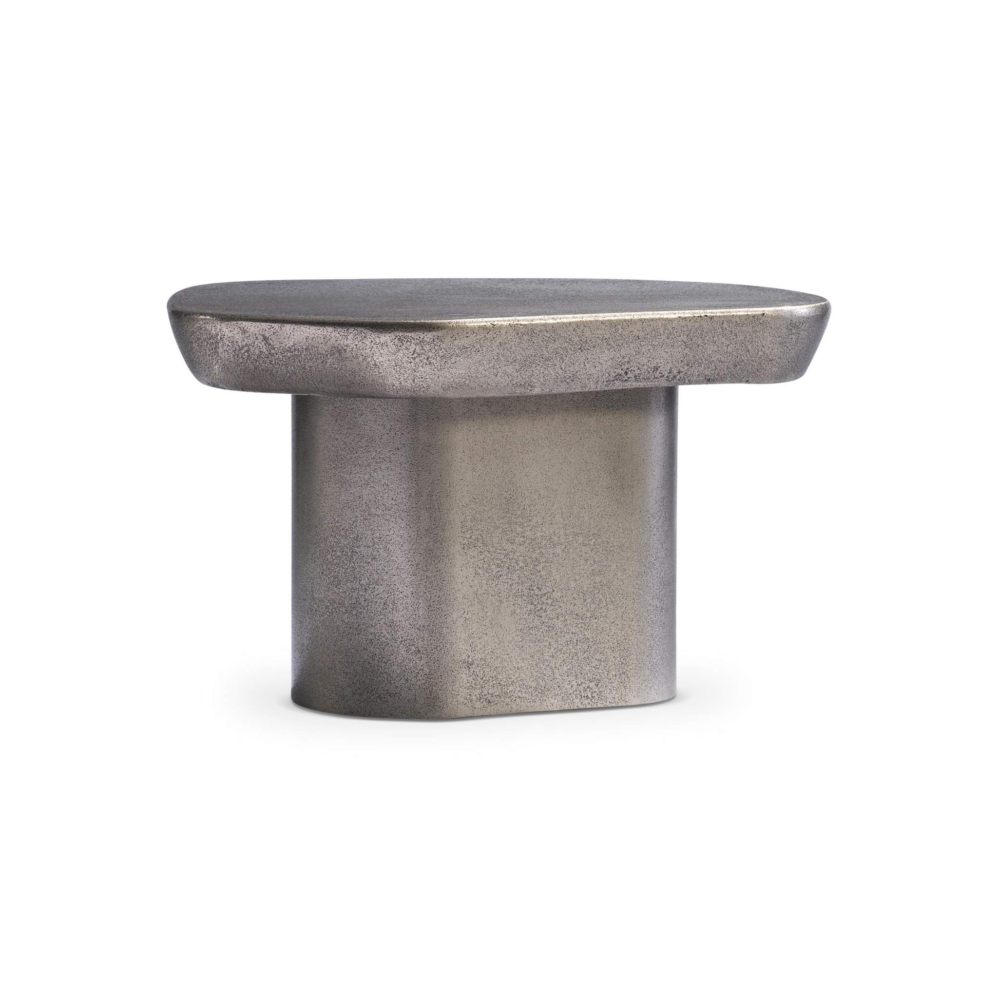 An organic shape in cast aluminum forges a unique form for the Clawson cocktail table. Finished in Graphite, a free-flowing top is perched on a shaped pedestal. The stunning table can be used independently or as a lovely interlocking set with the other Clawson cocktail table designs.
