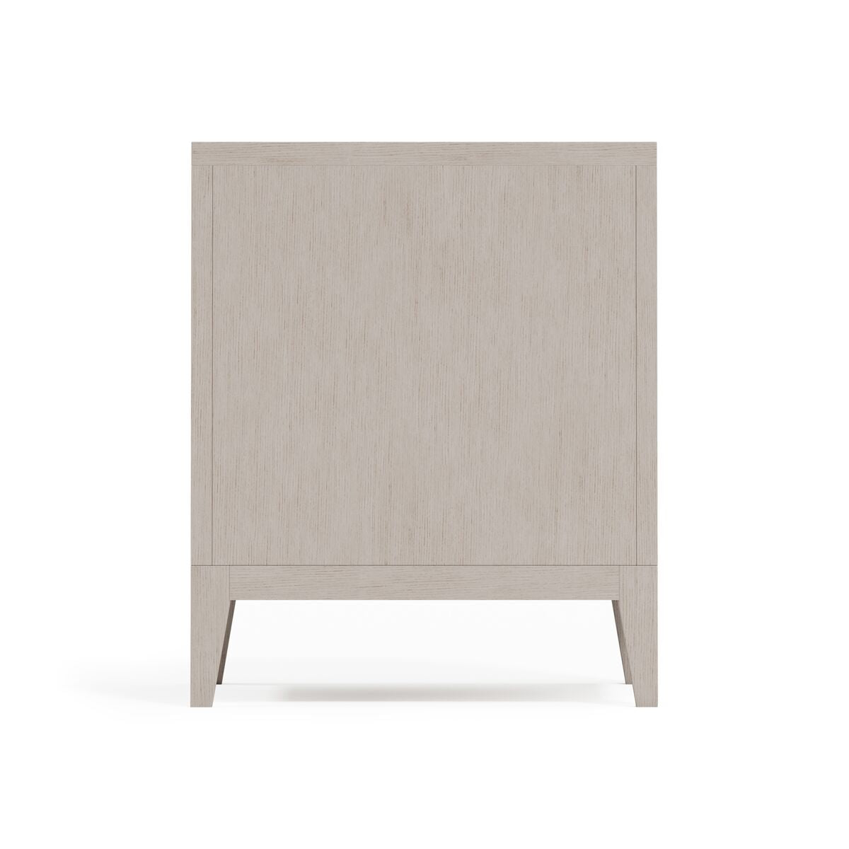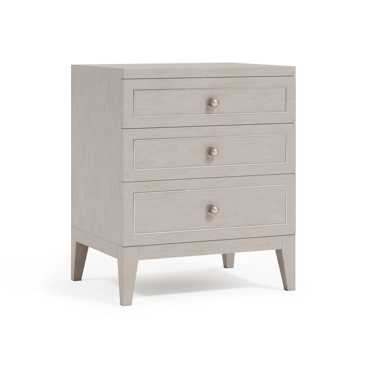 Ash Wood Nightstand In Nebbia Finish With Three Pull-To-Open Soft-Close Drawers With Brushed Stainless Steel Metal Inlay. On Round Knob With Glazed Brushed Stainless Steel Finish Per Drawer. Two Port A+C Usb Charging Unit. Adjustable Glides.
