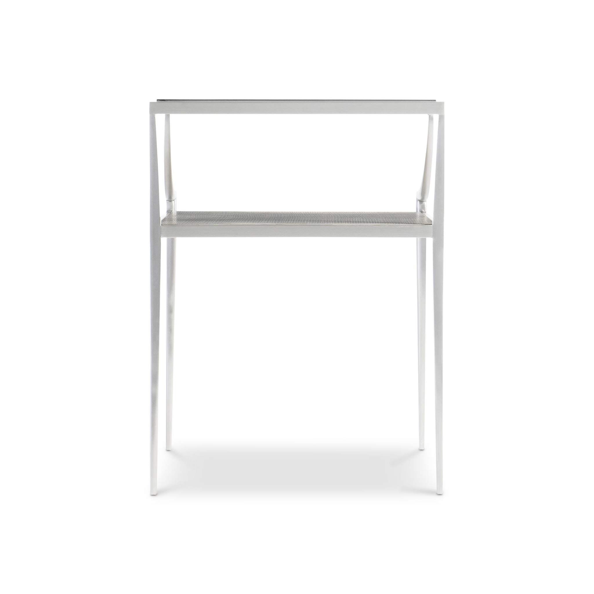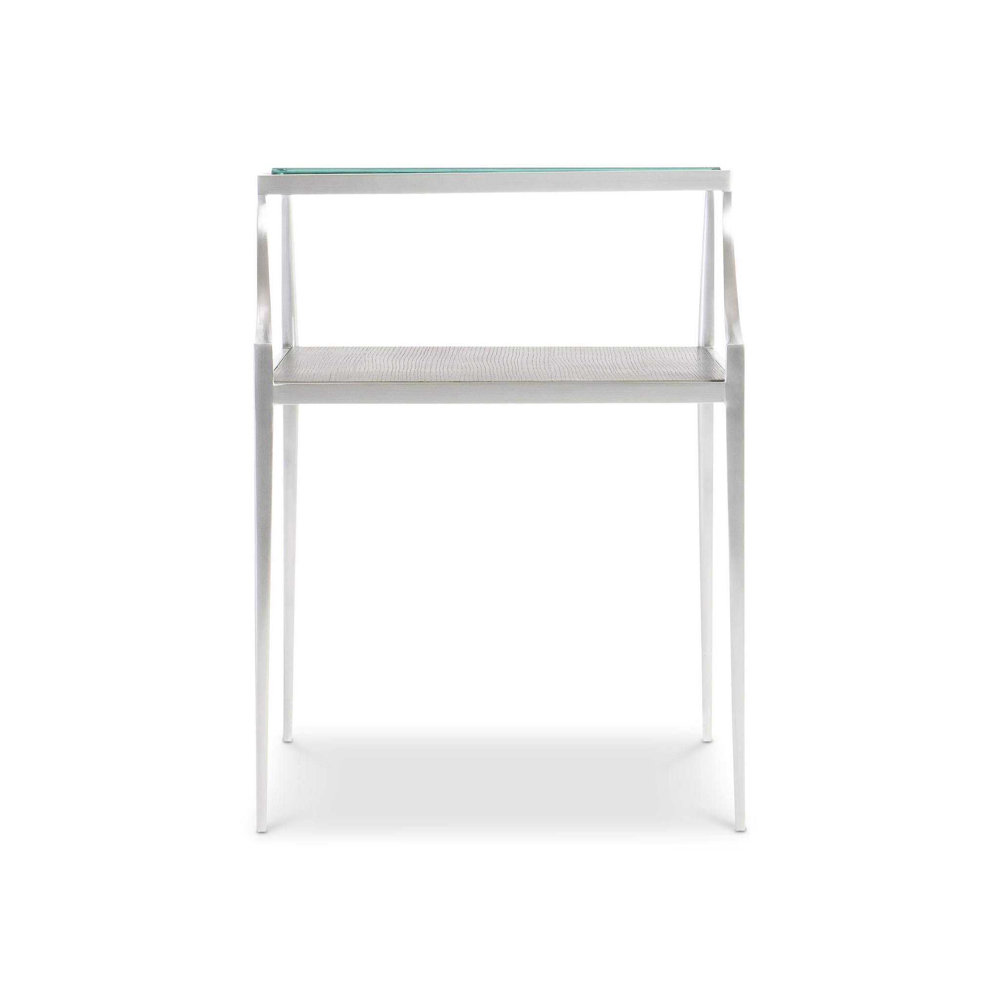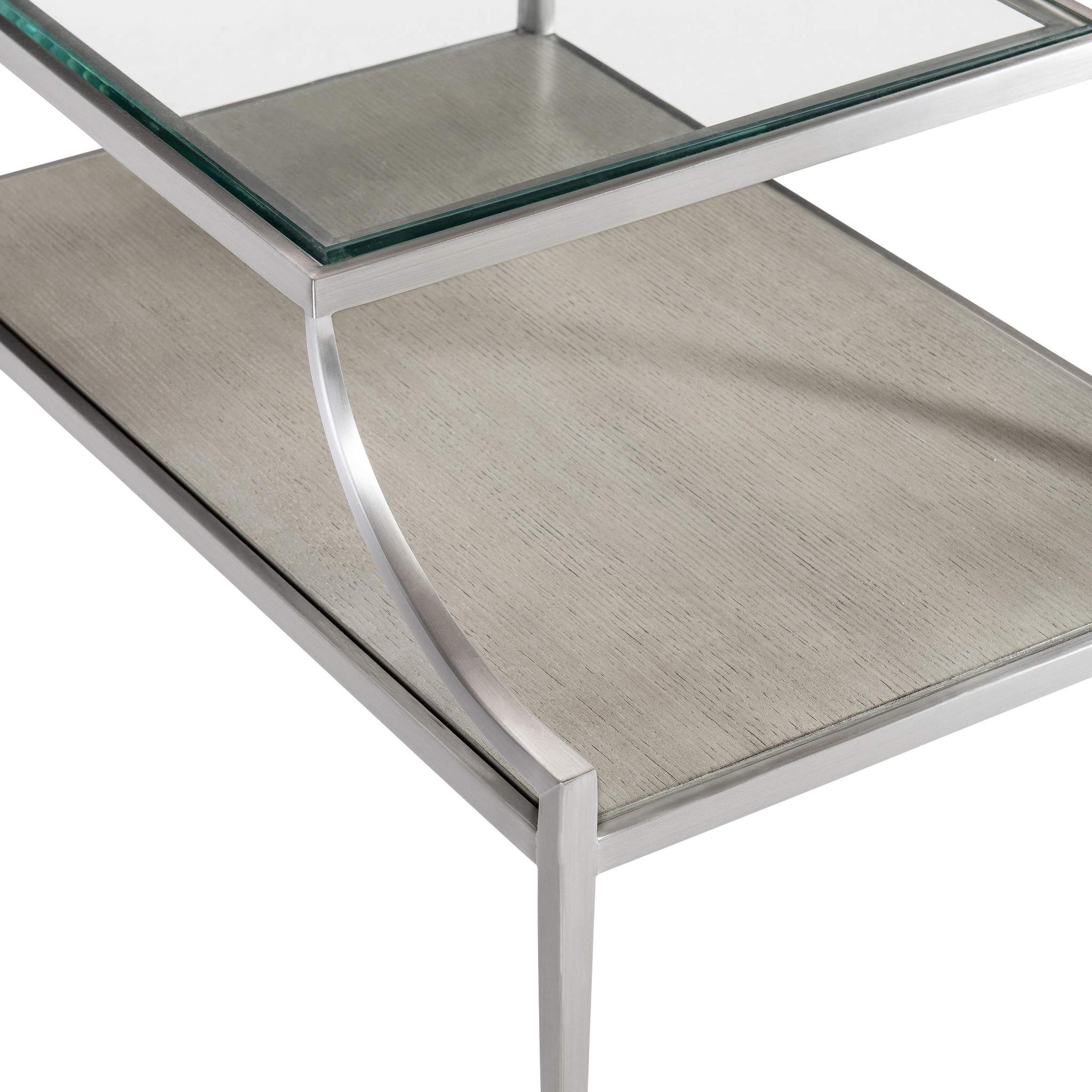 Metal frame in Brushed Stainless Steel finish with tempered, polished-edge glass top and one wood shelf in Nebbia finish