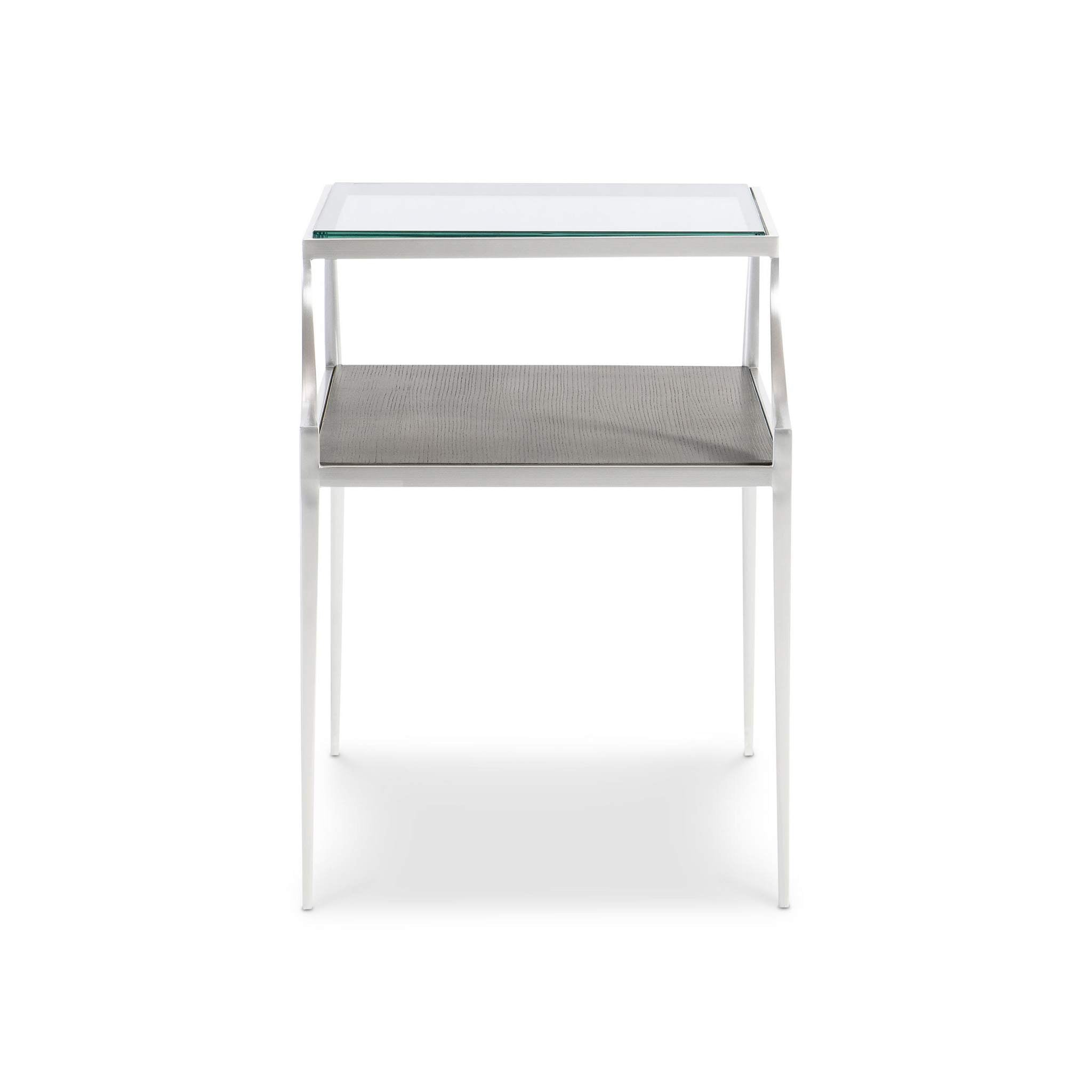 Sleek and elegant, the bi-level Cornelia side table offers a streamlined profile in cast brushed stainless steel. Slim tapered legs support a wood shelf in the Nebbia finish that extends beyond the glass top.