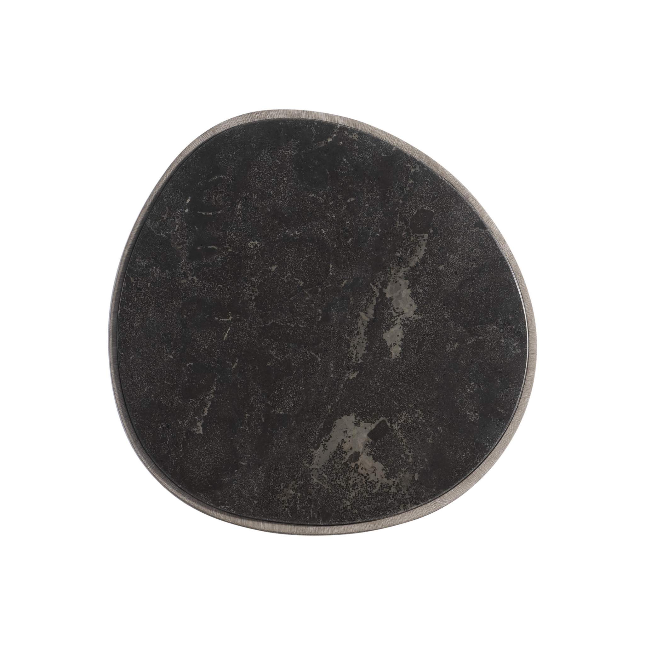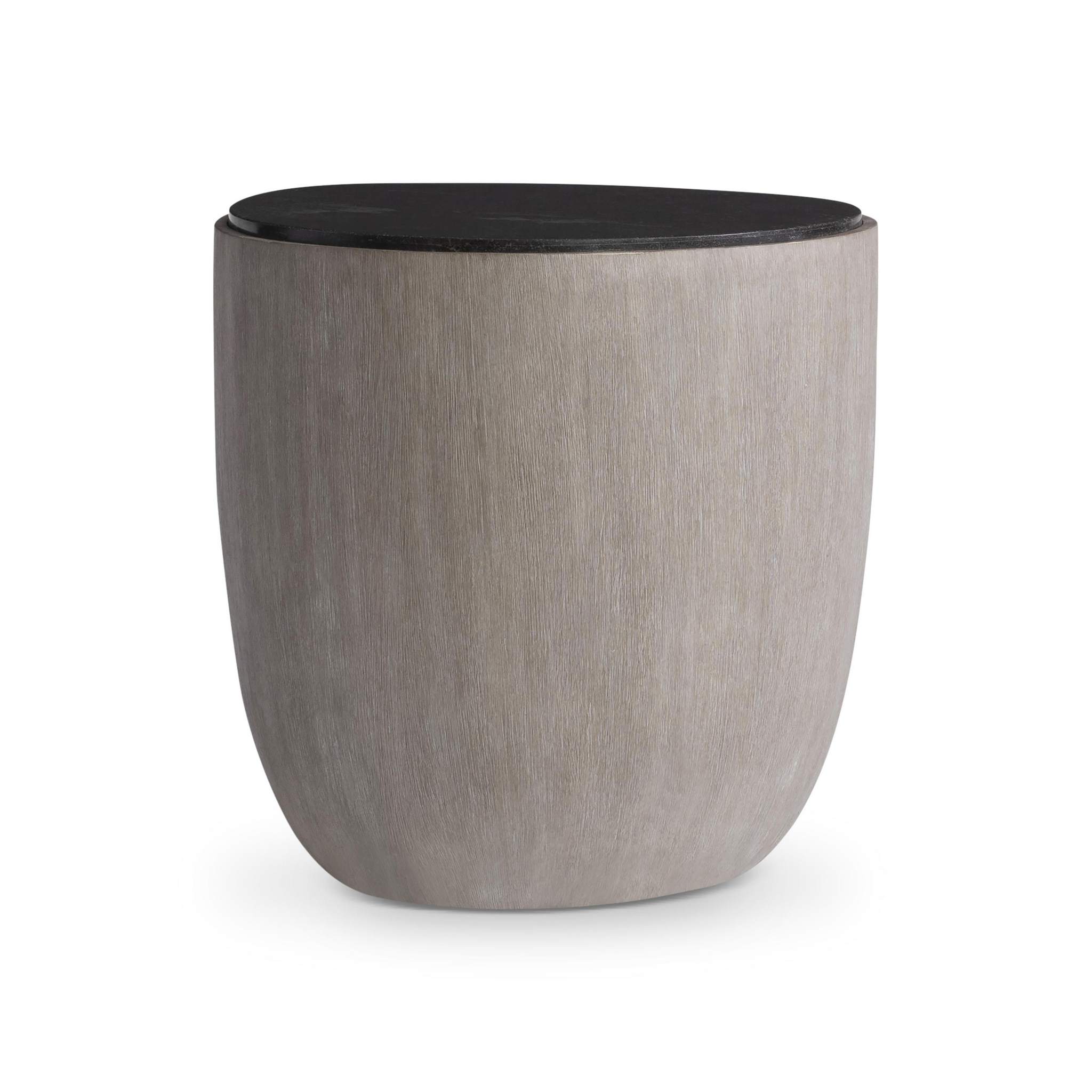 Inspired by iconic 1970s design, the Croft side table takes a freeform approach for a traditional drum shape. The base is crafted of cast resin with a wood grain texture in a Forry finish. The top in semi-polished bluestone marks a balance between dark and light, wood and stone.