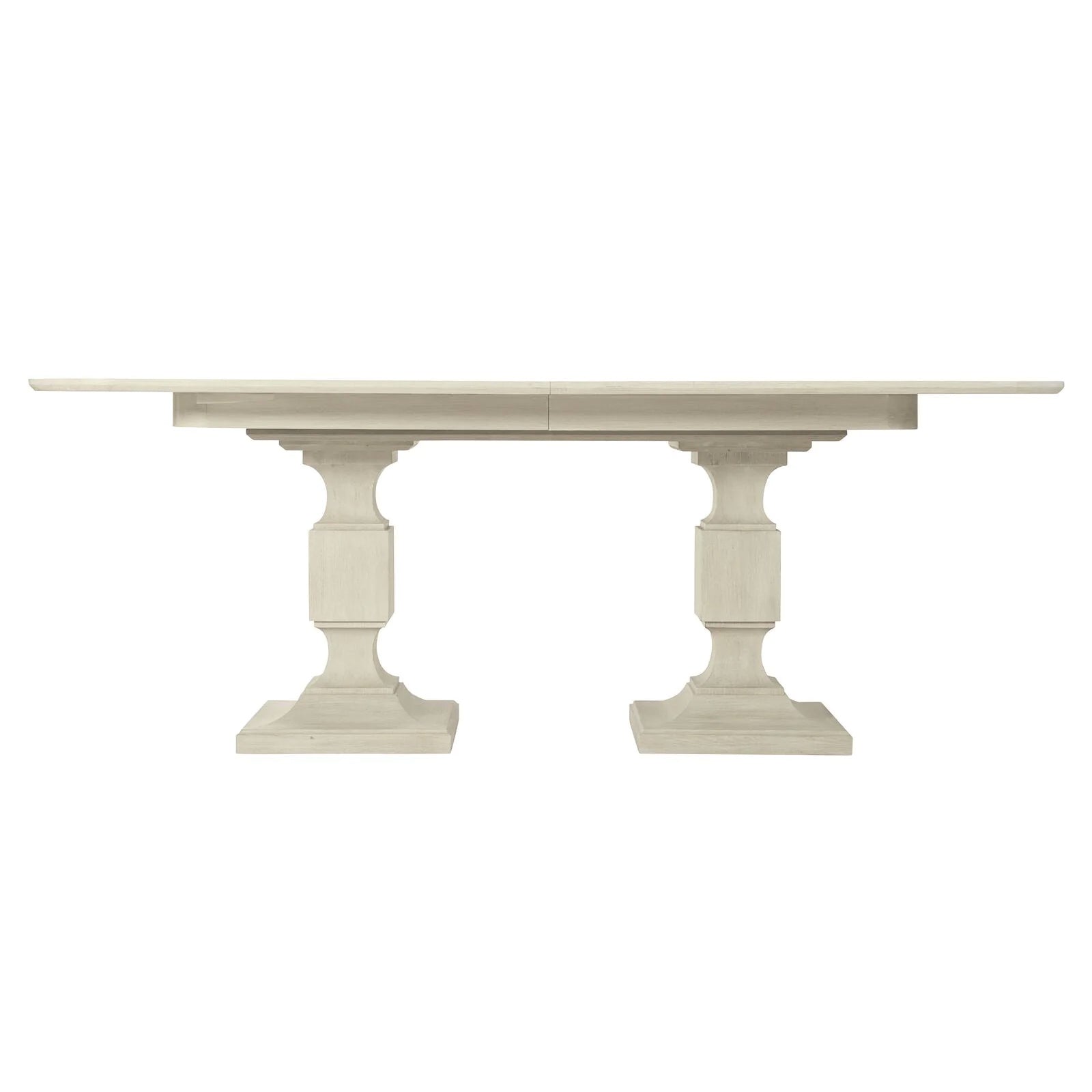 This all-wood East Hampton dining table is designed for versatility. While perfect for an intimate space, its two-pedestal base and two 20" leaves allow it to extend to accommodate large groups. Its decorative cerused finish is created from a combination of different colored pigments to highlight the woods natural grain pattern, creating a distinct handmade, elegant look.