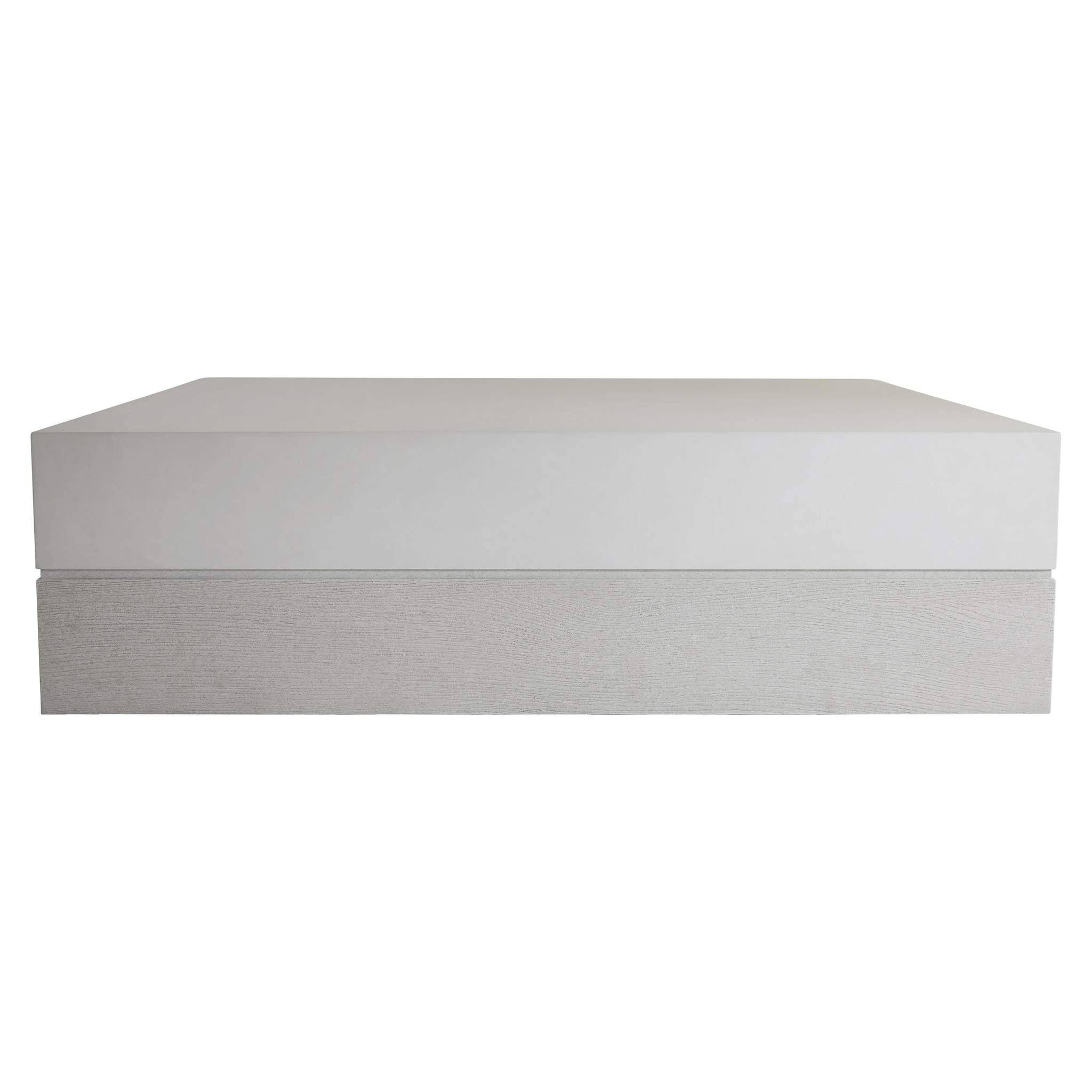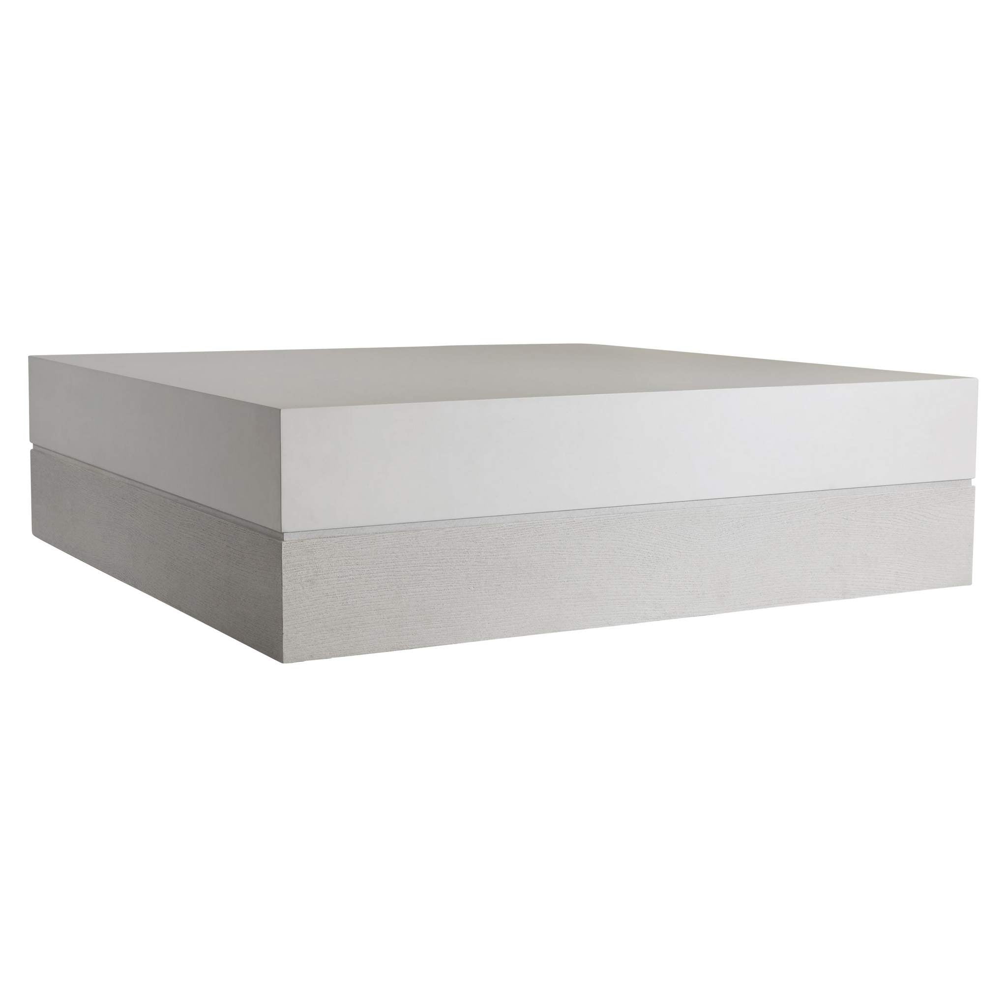 An iconic design makes a daringly simple statement in the Ellison cocktail table. Uncomplicated lines create sophistication with an Adobe faux stone finish on the top and a sandblasted white finish on the base. Non-marring, heavy-duty casters are included on the bottom of this 54-inch table.