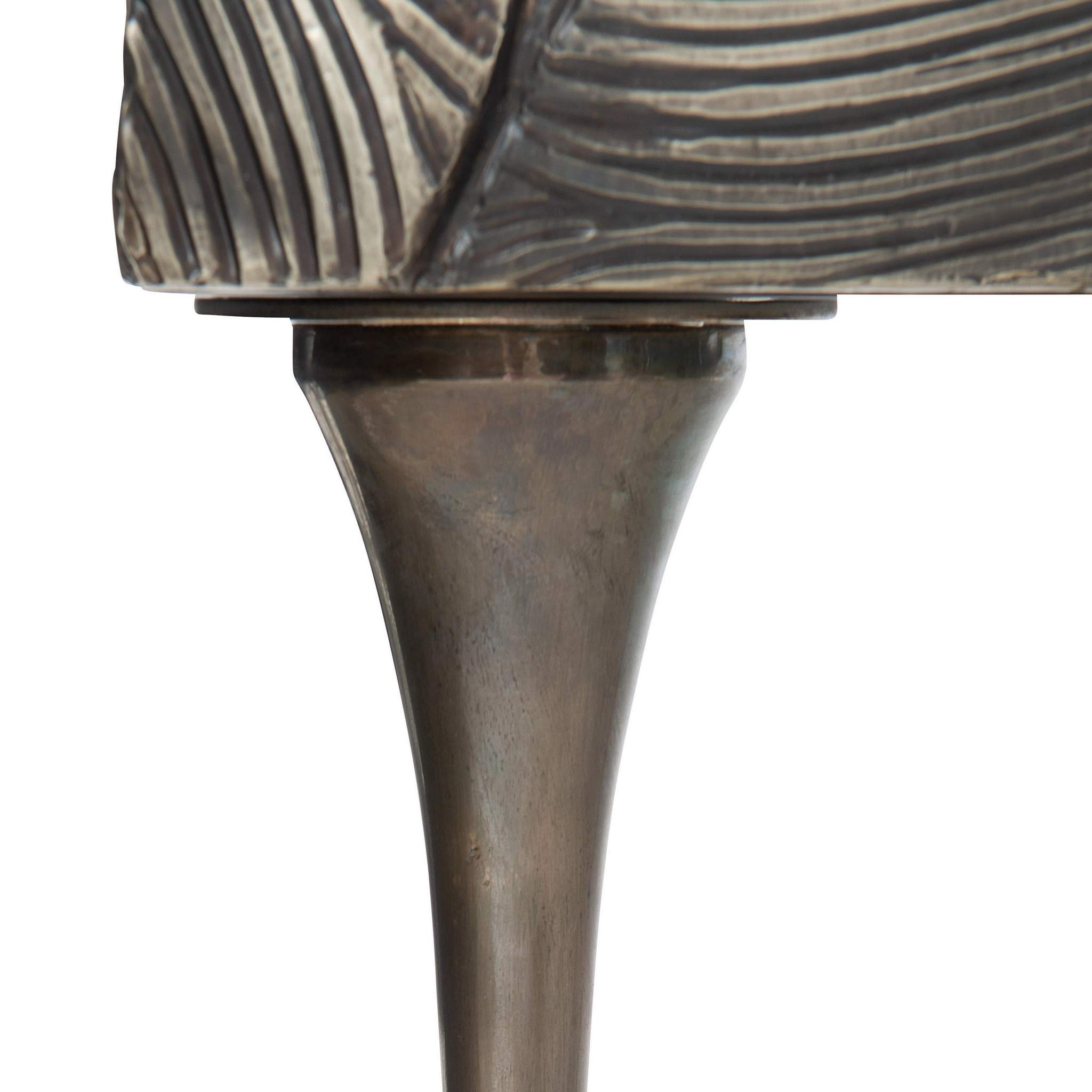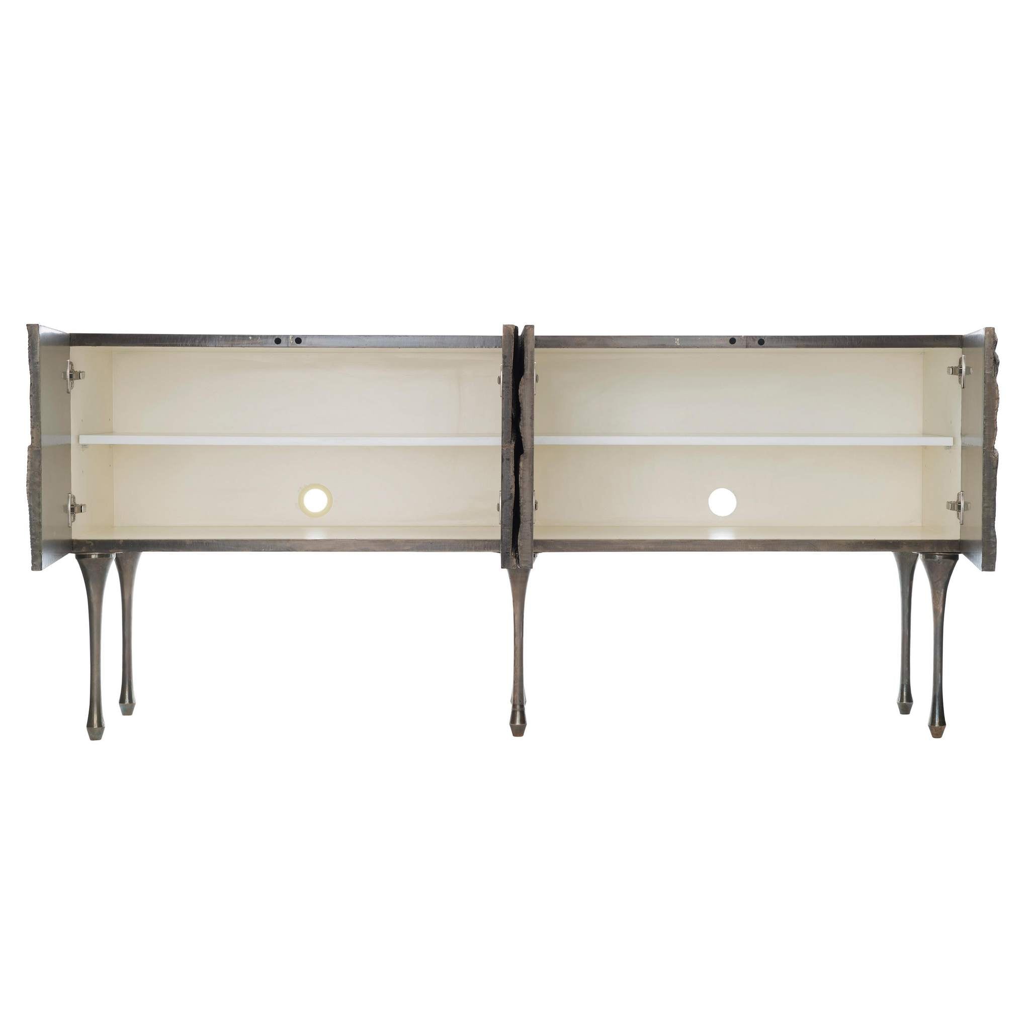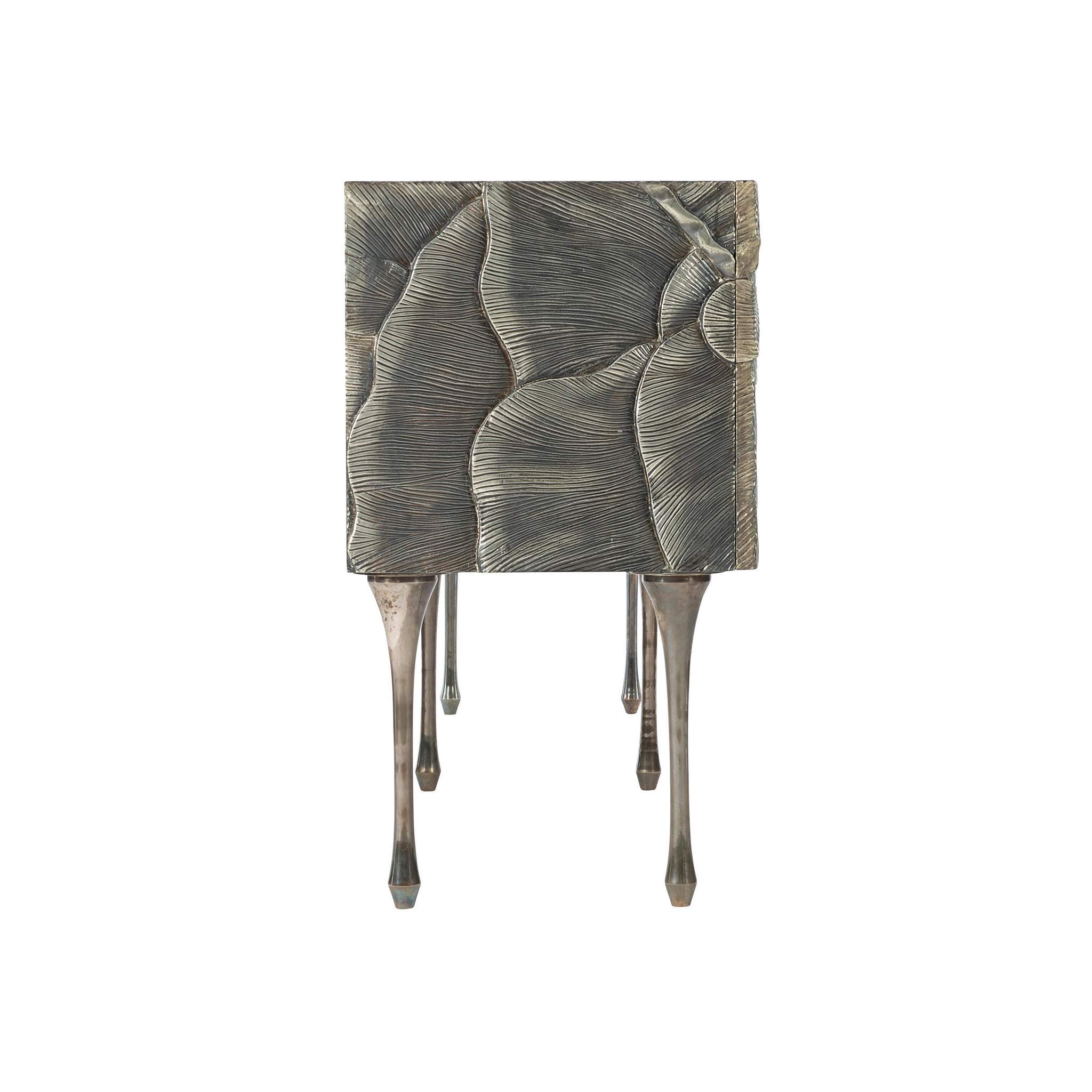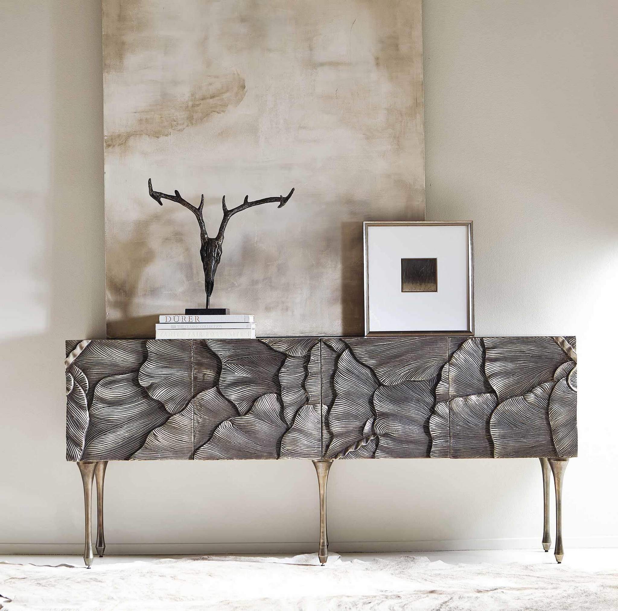 Clad in German silver in an antique finish, this glamorous modern credenza features an elegant floral motif.