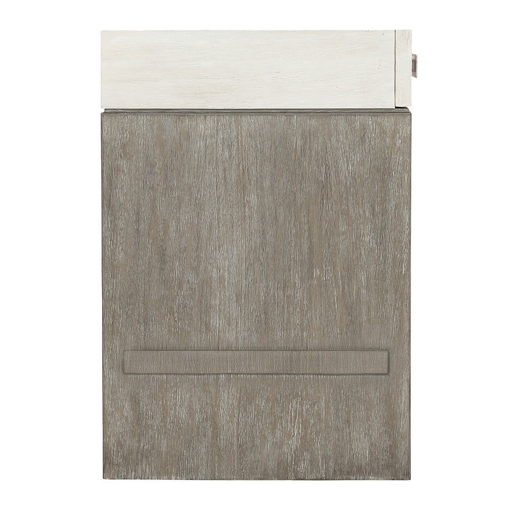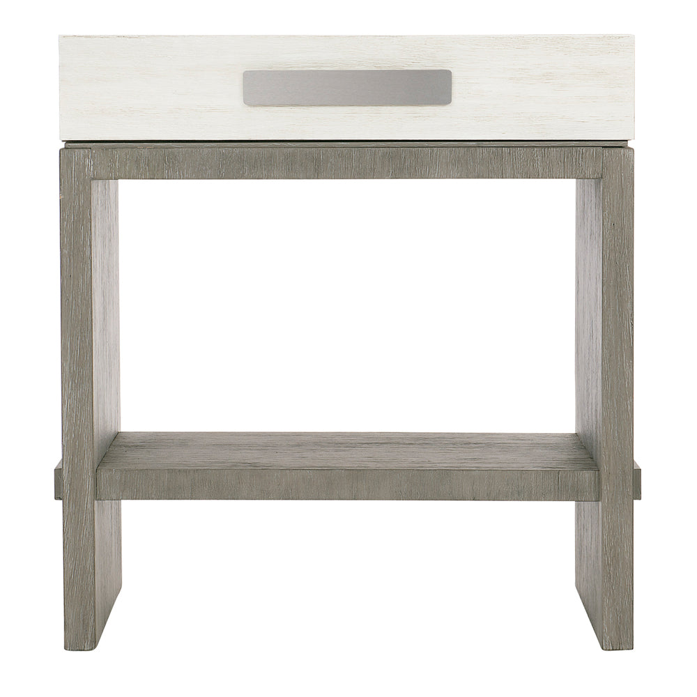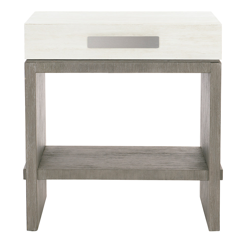 Crafted from cerused, wire-brushed acacia, this nightstand offers rustic style with a contemporary touch. Foundations is a new, refined expression of modern rustic, defined by a minimalist style and relaxed finishes. Crafted from cerused, wire-brushed acacia in two-tone finish, the Foundations nightstand offers rustic style with a contemporary touch. Clean lines and intersecting planes create a sophisticated design aesthetic, softened by a palette of gray and white. A brushed stainless steel pull on its single drawer adds a subtle accent to the simple form.