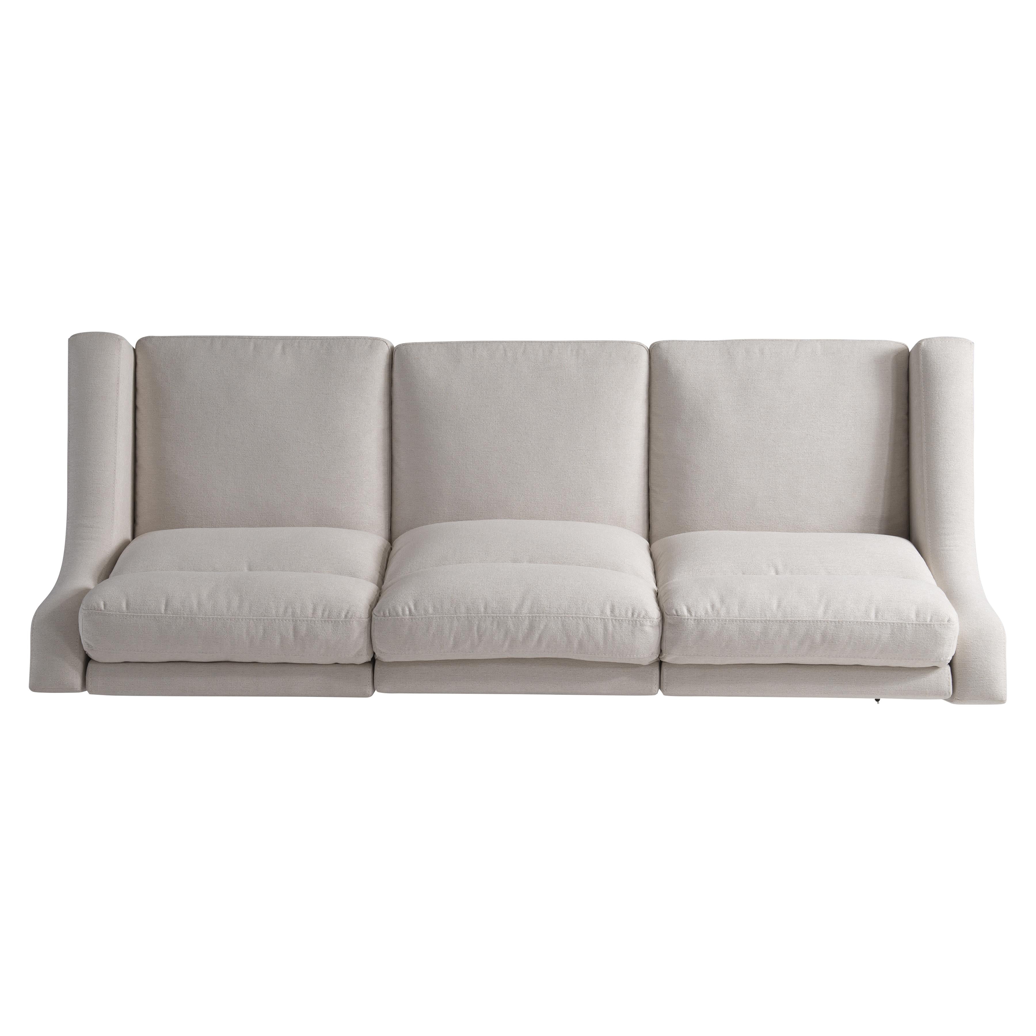A traditional wingback design is reformed with more modern lines and deep comfort on the Germain power motion sofa. The back reclines and the footrest rises to offer a relaxing escape on the left and right seats, which the center seat remains stationary. The controls for each side seat can be found on the outer panel, along with a USB port for phones and tablets.