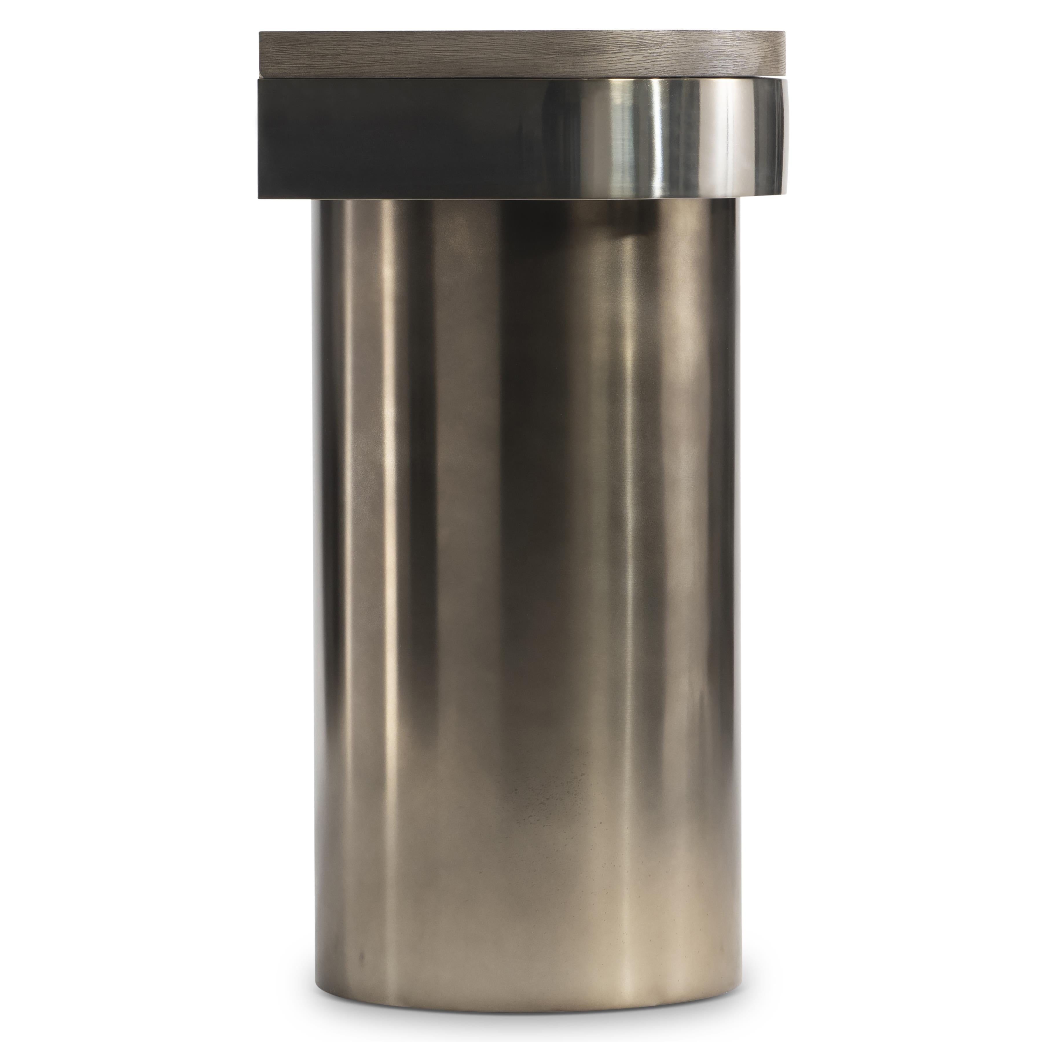 A Dark Bronze finish makes a stunning statement on the round stainless steel legs of the Jacopo console table. A metal band in Light Bronze finish wraps around the wire-brushed oak top, creating a stunning sculptural design of mixed materials.