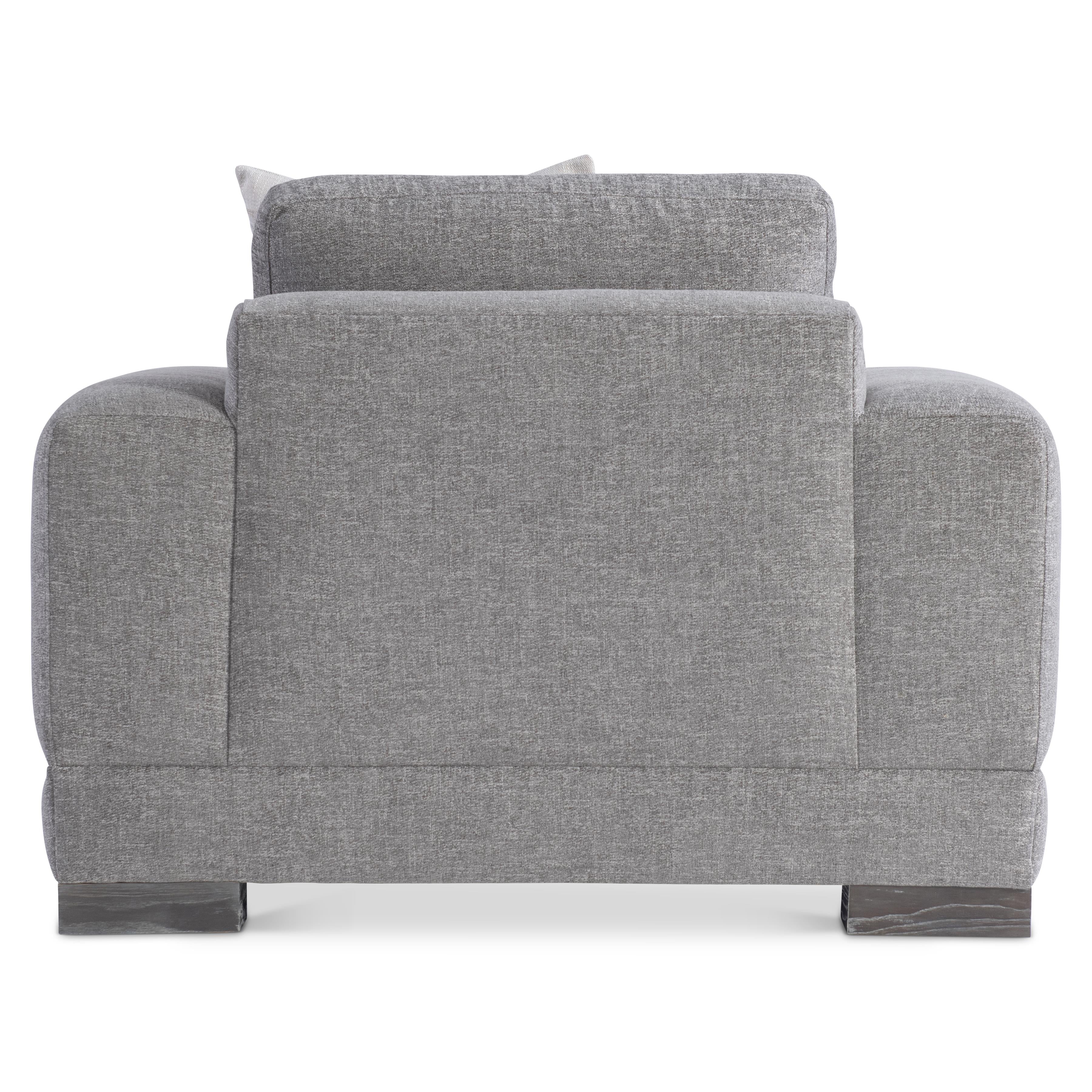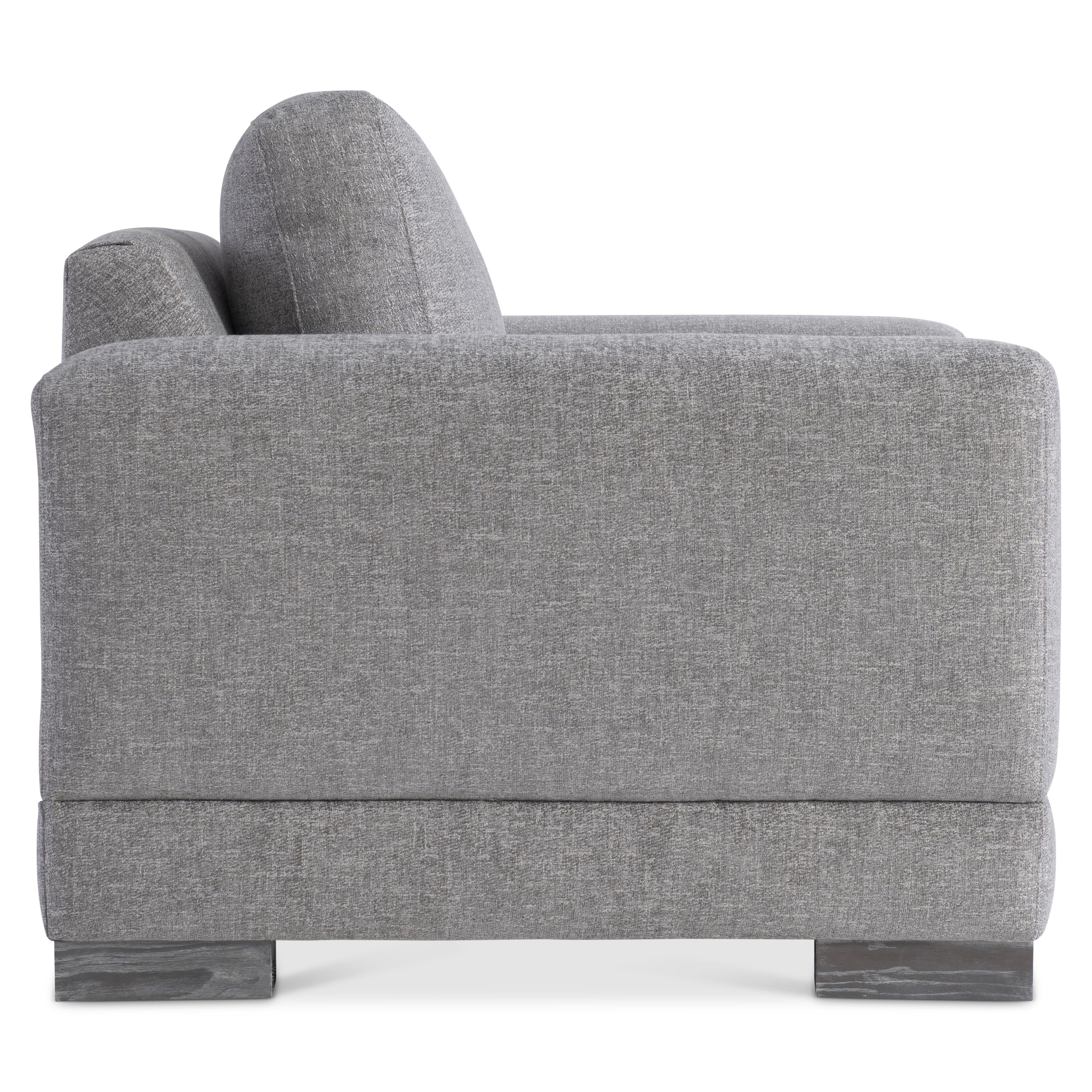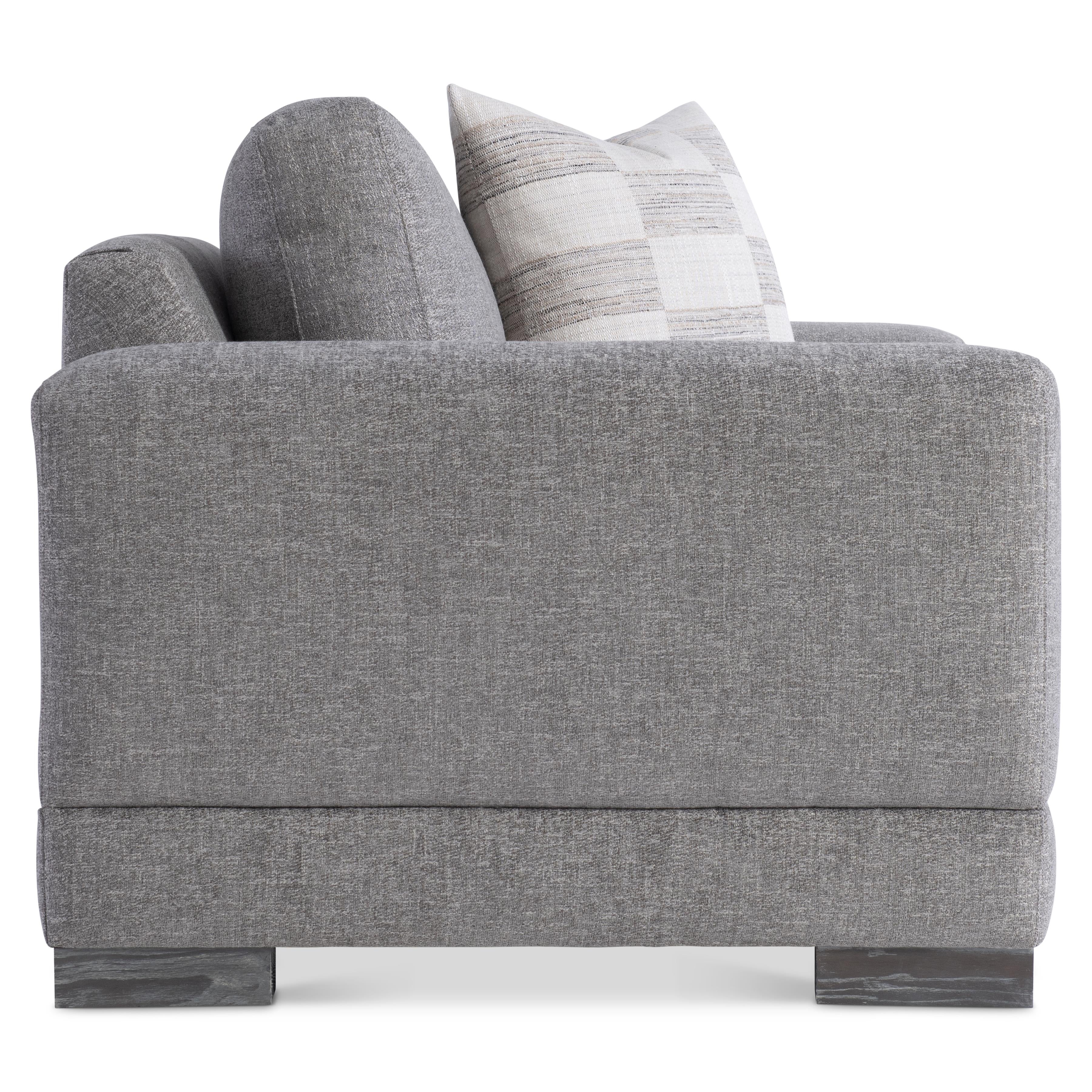 Straight lines are softened with gentle curves on the Lars chair, complementing the wide track arms and bold silhouette. A plushly deep seat and a box-edge weltless bordered back pillow craft a comfort destination. Four wide block feet take a stance in textured wood.