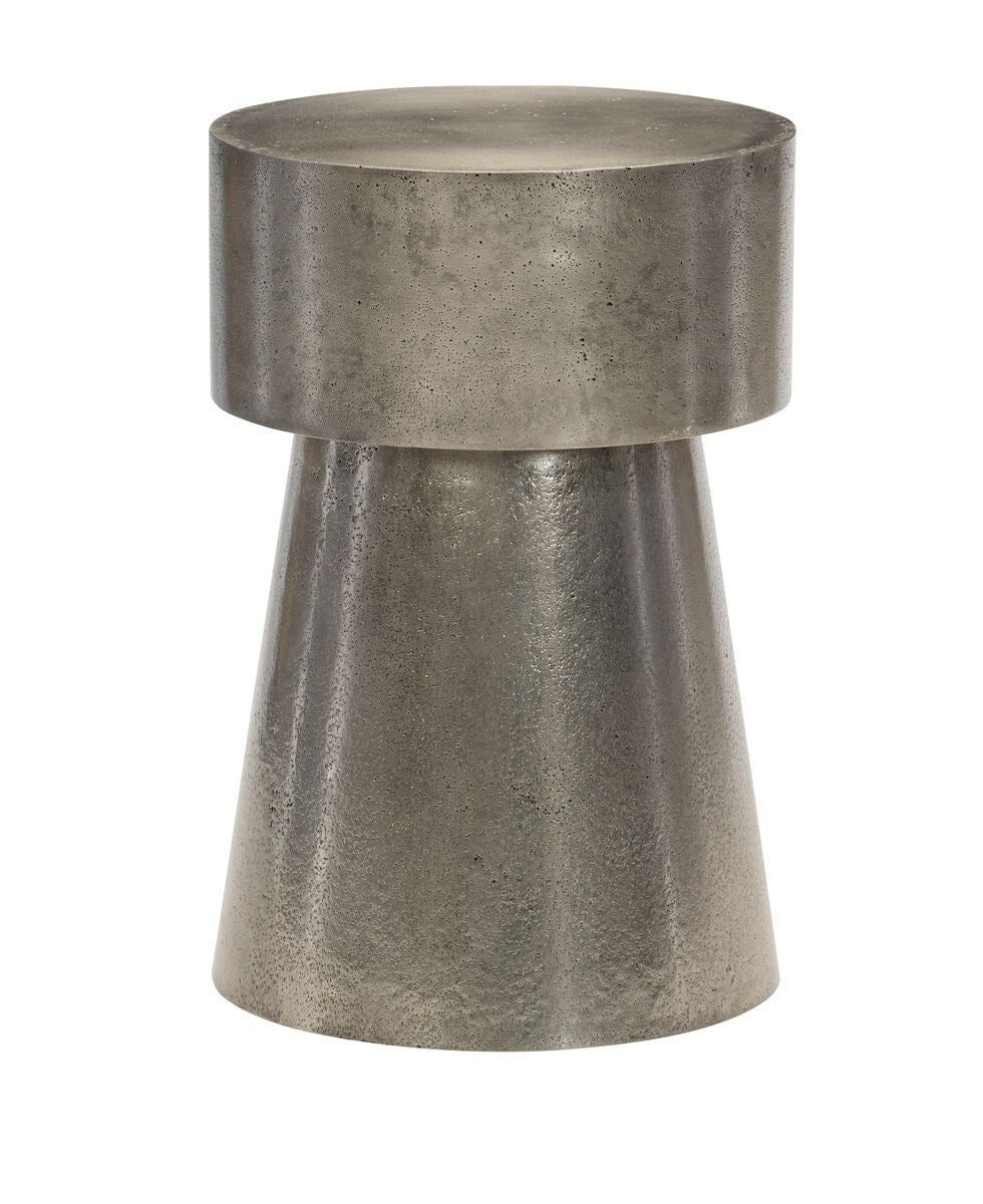 The Bernhardt Linea collection artfully blends the natural elements of rustic design with clean lines and casual but luxurious finishes. This chairside table features a plump round top resting on a cone-shaped base, making a statement with its bold geometric form. Wrapped in aluminum with a textured graphite finish, the table merges rustic warmth with modern style.