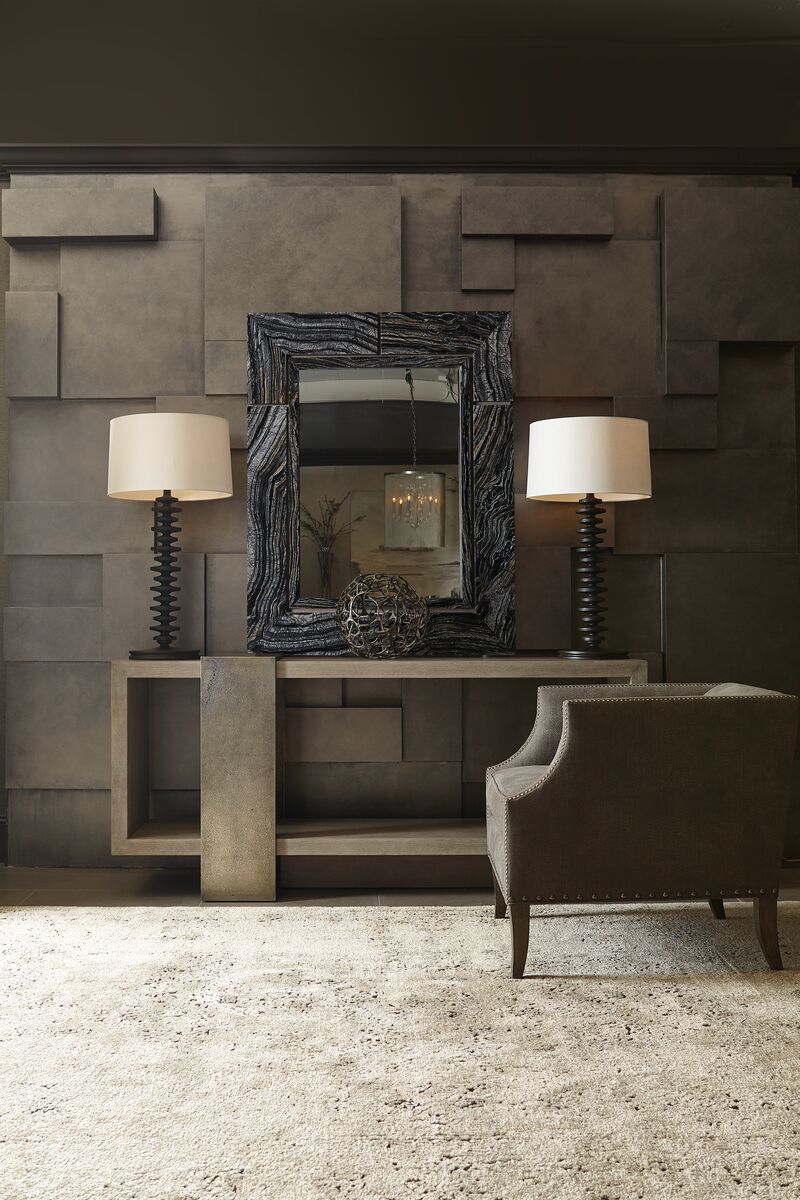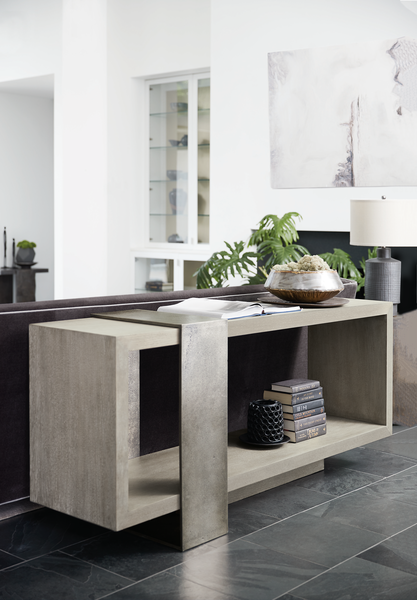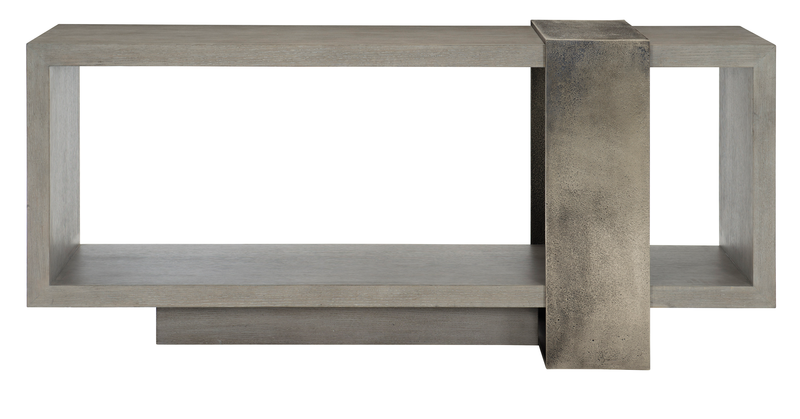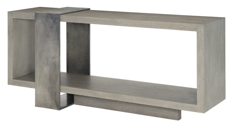 With an asymmetrical form and a unique mix of materials, the Linea console table achieves a singular look. The open case and plinth base feature wire-brushed oak veneers in a Cerused Greige finish. For a dramatic contrast, a heavily textured cast aluminum band wraps around the case. Composed of sleek lines and geometric shapes, this creative design pushes the boundaries of rustic modern style.