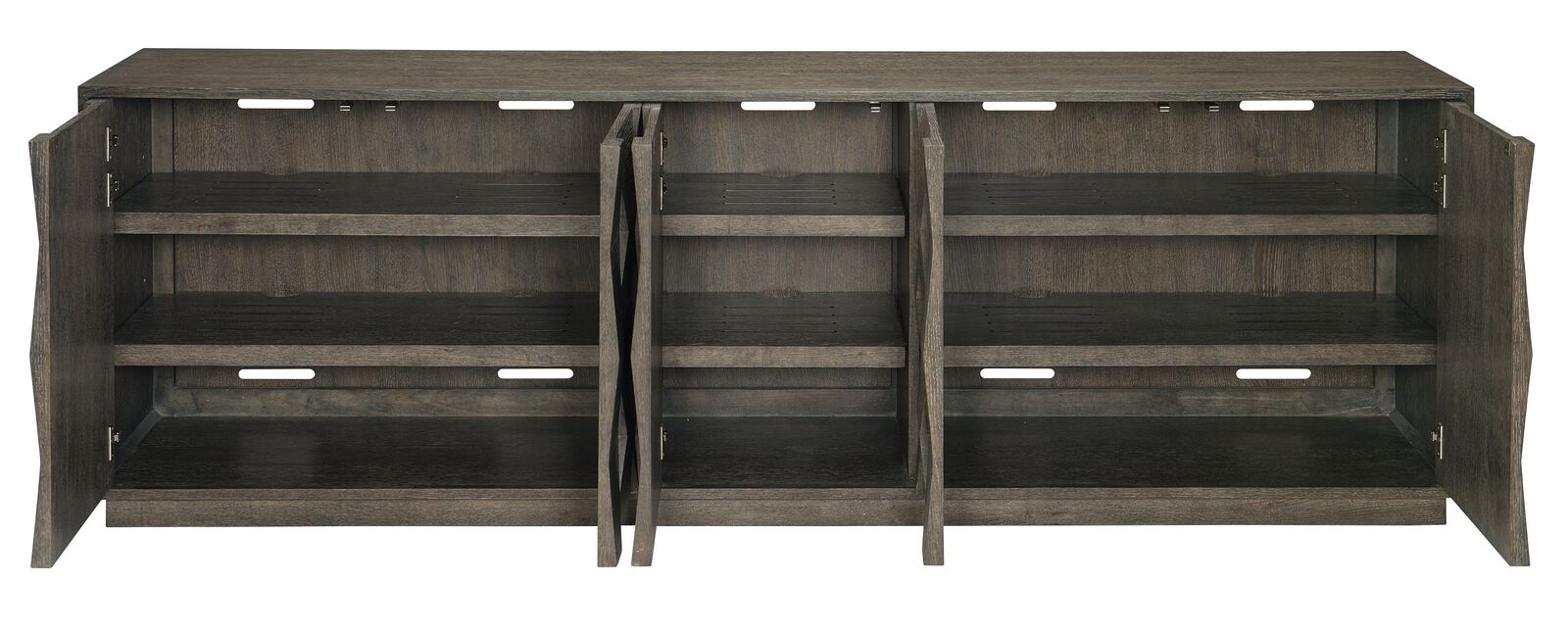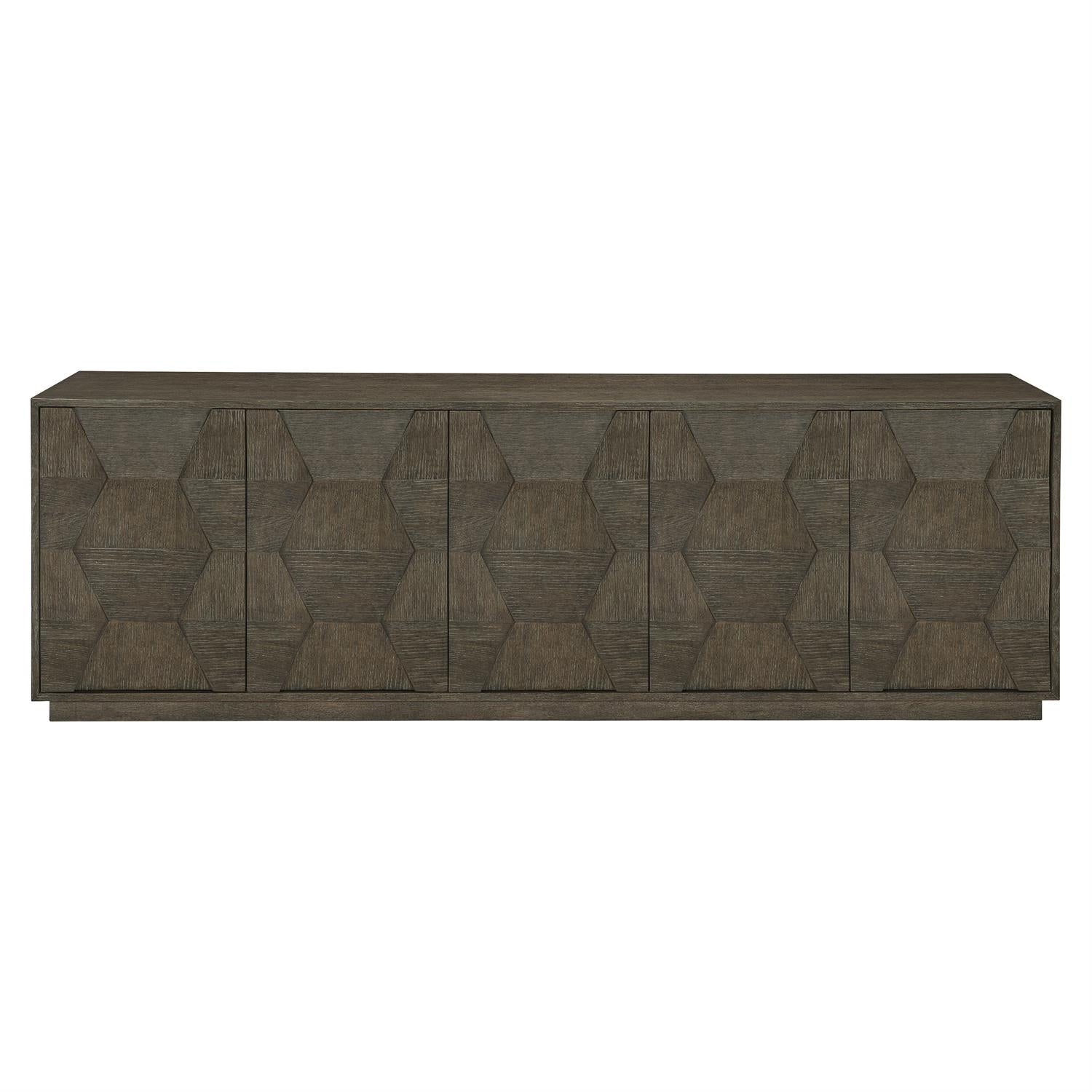 The Linea entertainment console merges form and function with flawless artistry. Wire-brushed oak veneers in a Cerused Charcoal finish offer subtle textures, while an eye-catching faceted veneer design adds dimension. The absence of hardware on the five push-to-open doors contributes to the clean, streamlined look. Behind the doors, adjustable, vented shelves provide organized space for storage. Grommet holes in the back panel are conveniently positioned for wires or cables.