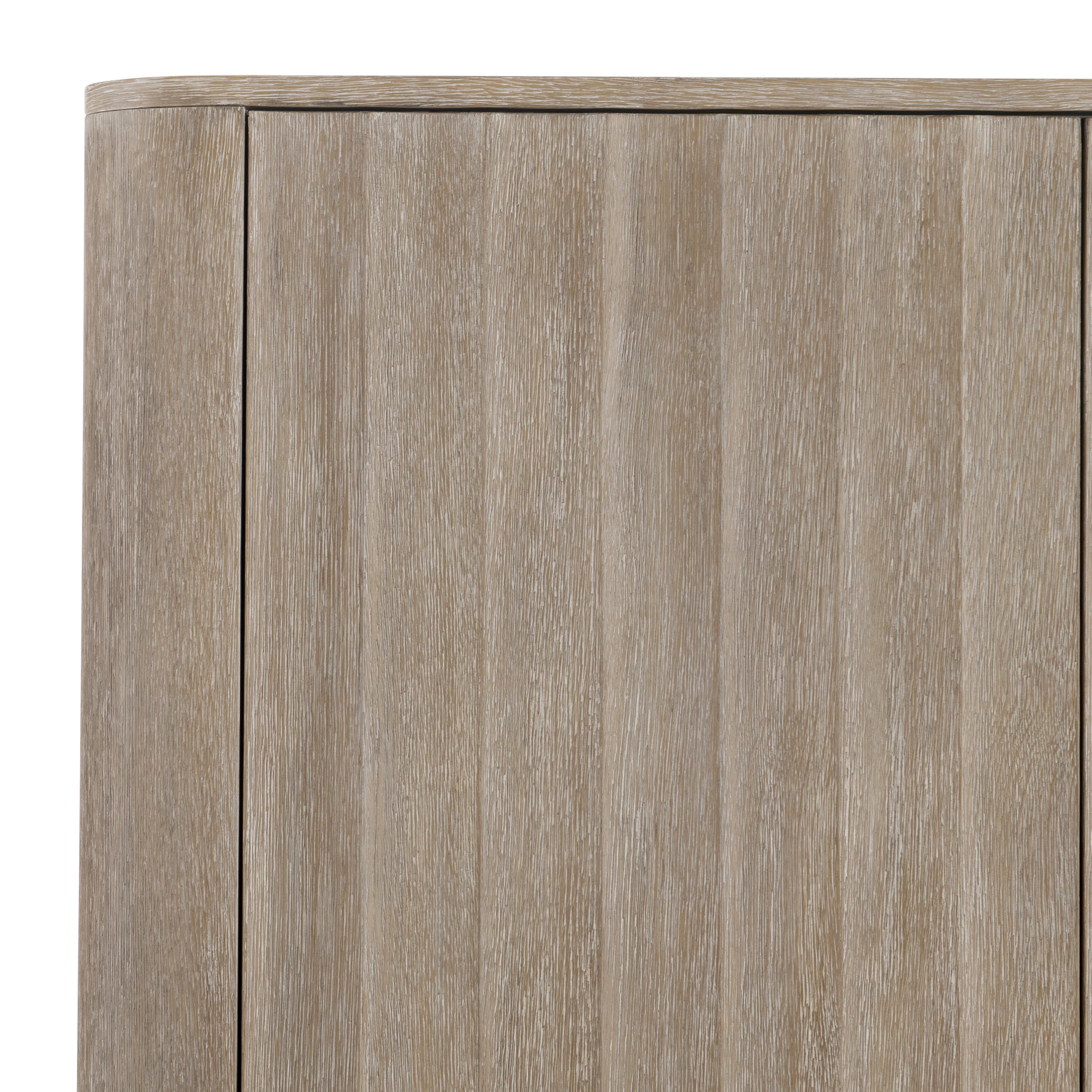 Curves and planes create a master play of light and shadow on the Loggia bar cabinet. Fluting marks the two doors while the base showcases a concave curve. The doors open to reveal lights, a mirrored back panel, bottle storage and two drawers.