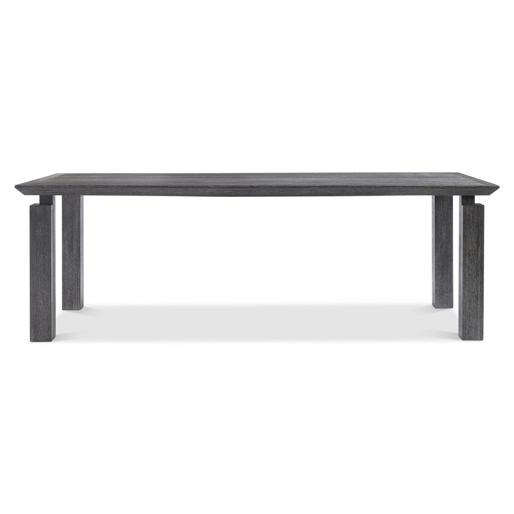 Modern architecture is the inspiration behind the bold design of the Menton dining table. The sleek beveled top appears to float above bold structural legs that anchor each corner. The beautiful woodgrain is highlighted by the deeply stunning Sutton finish.