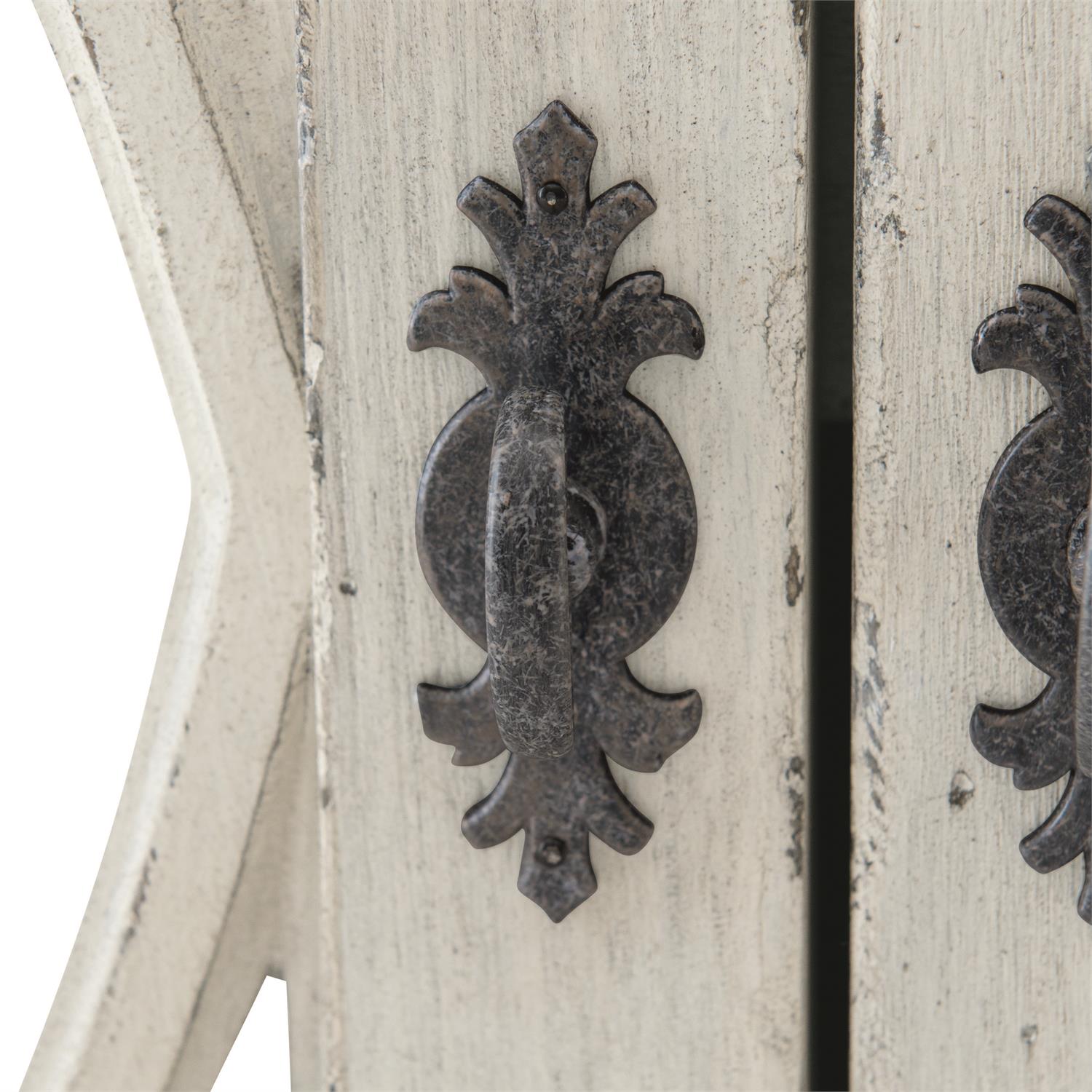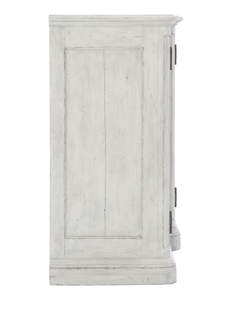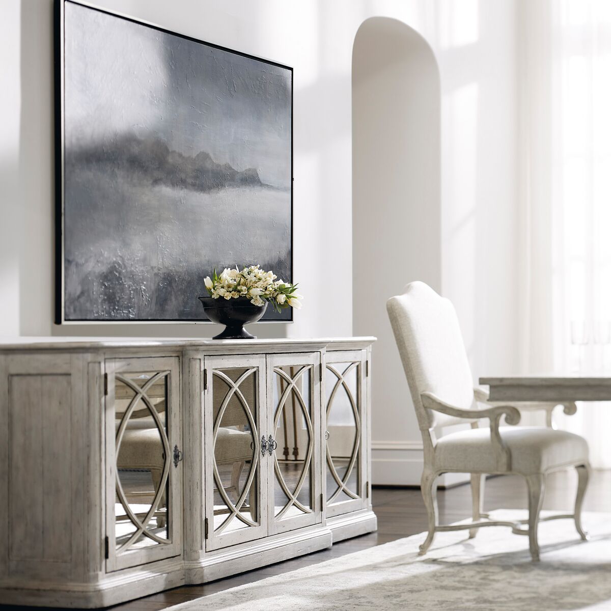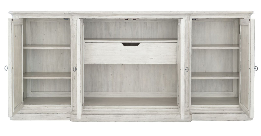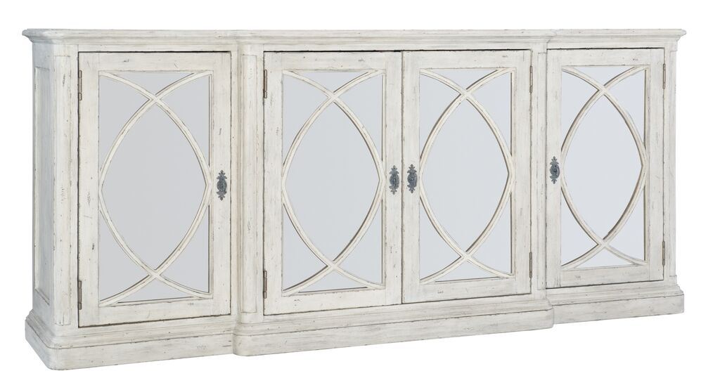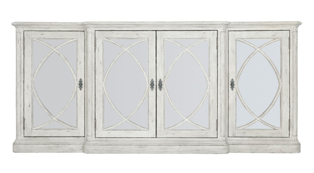Cotton Finish. Four Doors With Cast Grille Over Inset Antiqued Mirrored Glass Panel. Behind End Doors Are Two Adjustable Removable Shelves And Bottom Shelf Surface. Behind Paired Center Doors Is One Fixed Shelf, One Drawer With Wrapped Pad And Hand Cut-Out, And Bottom Shelf Surface. Adjustable Glides.