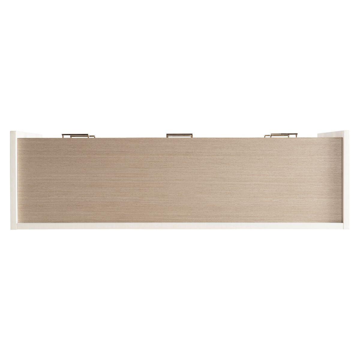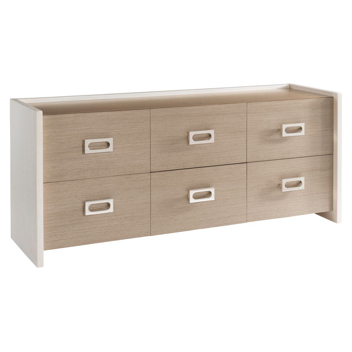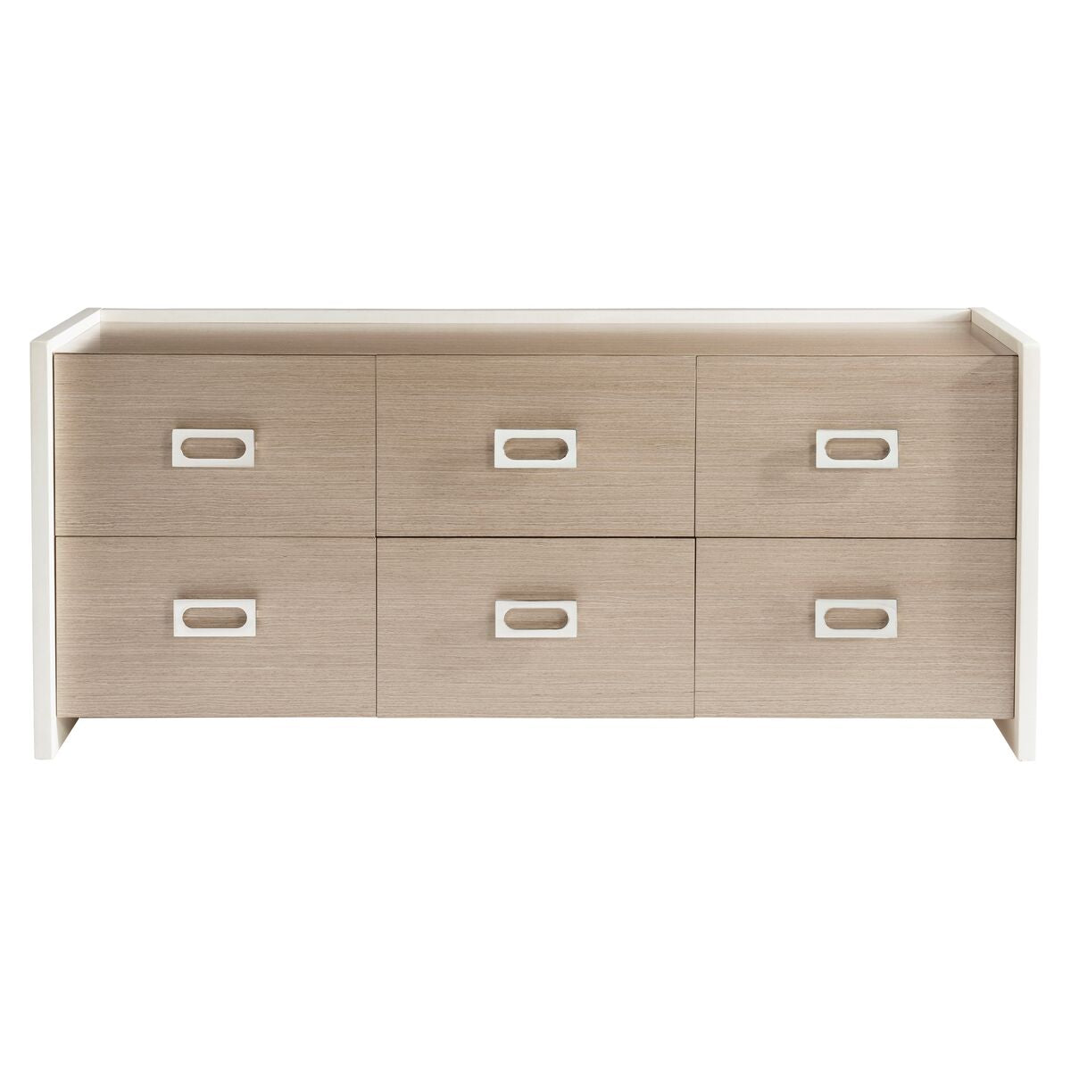 Dresser With Gallery Rail Around Back And Sides. Six Soft-Close Drawers With Metal Pulls. Sahara Finish On Top And Drawers. Adobe Finish On End Panels And Gallery. Adjustable Glides.