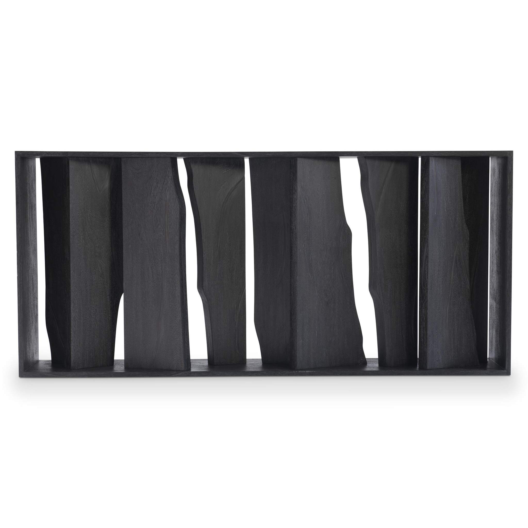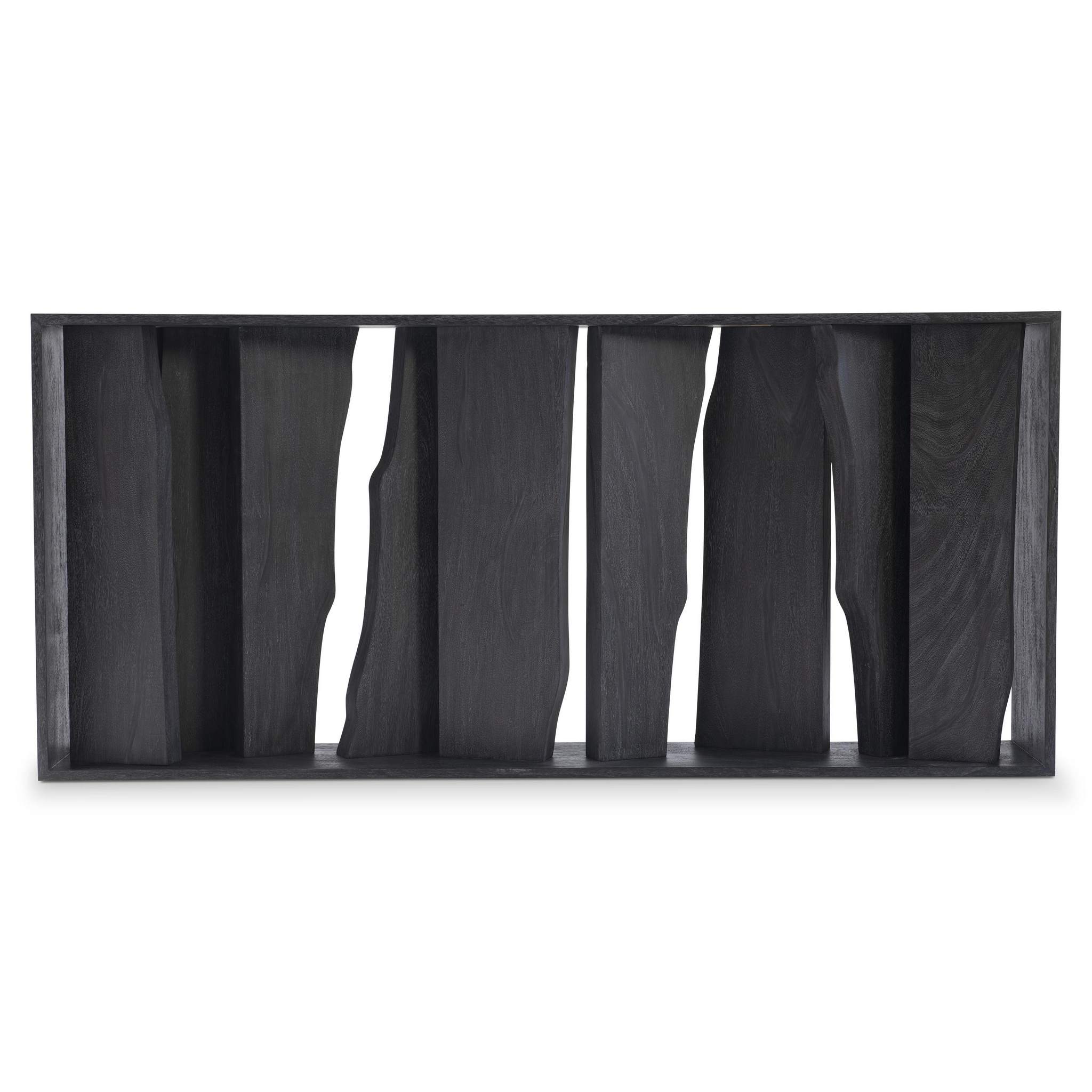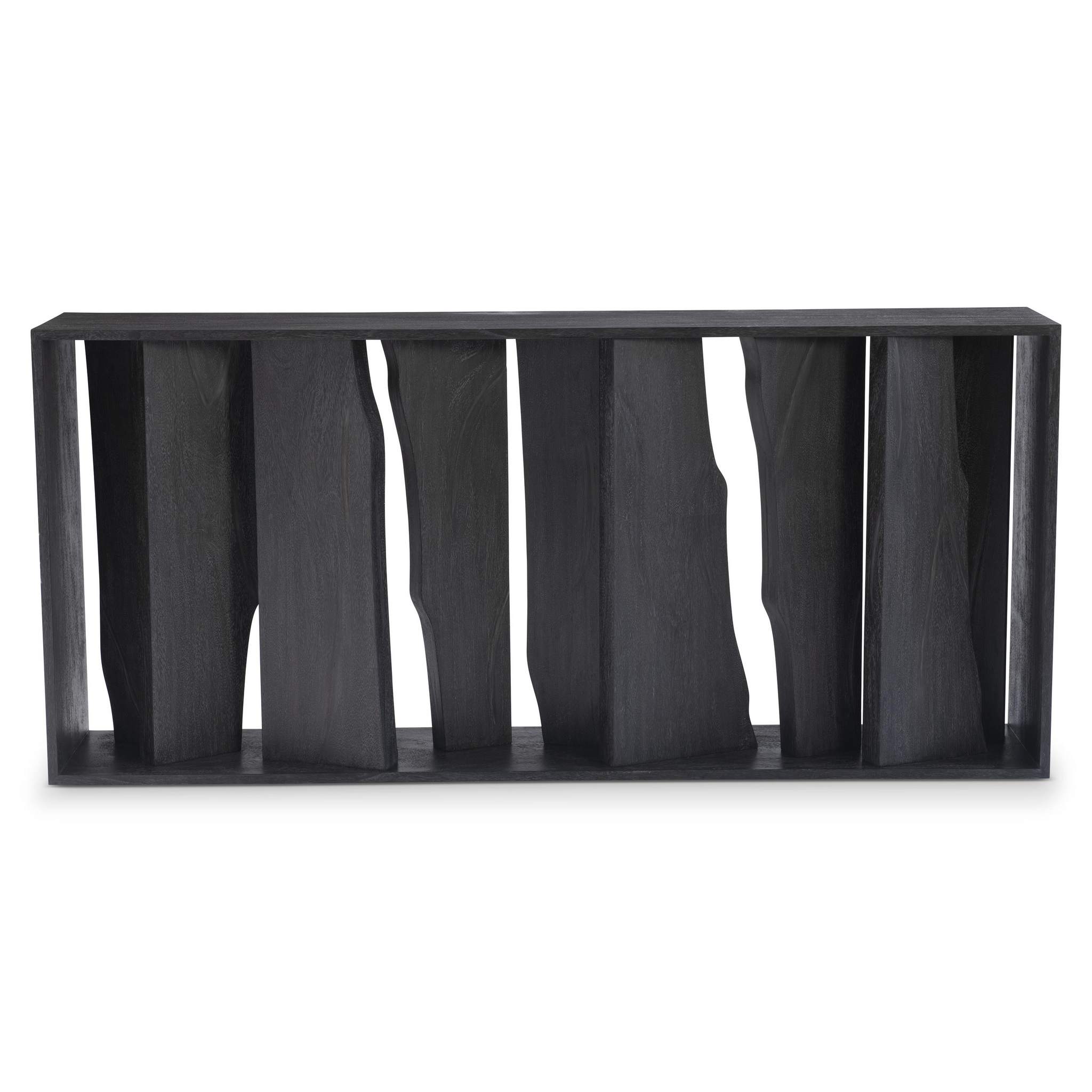 An elemental style crafts a unique table design for the Neff console. Nine organic shapes placed randomly within a frame create a mirage of light through the trees. The suar wood table is finished in a dark Flint Grey.