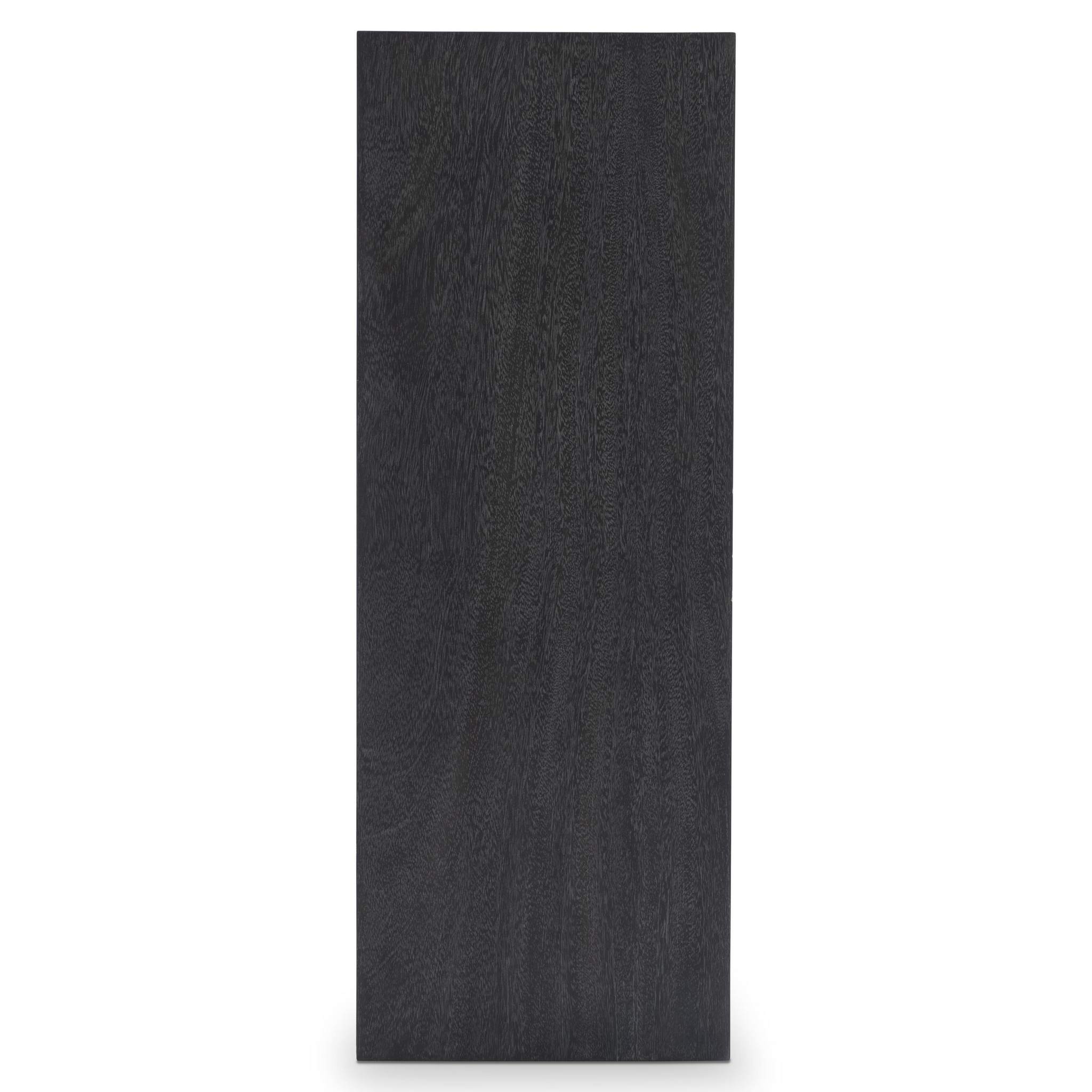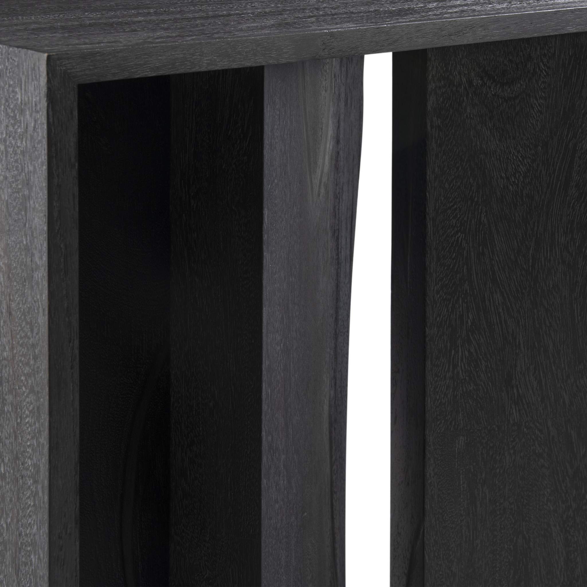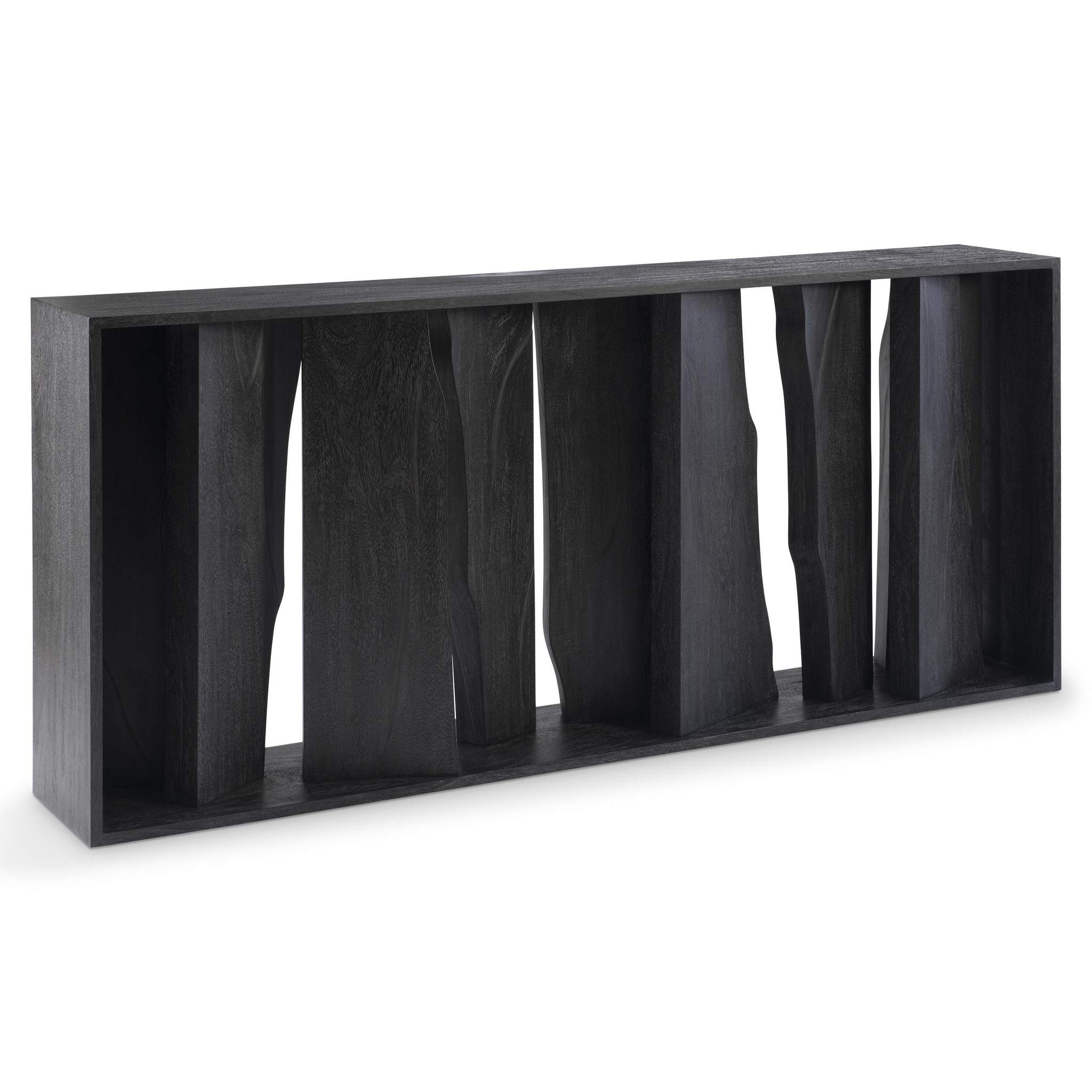 An elemental style crafts a unique table design for the Neff console. Nine organic shapes placed randomly within a frame create a mirage of light through the trees. The suar wood table is finished in a dark Flint Grey.