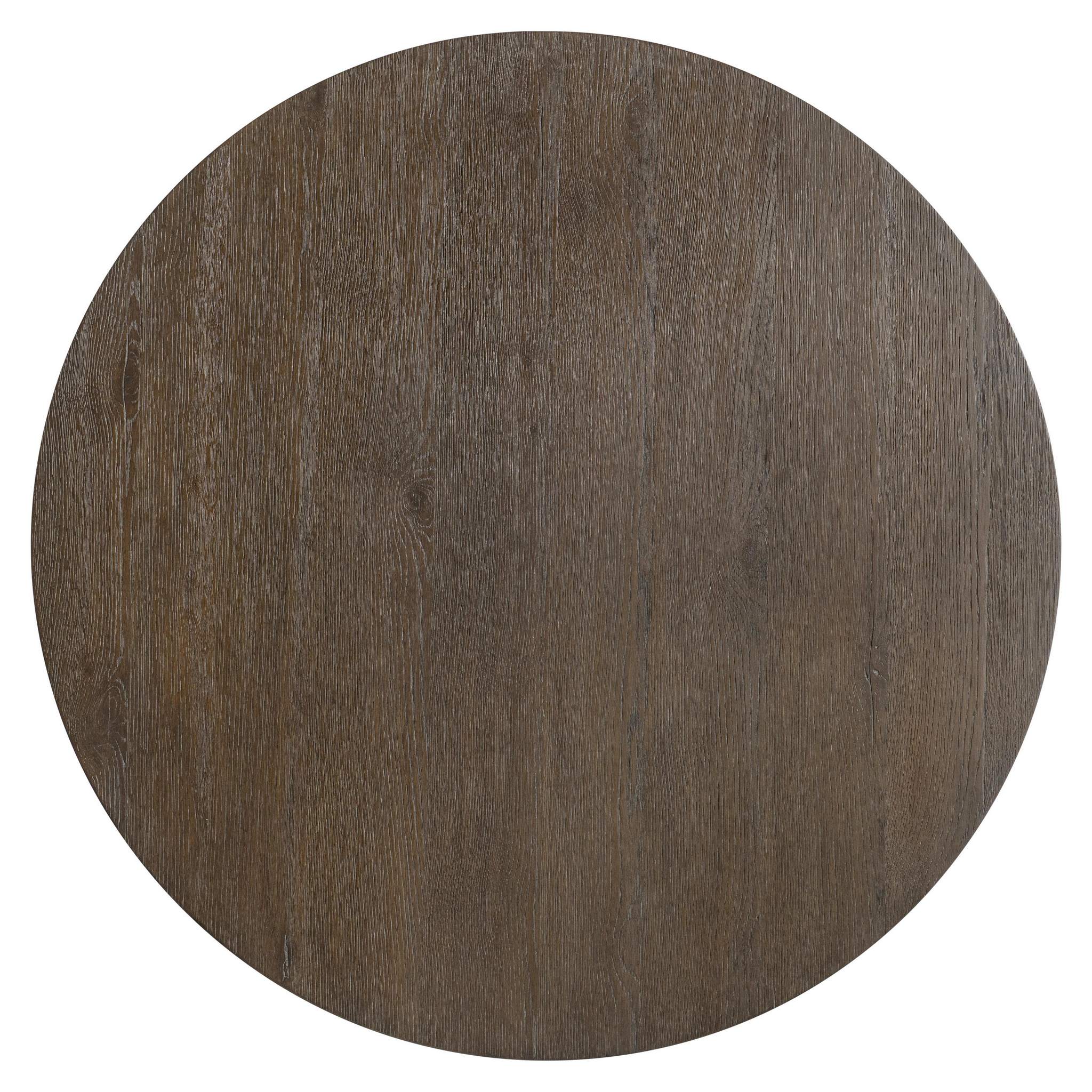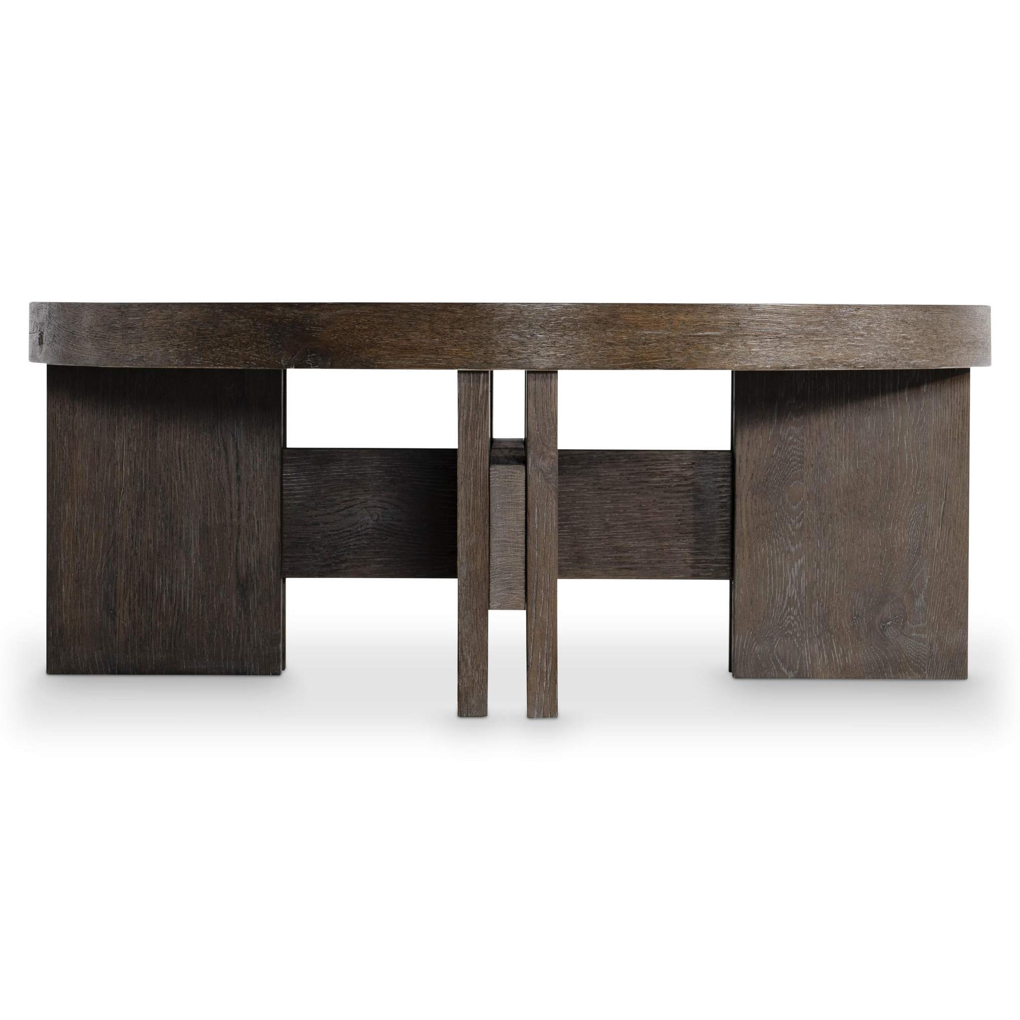 Inspired by the architectural style of Frank Lloyd Wright, the Outline cocktail table highlights the bold forms and simple lines of the Arts and Crafts movement. Deeply textured wood finished in Cassel is fashioned into geometric shapes that showcase craftsmanship. Rectilinear panels bisect for the base, supporting a bold round top.