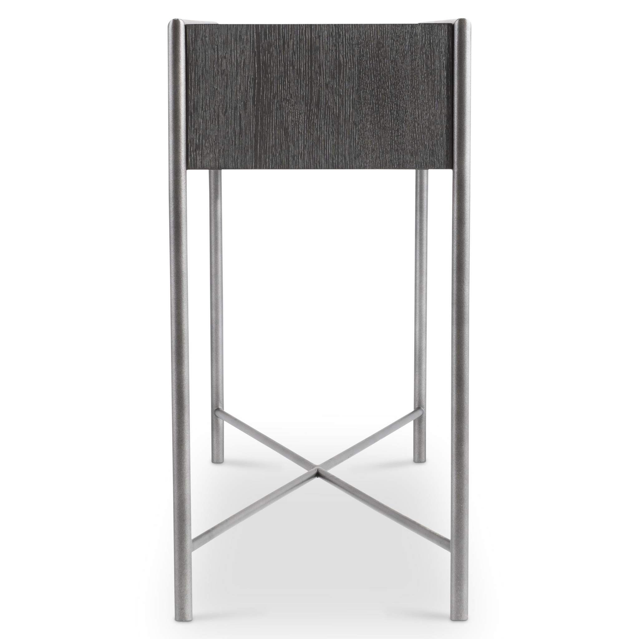 The Outline console table has a distinctive design that features a metal frame that wraps around the wooden table top. The metal finished in Atra extends to the floor and crosses to create a sleek stretcher. The look is casual yet refined with a minimalist style.