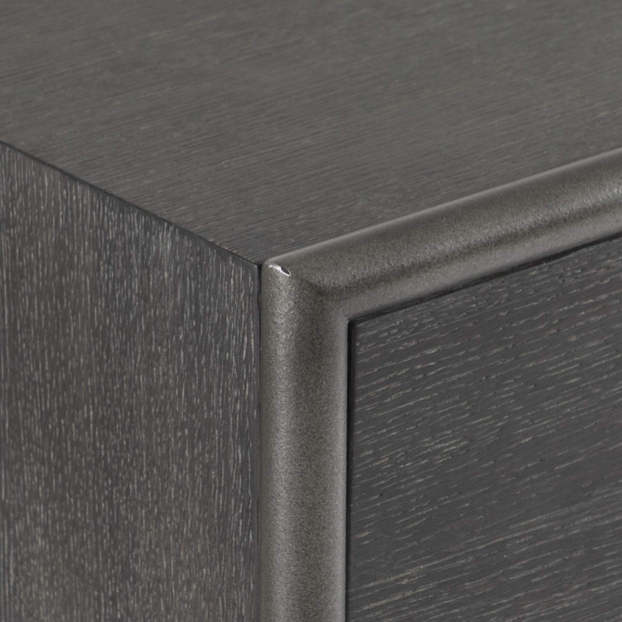 Wire-brushed oak in Kohl finish with applied textured steel base in Atra finish