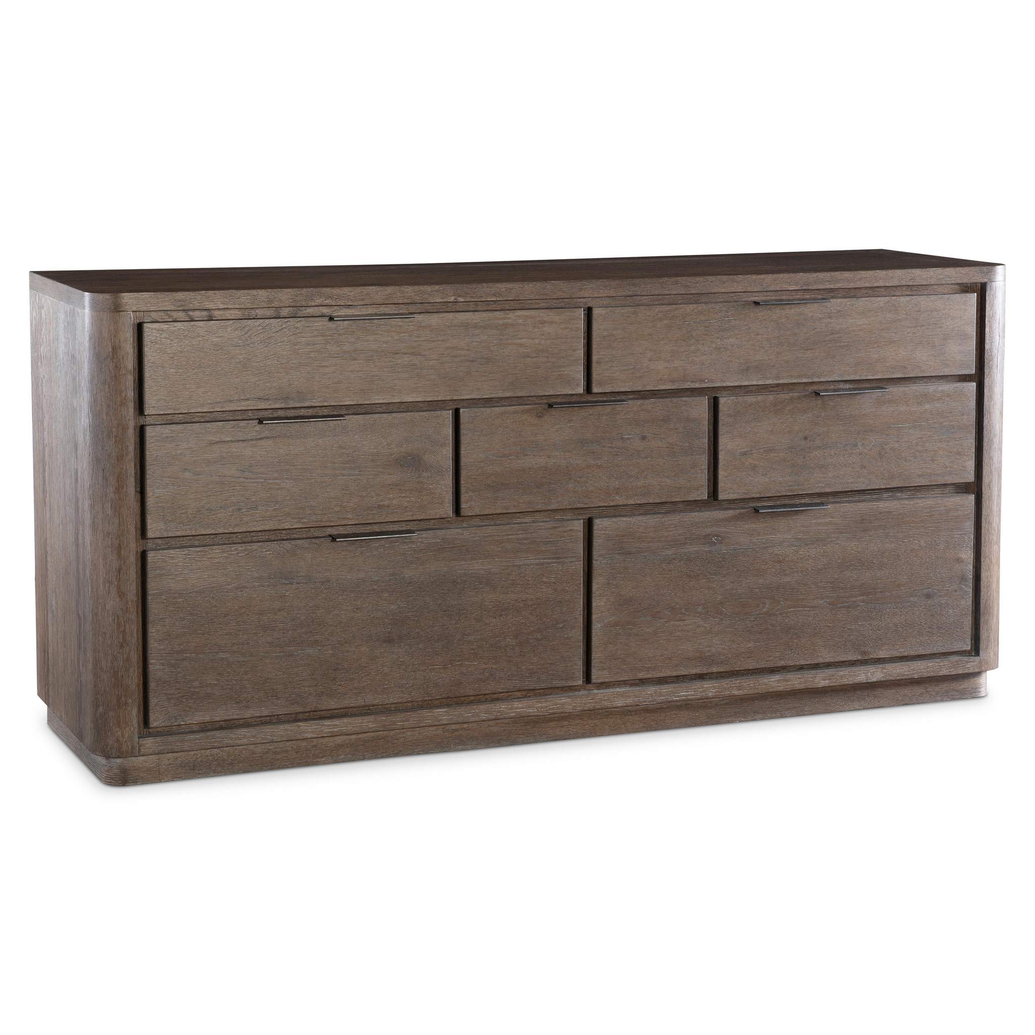 Recessed detailing defines seven drawers on the Outline dresser. Three drawer sizes create a geometric visual style, while natural wood grain and metal pulls balance an organic look. The design, resting on a plinth base, is finished in Cassel.