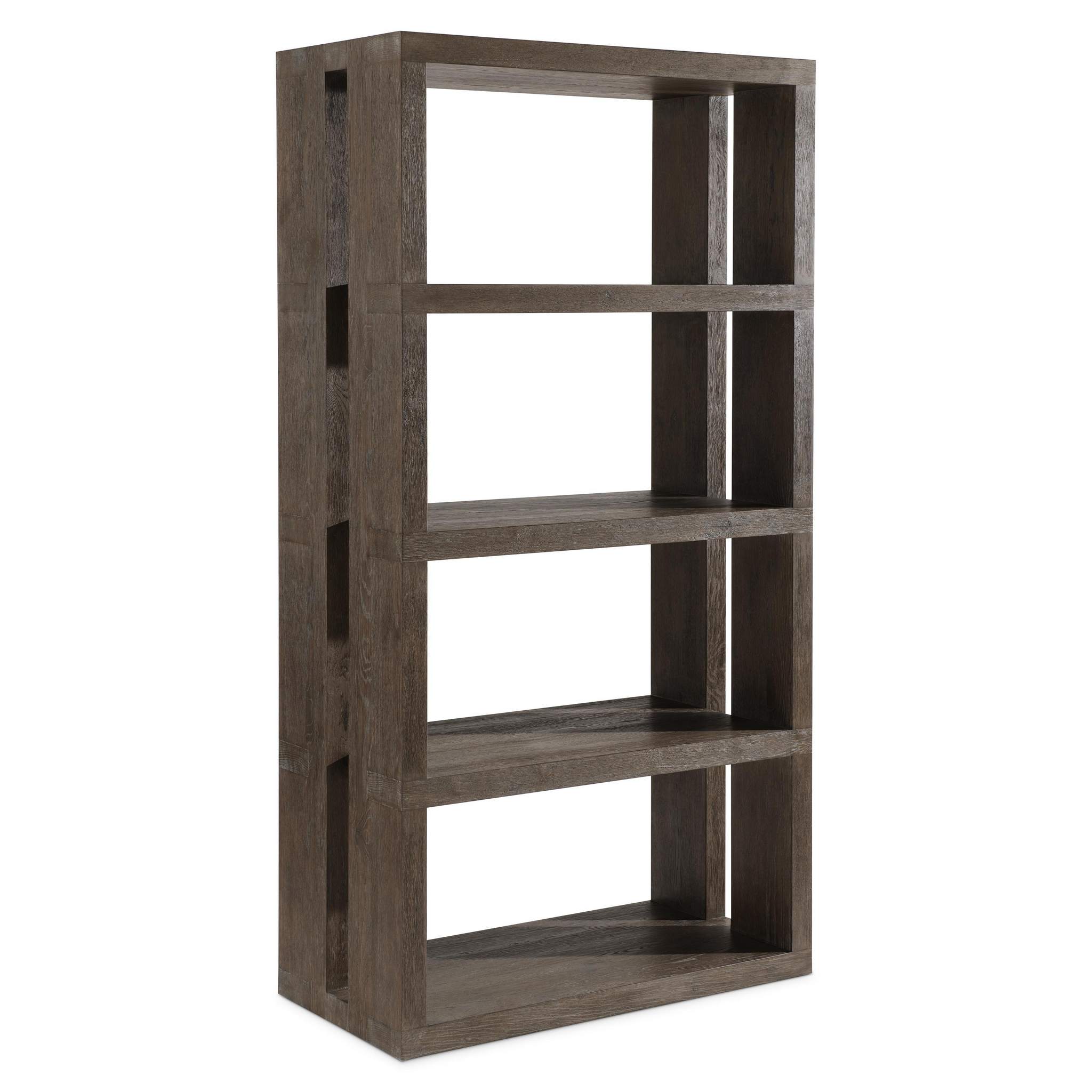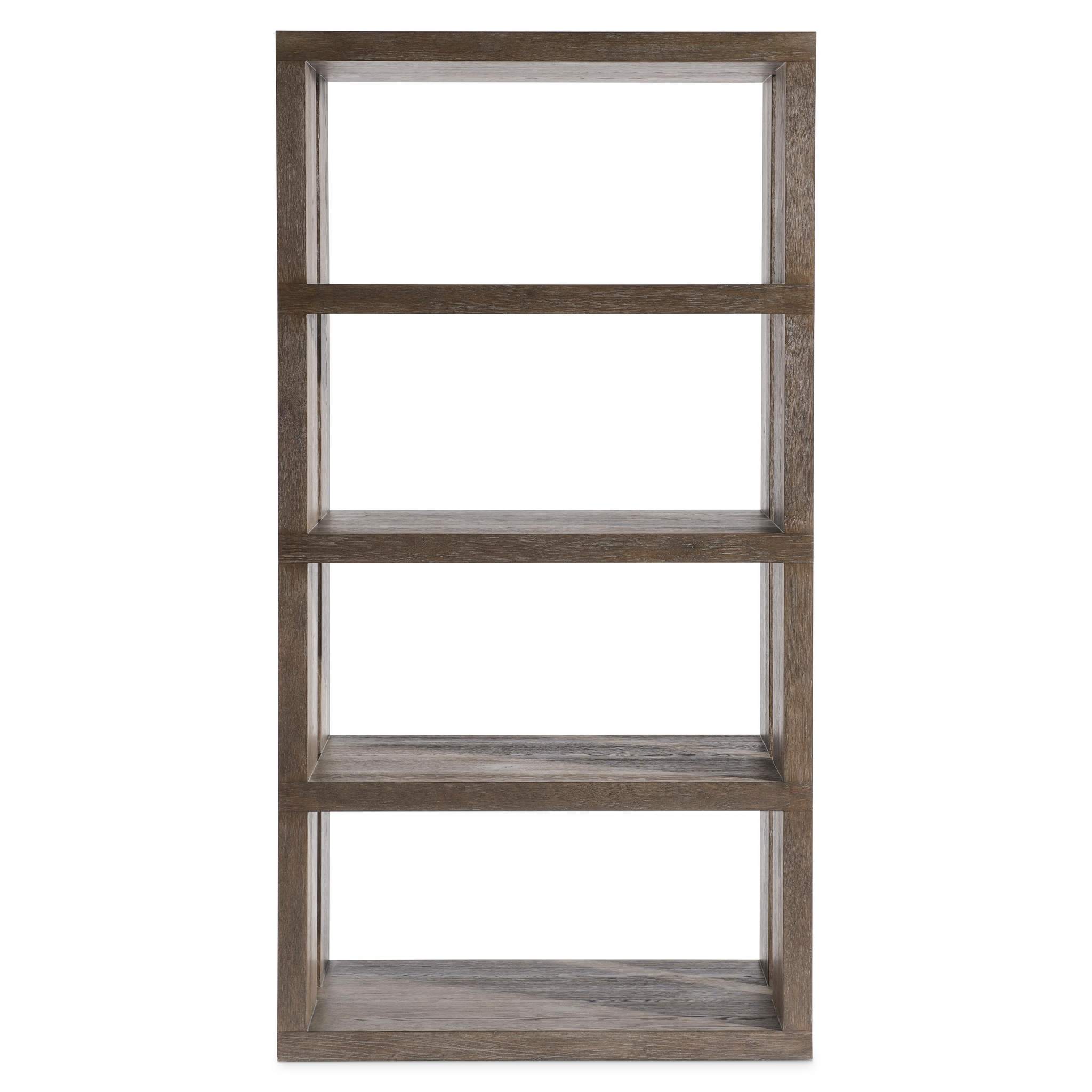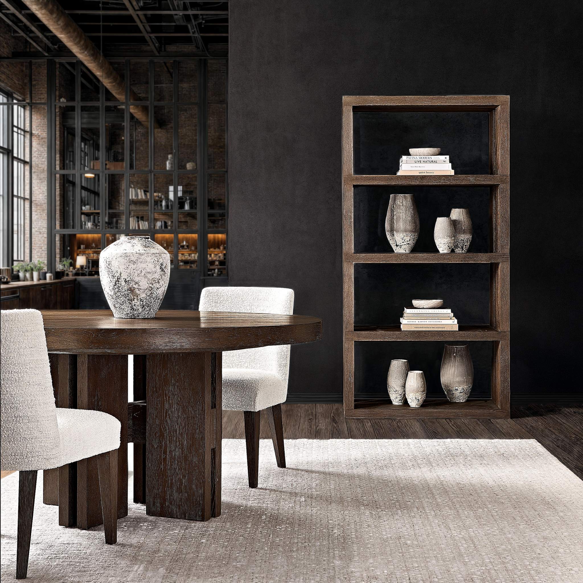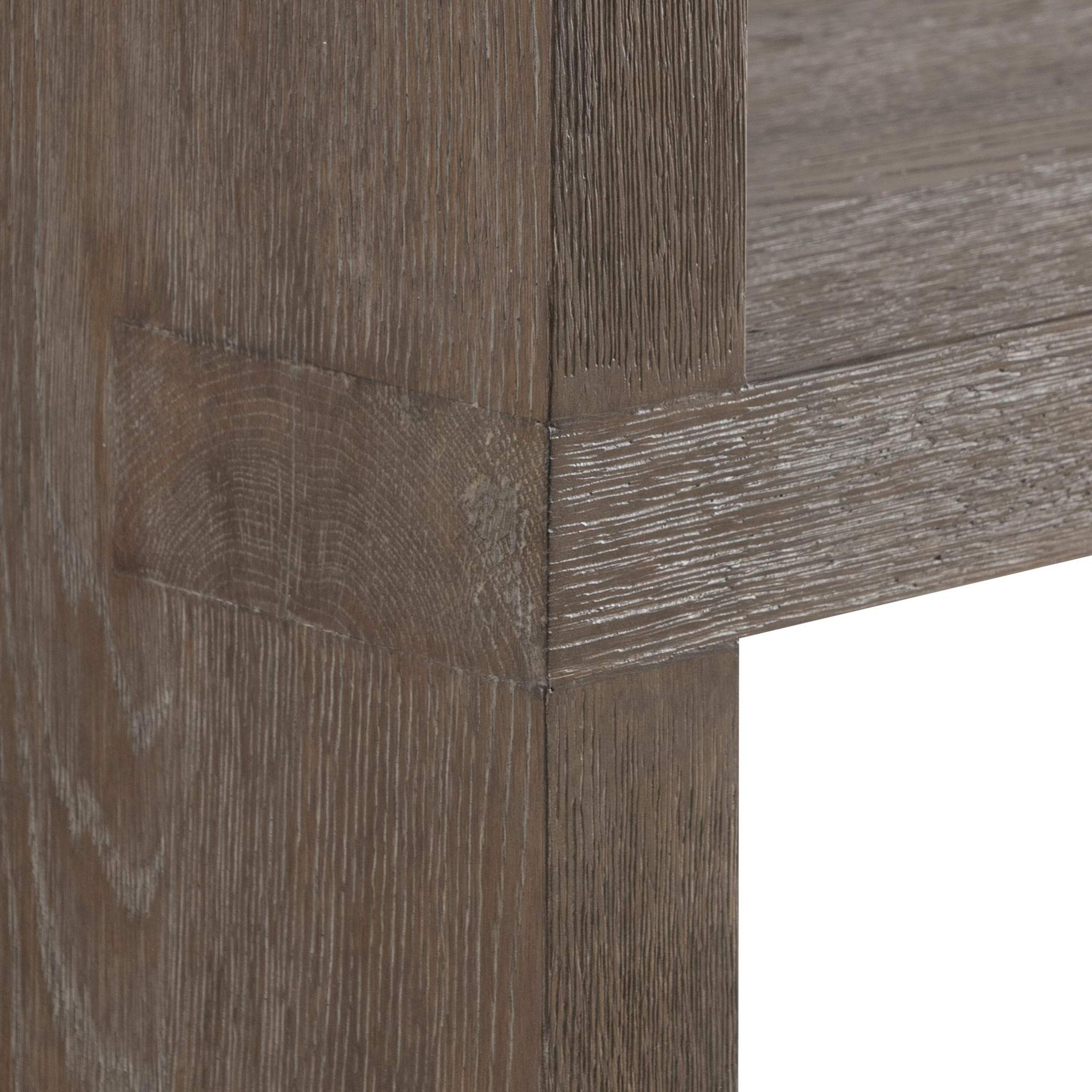Inspired by the architectural style of Frank Lloyd Wright, the Outline etagere highlights the bold forms and simple lines of the Arts and Crafts movement. Deeply textured wood finished in Cassel is fashioned into geometric shapes that showcase craftsmanship. Rectilinear panels bisect with open sections at each end.