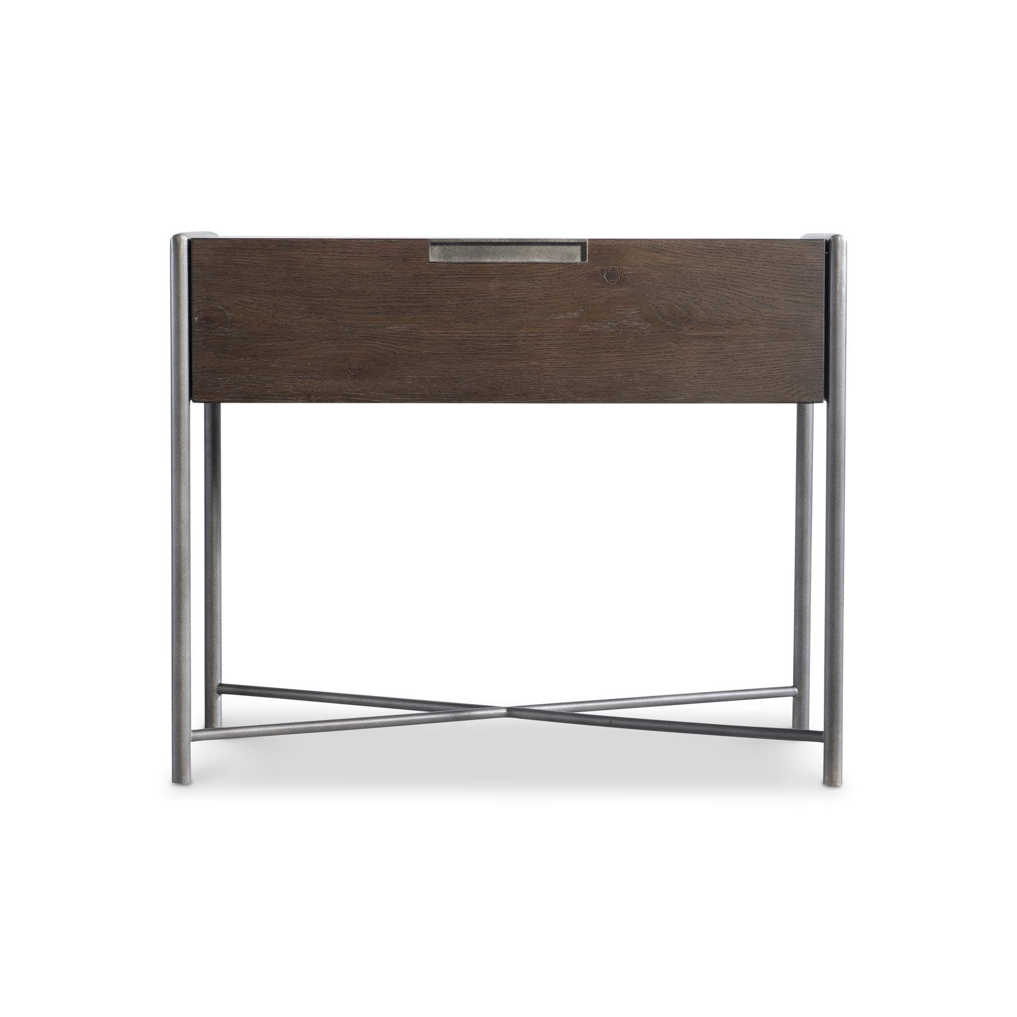The Outline nightstand has a distinctive design that features a metal frame that wraps around the wooden top. The metal finished in Atra extends to the floor and crosses to create a sleek stretcher. The single drawer has a recessed metal pull tab.