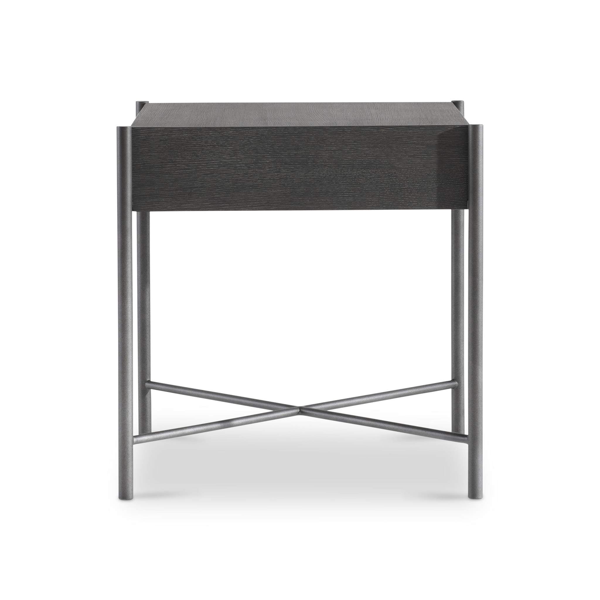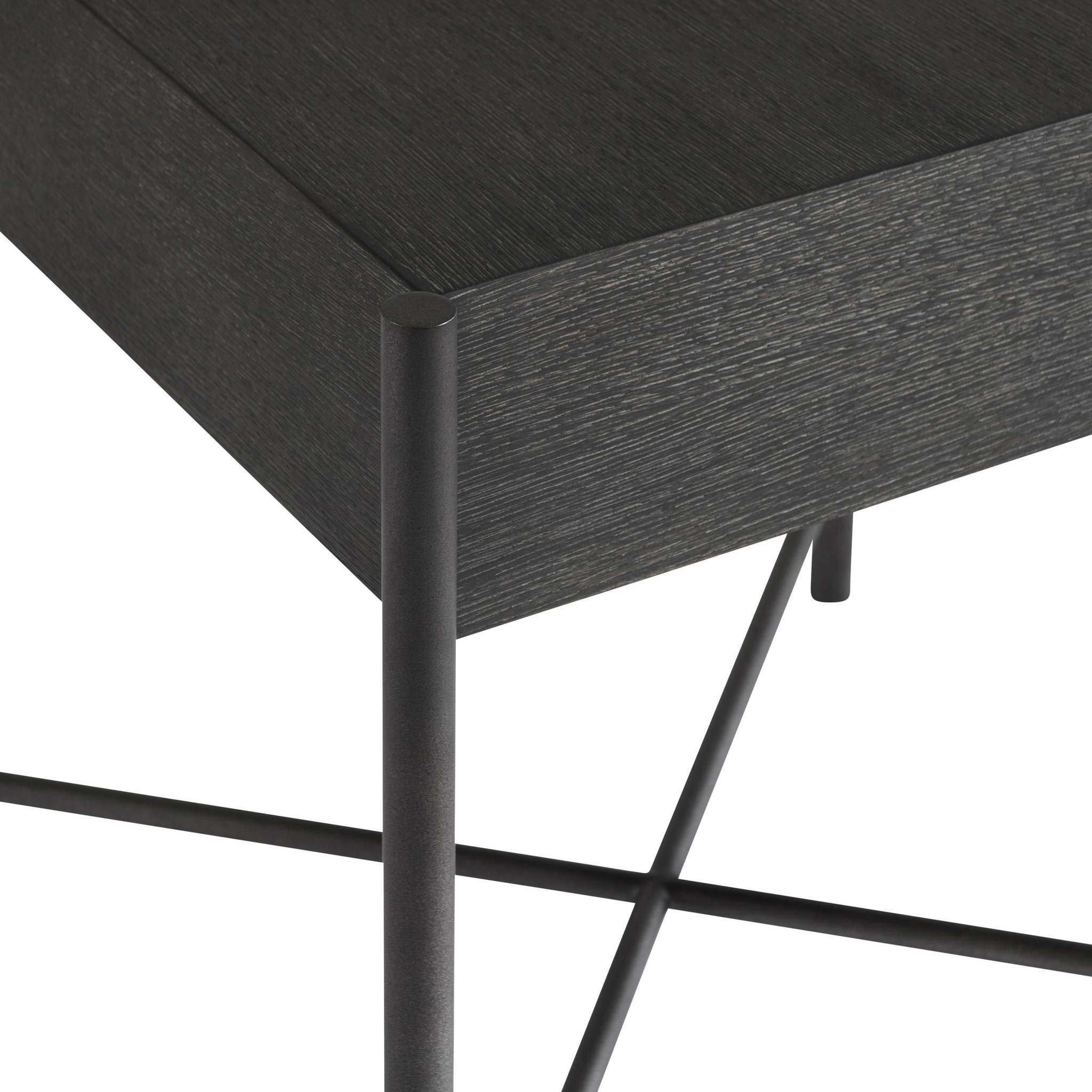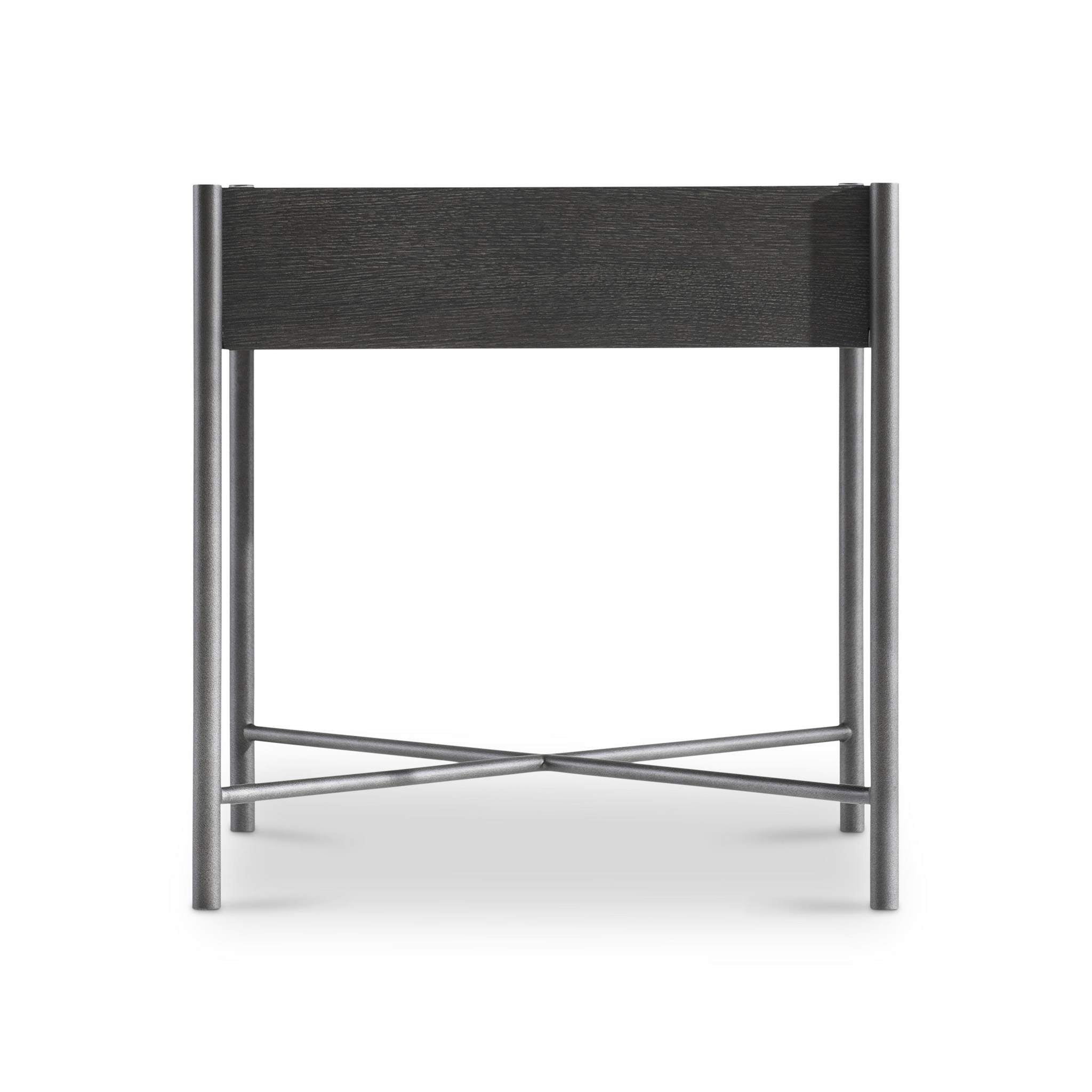 The Outline side table has a sleek metal frame that includes slim pillars that support each corner. The top appears to float above the x-shaped stretcher, giving a lightness to the solid form. The wood is finished in a deep Kohl while the metal glows in Atra.