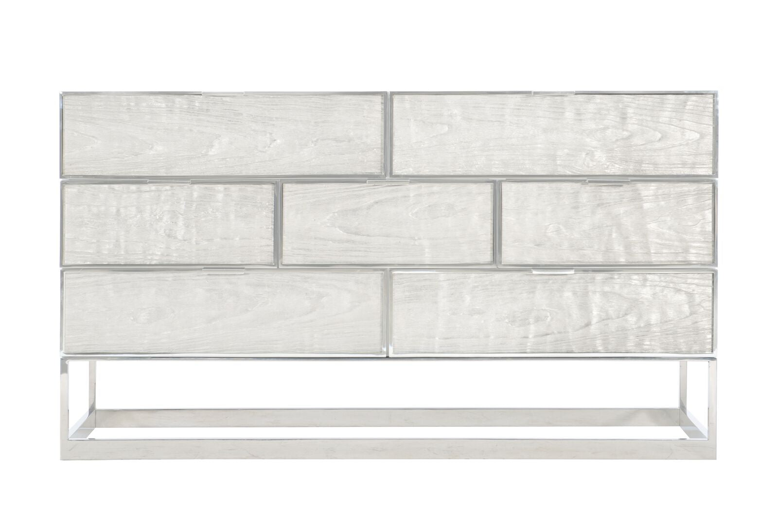 Maple Veneers In High Sheen White Lacquer Finish. Polished Stainless Steel Frame Around Drawers. Two Drawers With Inset Acrylic Fronts With Faux Wood Grain Plank Look And Metal Finger Pulls. Tubular Polished Stainless Steel Base With Adjustable Glides.
