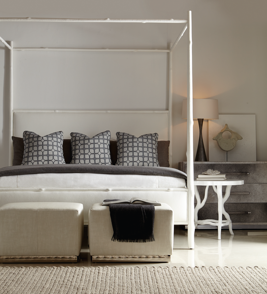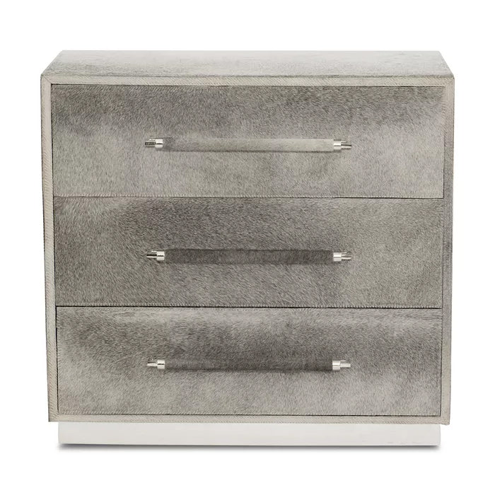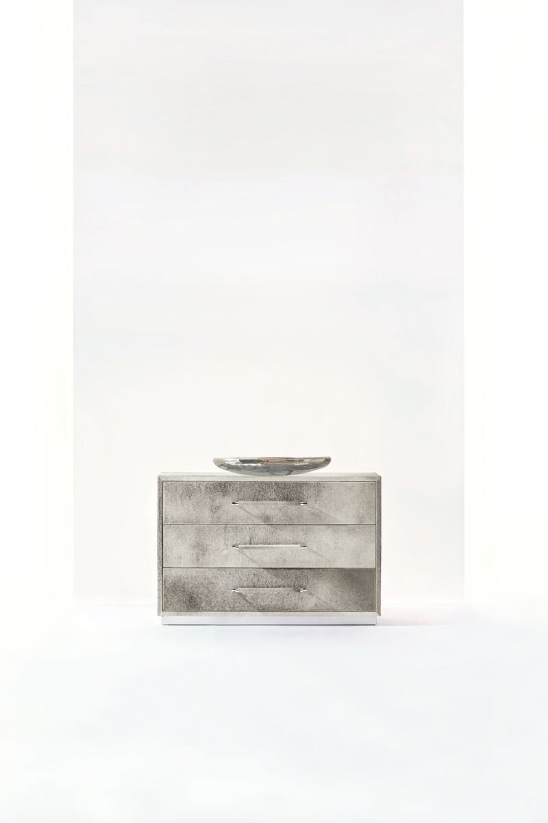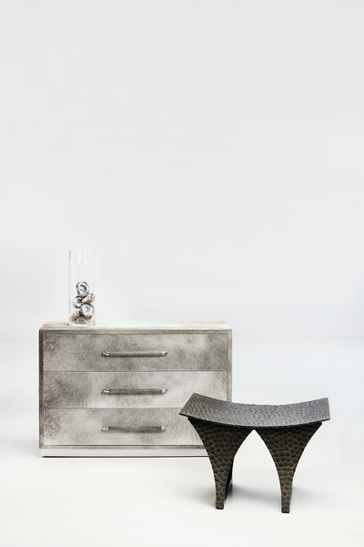 Bernhardt Interiors offers high-design furniture with an eclectic edge. Wrapped in gray hair-on-hide, the Parkin drawer chest abounds with texture and natural appeal. Saddle stitching draws attention to the fine craftsmanship, while a white painted interior and white felt lining in the three drawers contribute to the unique character of the piece. A polished stainless steel plinth base adds shine to this modern luxe look.